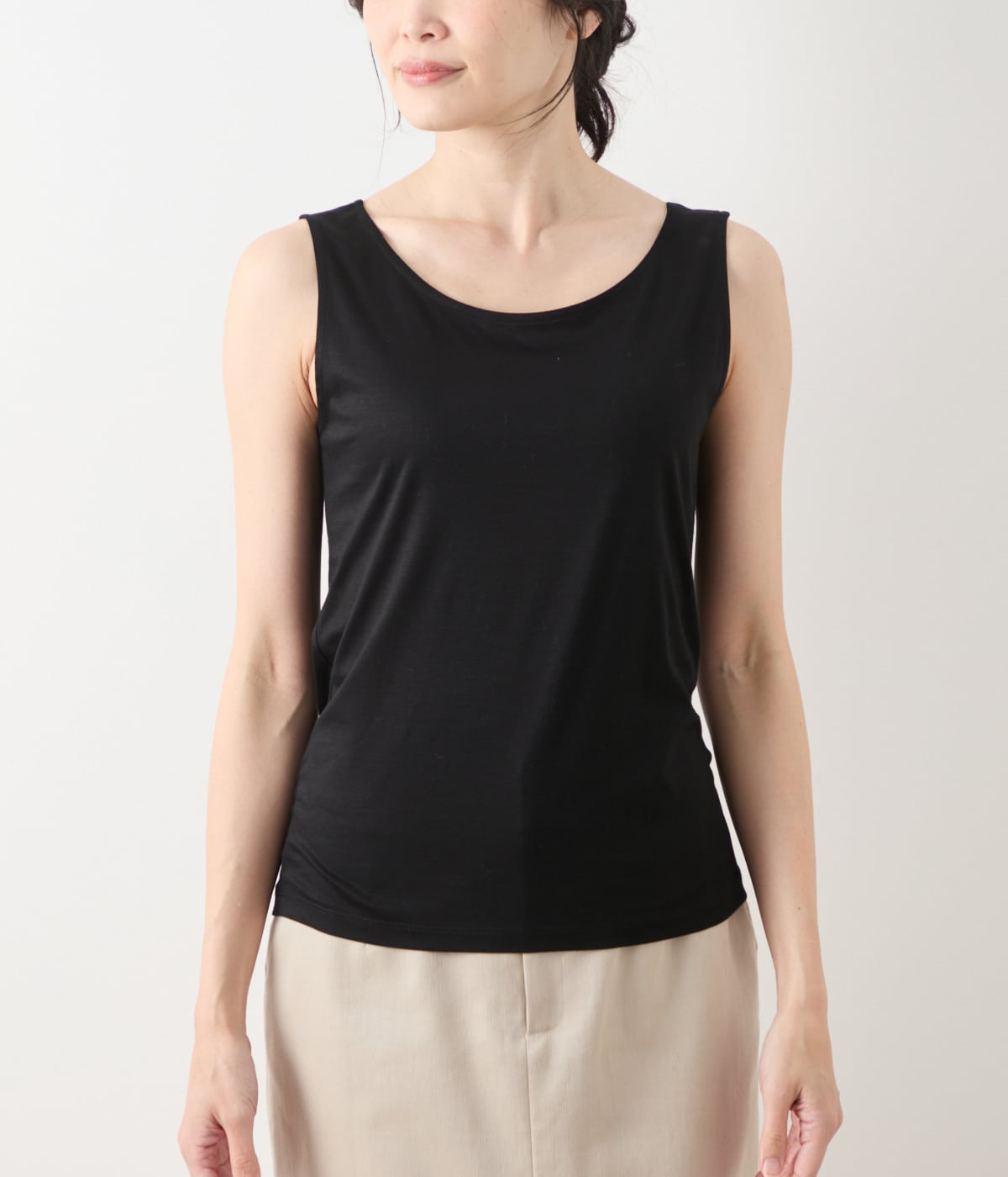 シンプルで着回しやすい、クルーネックのタンクトップ。重ね着をした際にも襟ぐりやアームホールの始末が表に響かないよう、ステッチのみが表に出る仕立てを採用し、凹凸を抑えたきれいな見え感に仕上げました。