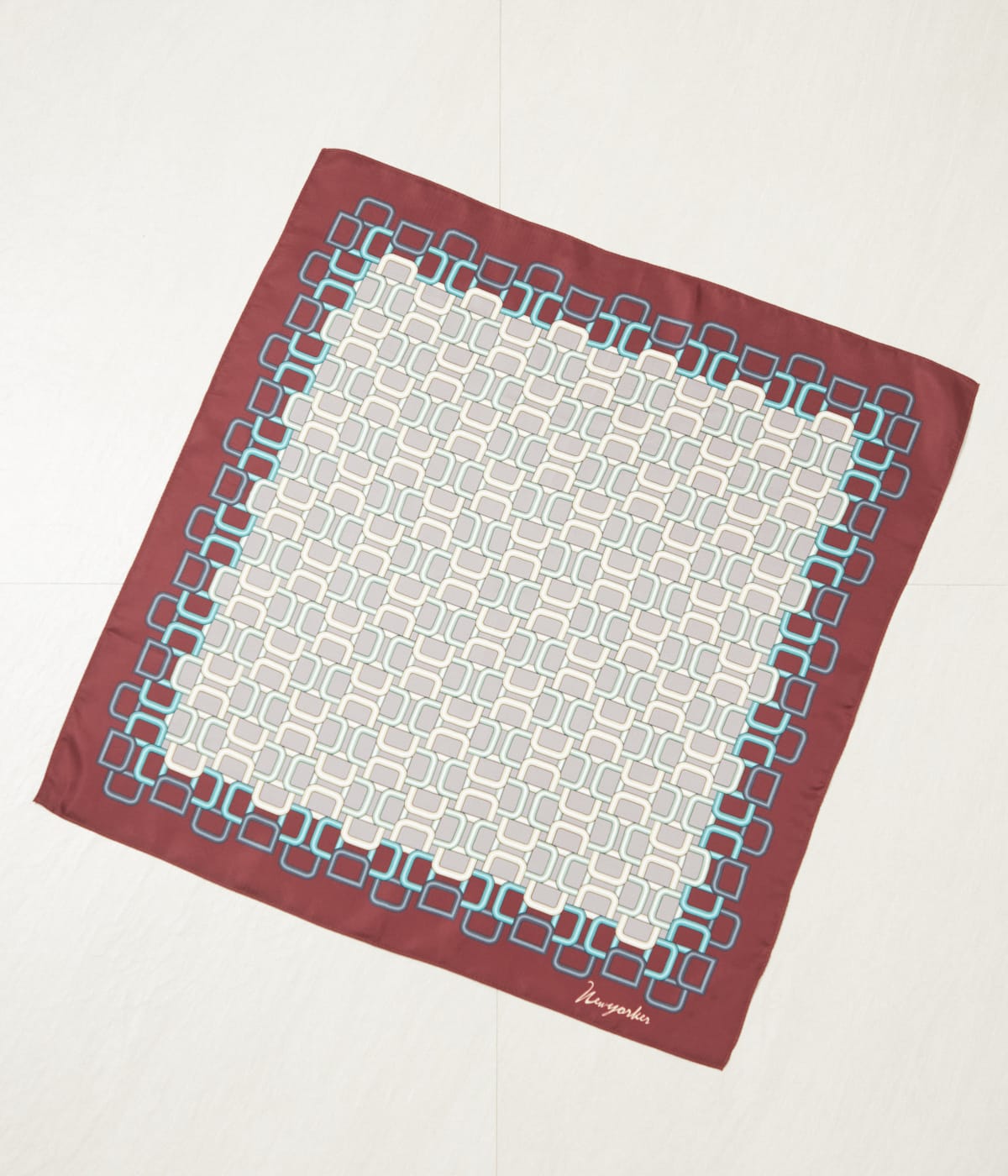 なめらかな風合いのシルク100%素材。ベルトのバックルなどに用いられるDカンをモチーフにした、直線と曲線の連続が表情豊かな幾何学柄をプリントしました。縁にはワンポイントでNewyorkerの筆記体ロゴを入れ、さりげなくオリジナリティを加えています。