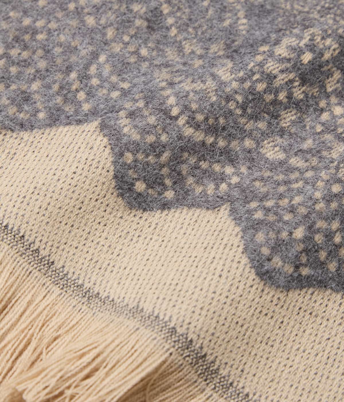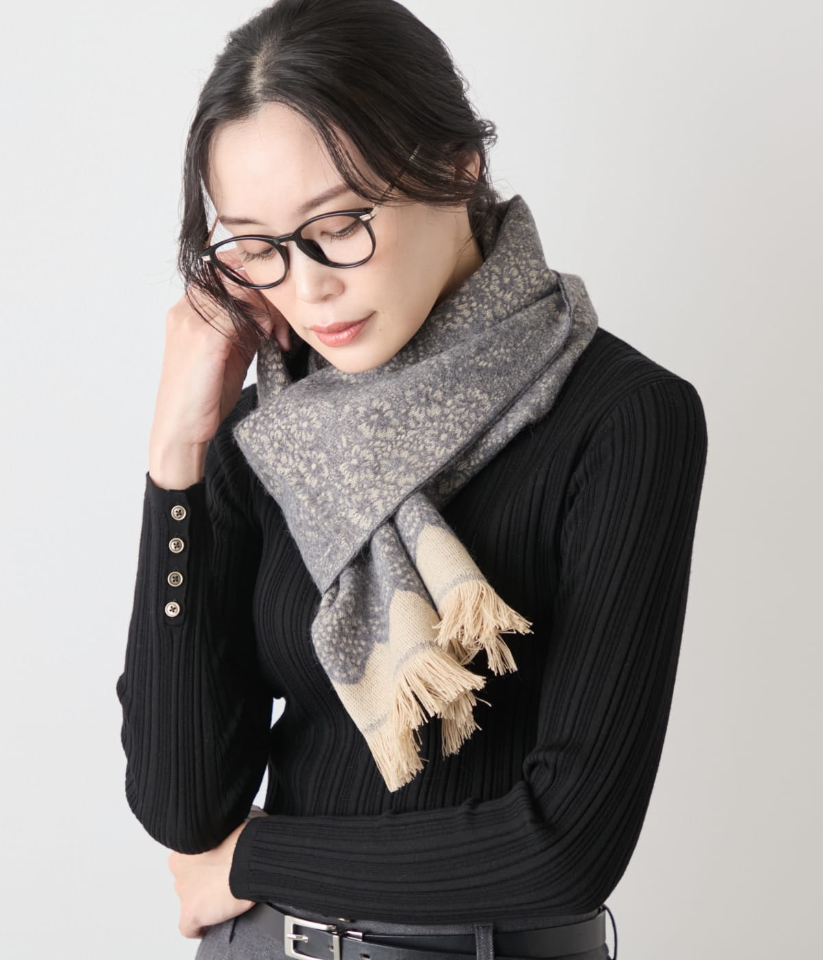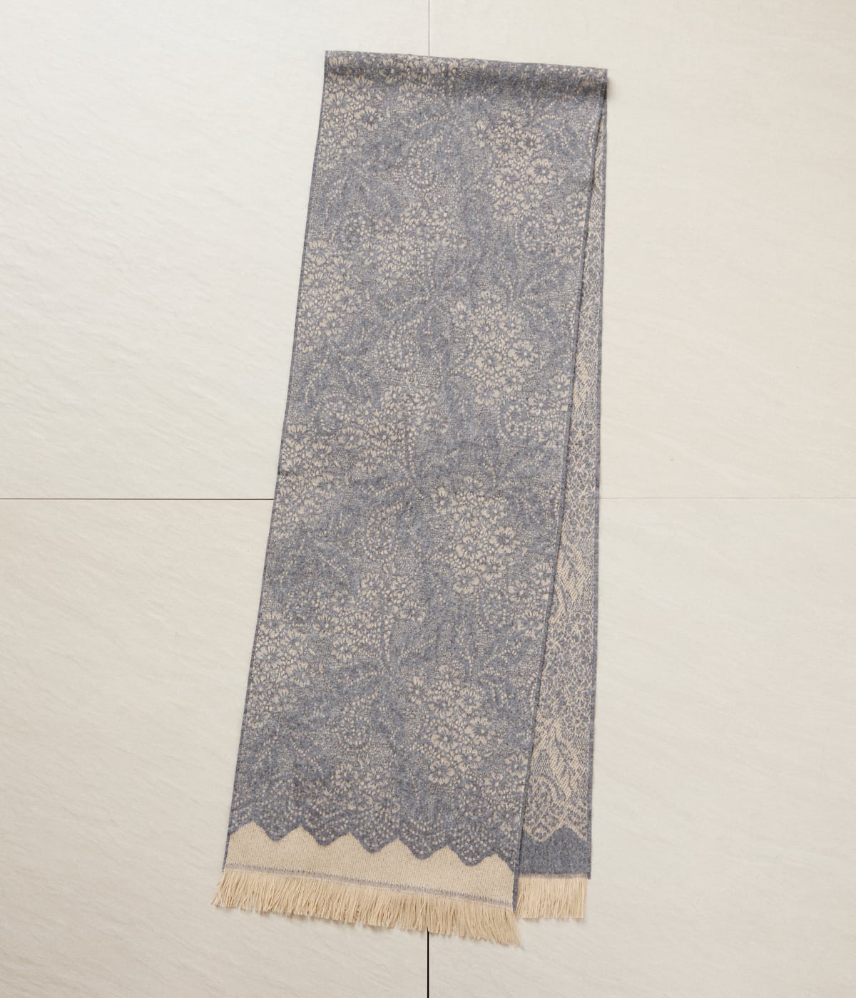 フランスの繊細な技術で織り上げられた、まるでレースをまとったかのような華やかなマフラー。落ち着いた色合いの中に上品な華やぎが宿り、コートやニットの上から纏うだけで装いにリュクスなアクセントをプラスしてくれます。スタイリングに馴染みやすいニュートラルなホワイト・グレーの2色展開。