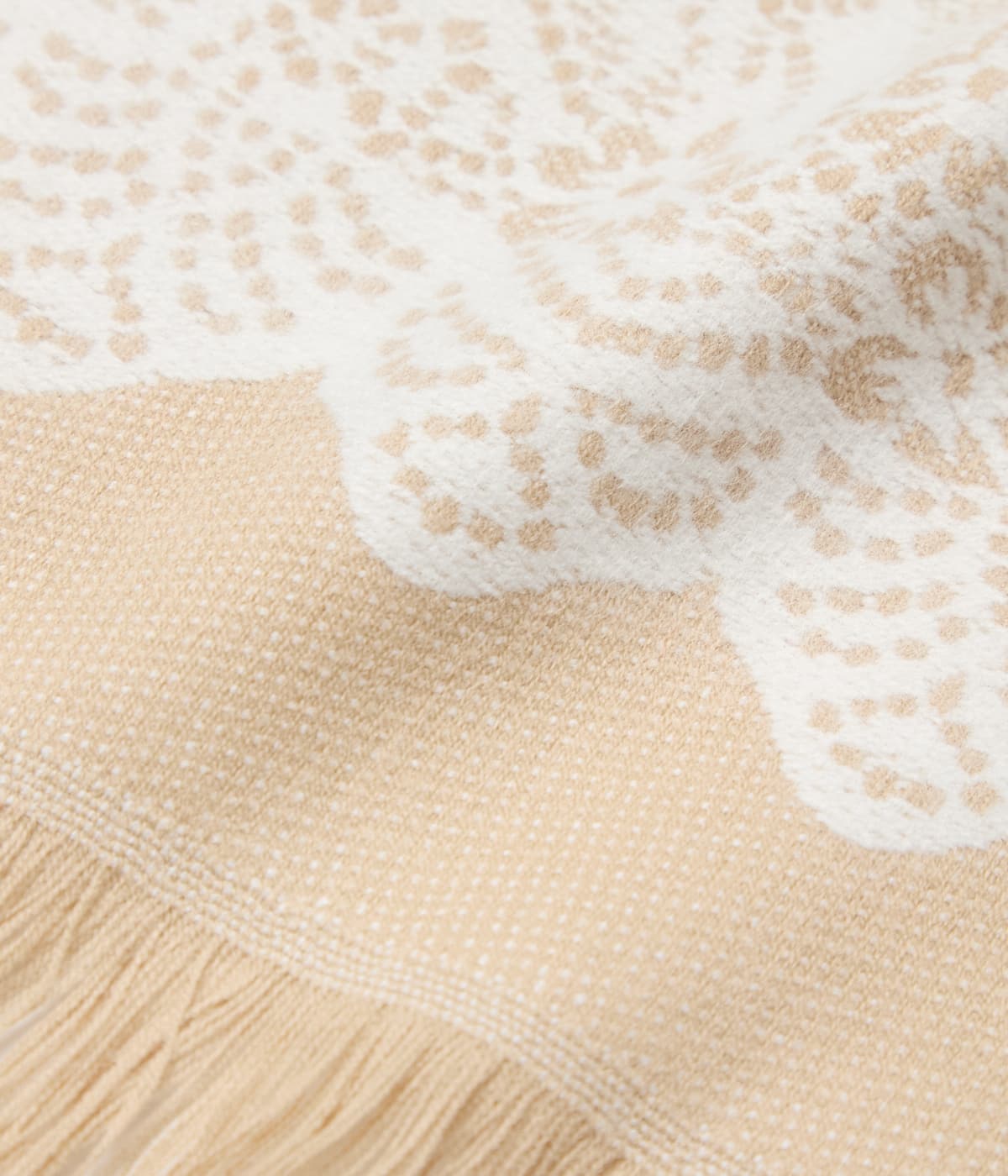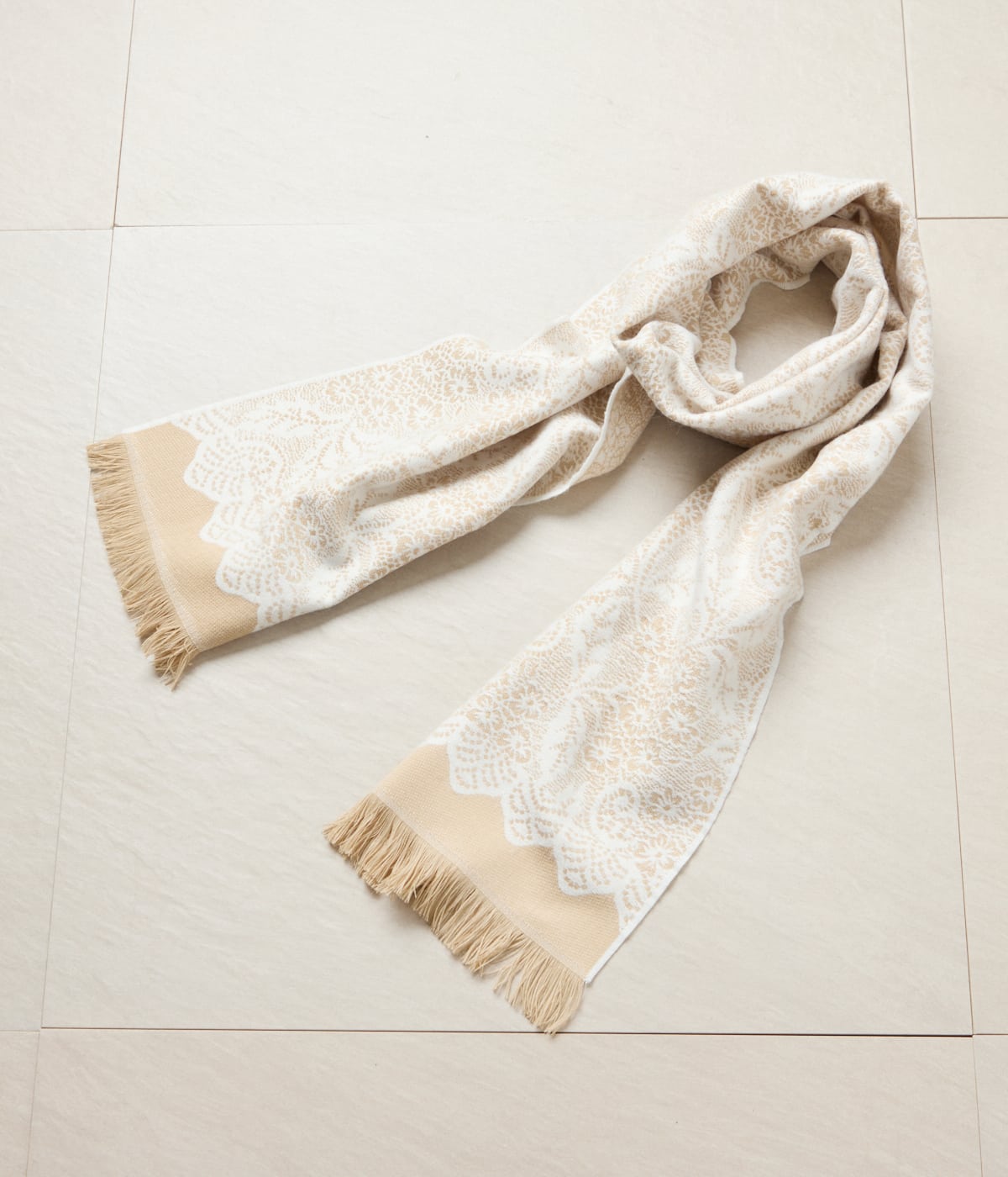 フランス製ならではの繊細な織り柄で、レースをあしらったような上品な模様を表現。繊細な模様がグラデーションのように浮かび上がり、巻いたときに表情豊かな陰影を生み出します。
