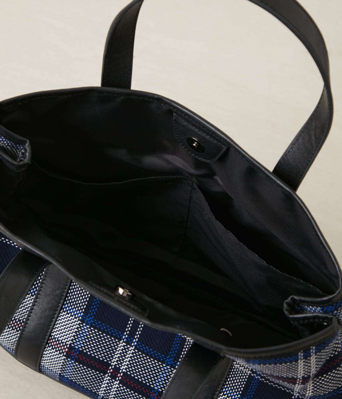 本体はコットン100%のオリジナルニューヨーカータータン生地。地中海で親しまれるタイルアートから着想を得た、新鮮な柄表現が魅力です。また、本革をポイント使いすることで、上品かつ高級感のある表情に。生地が傷まないよう、底部分にも革を使用しています。