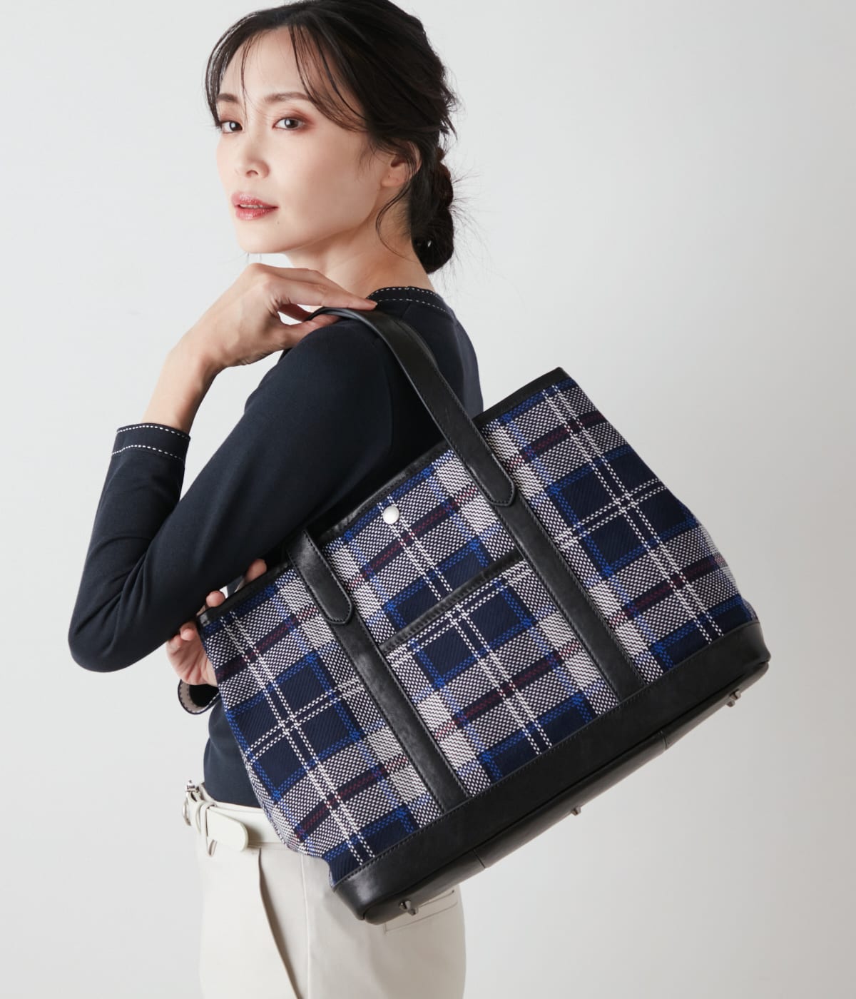 ニューヨーカータータンとレザーのコンビが上品なトートバッグ。使い勝手の良いA4サイズと複数のポケットで、お仕事からお出かけまで様々なシーンに重宝します。