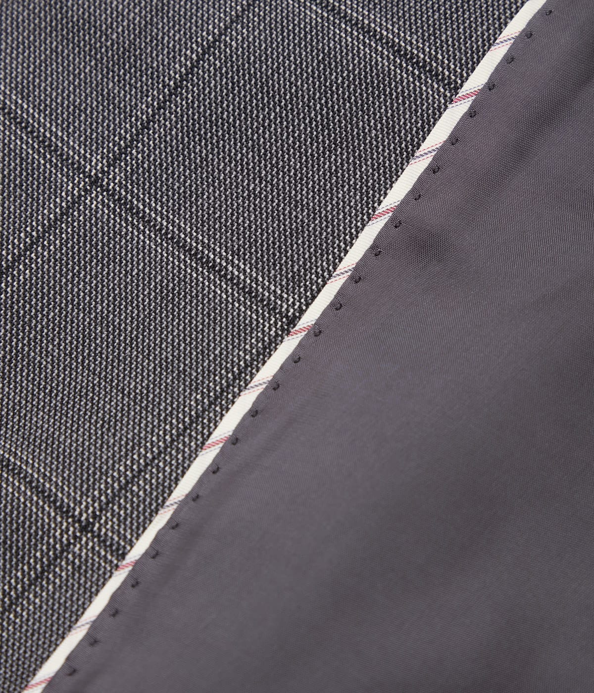 合わせるアイテムやシーンを問わず汎用性の高い、ノッチドラペルの1つ釦でコンパクトなシルエット。フロントラインを美しく見せるため、内ポケットを省き、縫製が表に響かないよう配慮しました。ラペルやフラップにはAMFステッチを施し、手仕事風のニュアンスを加えています。見返し端には白いレジメンタルストライプのパイピングをあしらい、見えない部分にも価値観を感じさせる1枚に仕上げています。総裏仕立て。ポケットあり。