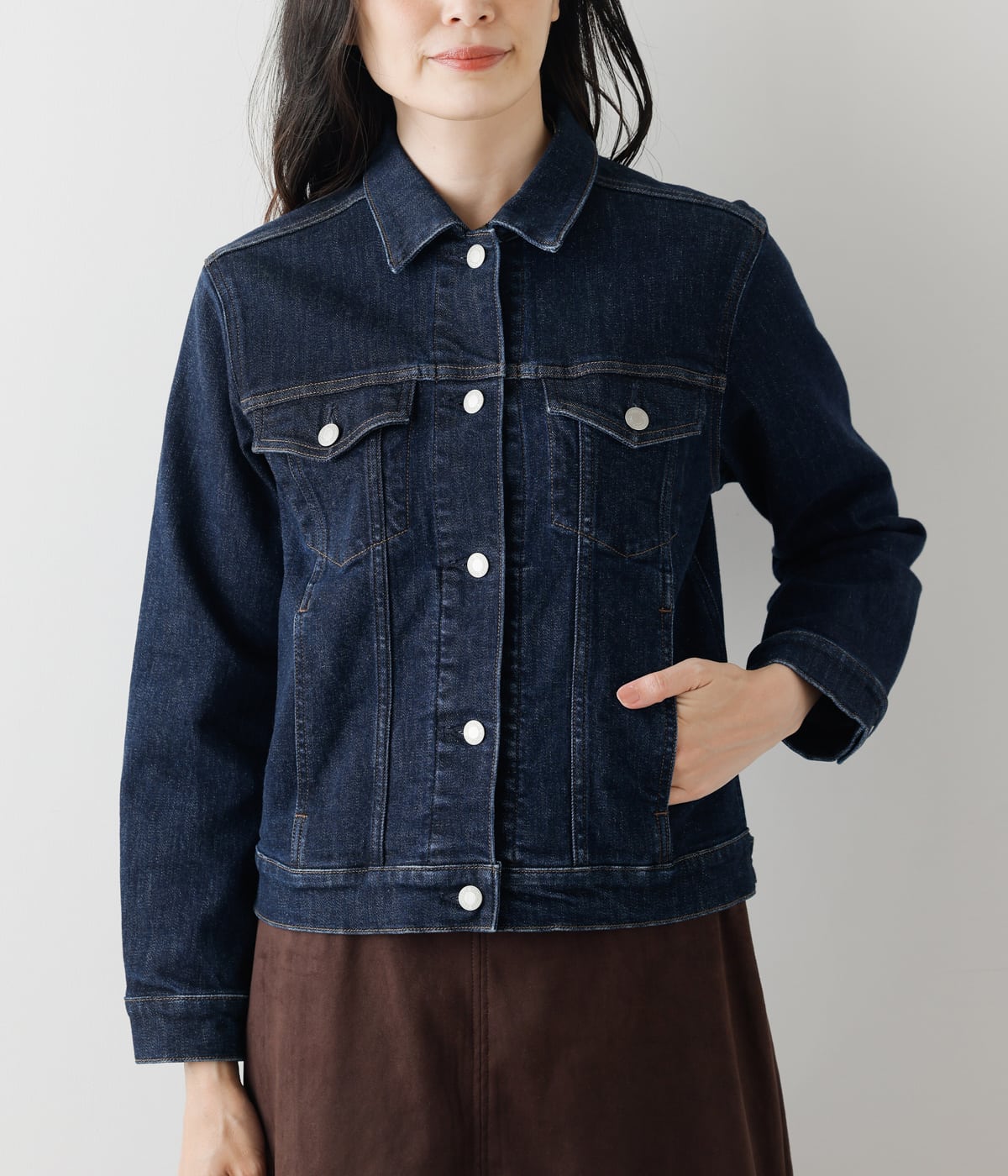 ベーシックな襟付きのデニムジャケット。程よくゆとりのあるサイズ感で、様々なトップスと合わせていただけます。胸にはフラップポケット、フロント脇にはスラッシュポケットを配し、デザイン性と使い勝手の良さを両立させました。