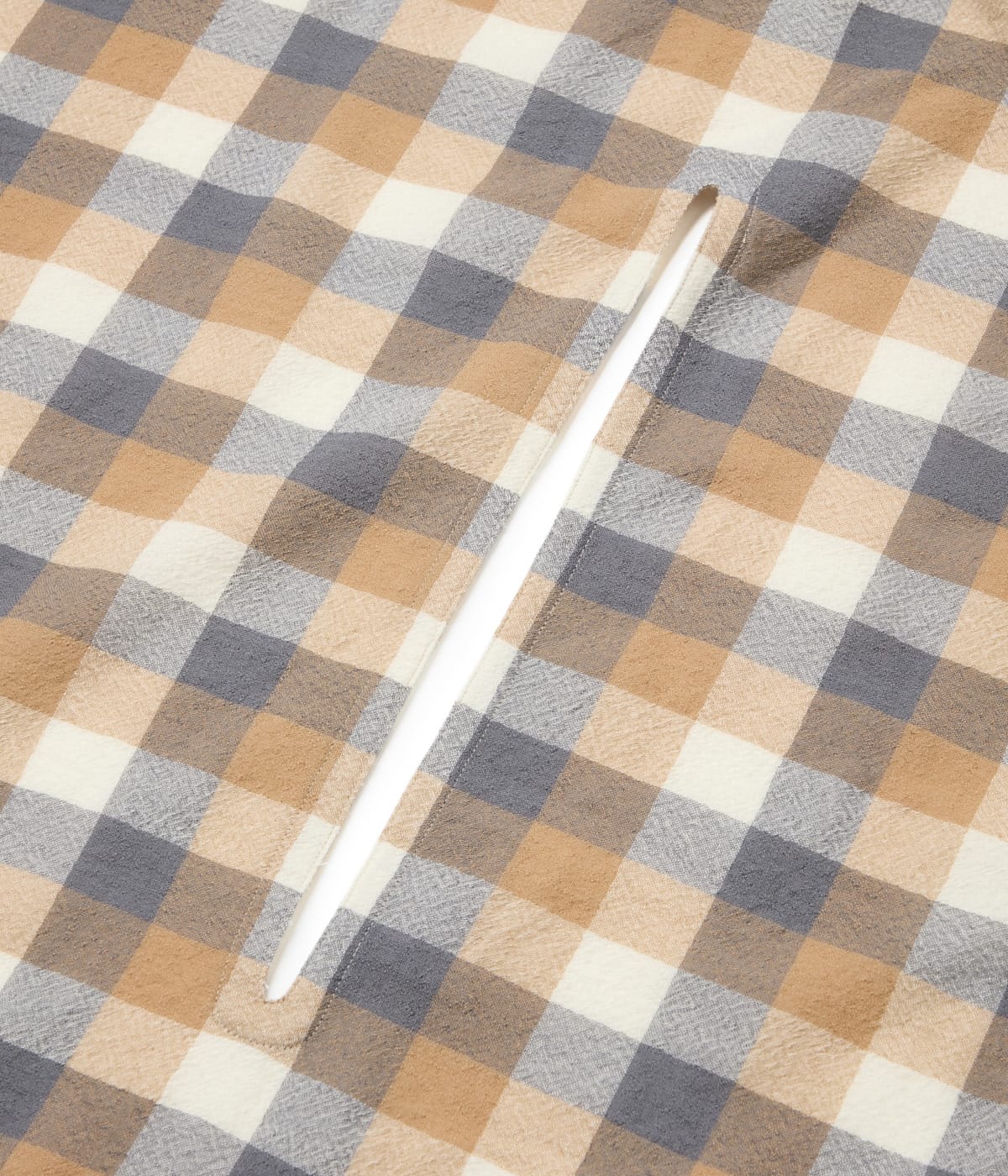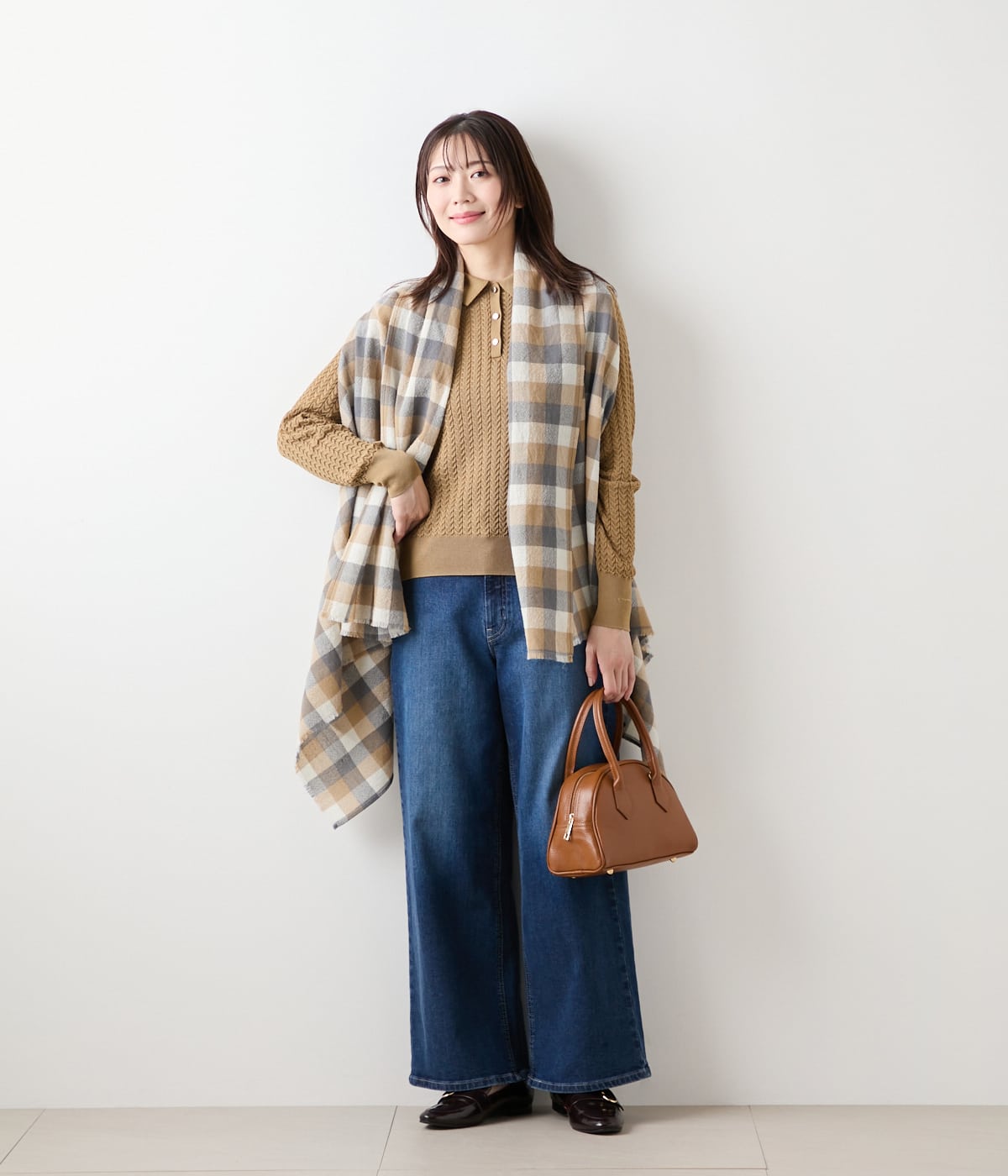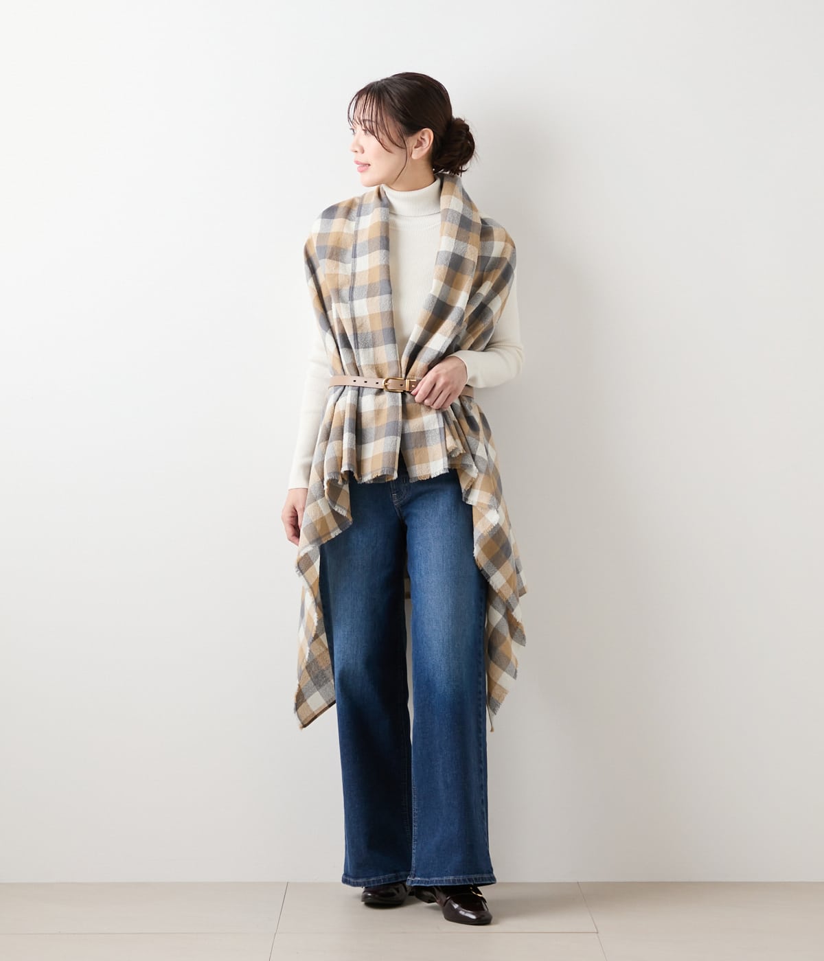 お出かけや室内での軽い羽織りとして重宝するケープストール。動きのあるシルエットに優しい色のチェック柄が映える、存在感たっぷりなアイテムです。広げると長方形になり、袖を通さずラフに巻いたりひざ掛けにしたりと、何通りもの使い方がお楽しみいただけます。