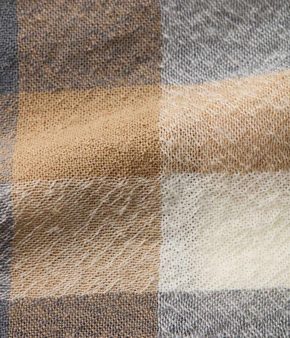 1999年のニューヨーカーのコレクションより、「霧のロンドン」をイメージしたブロックチェック柄を採用。ホワイトを基調に柔らかなベージュやグレーを重ね、静かな冬の街並みにしっとりと溶け込んでいくような色合いを表現しました。生地は甘撚り糸を使用してざっくりと織った、エターミンと呼ばれる平織物。ナイロン糸にウールを混紡し、強撚することで程よいシャリ感と凹凸を持たせています。