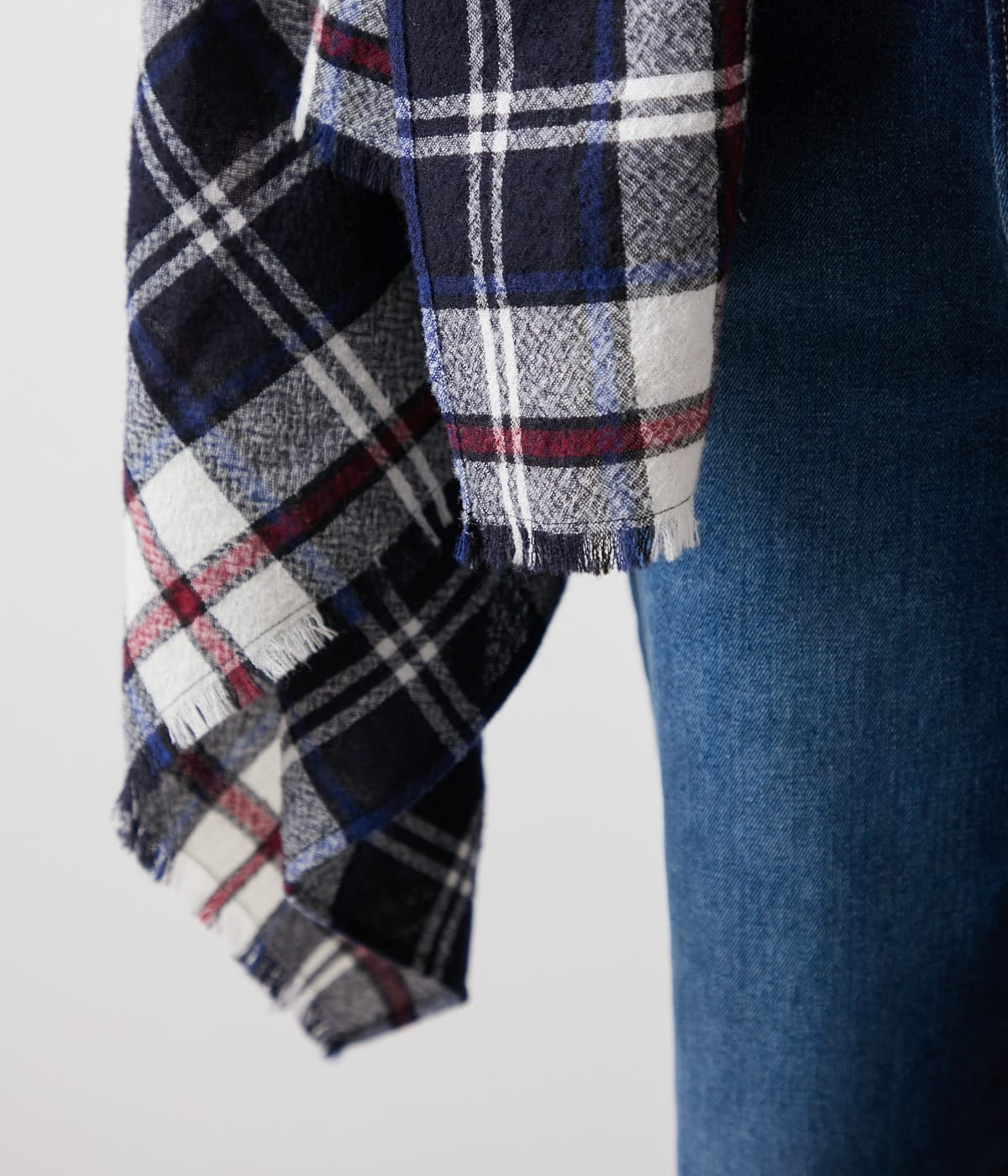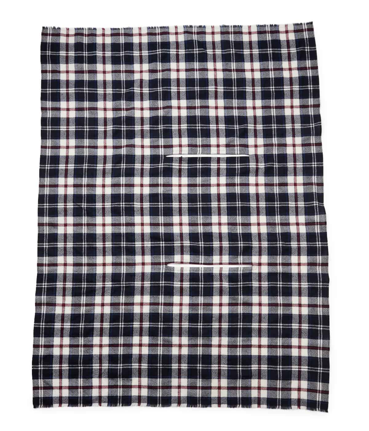 長方形の大判ストールに袖穴を付けた着流し羽織り。袖穴に腕を通すとベストのように着用でき、ふんわりと広がるドレープが華やかさをプラスしてくれます。上下2WAY仕様で、着丈の長さやシルエットを変えての着用も可能。両端のフリンジもさりげないアクセントになり、秋冬らしいあたたかみを感じさせます。