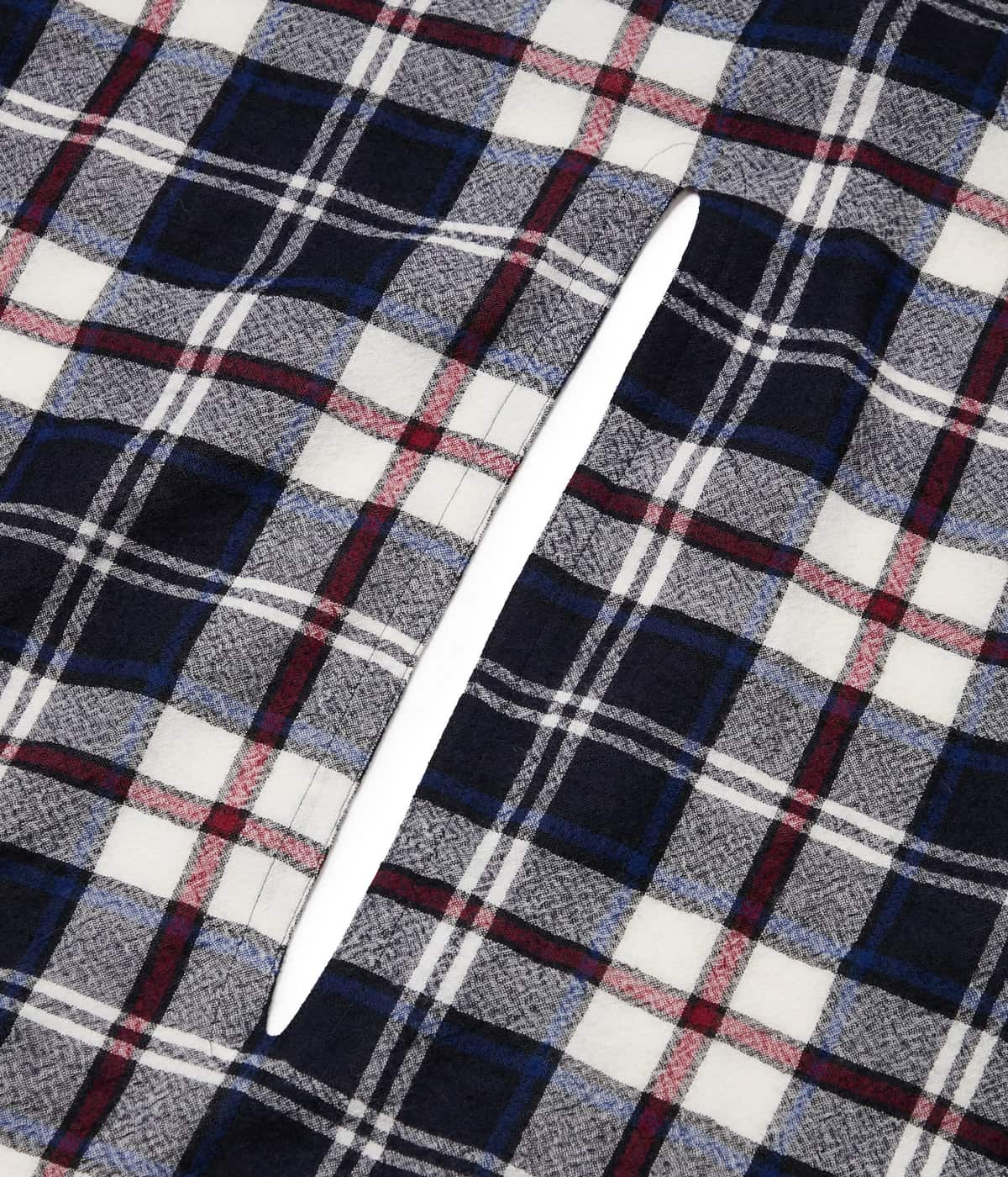 ニューヨーカータータンを大きめのピッチで華やかに表現しました。生地は甘撚り糸を使用してざっくりと織った、エターミンと呼ばれる平織物。ナイロン糸にウールを混紡し、強撚することで程よいシャリ感と凹凸を持たせています。