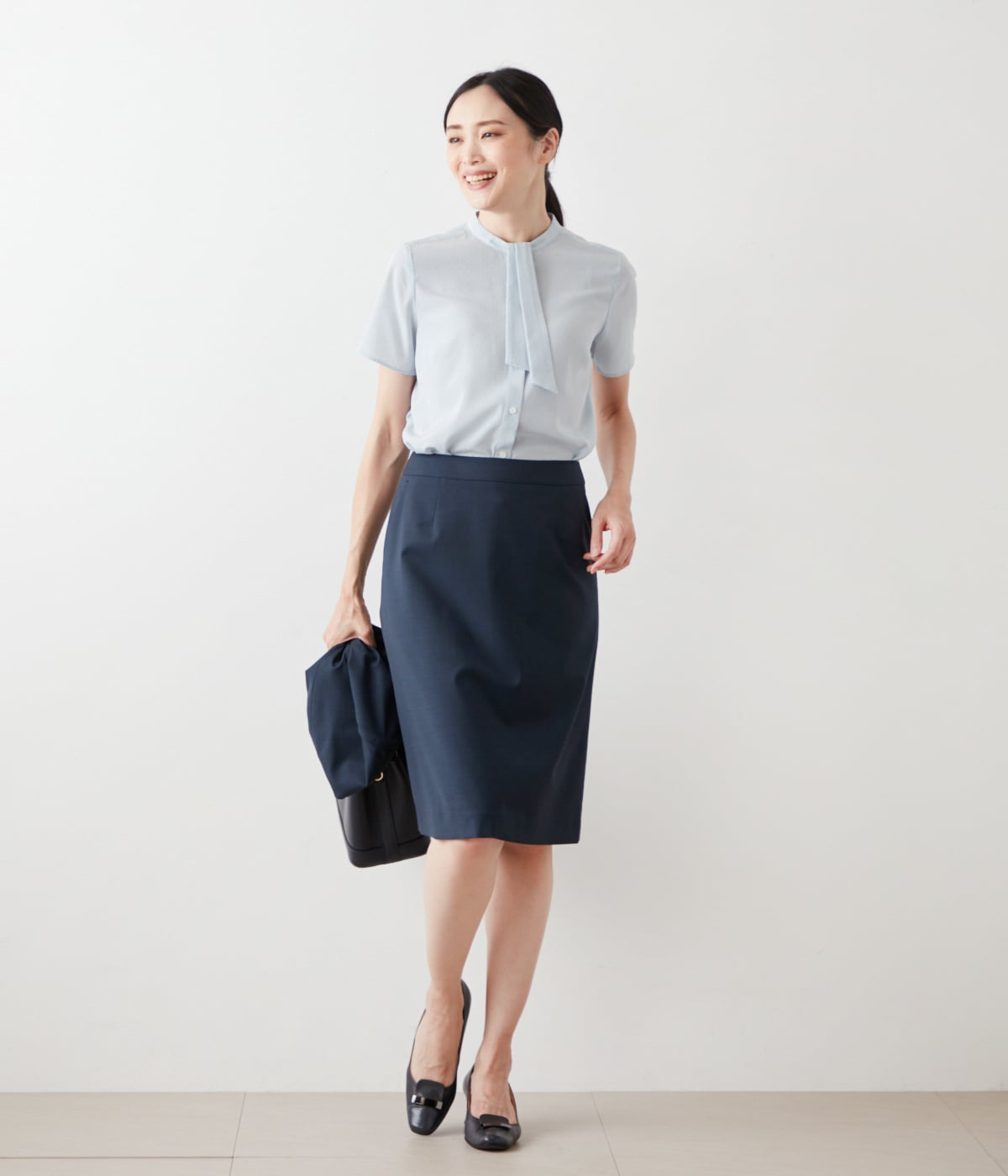 2色の糸で表現した深みのある織り柄が美しい、セットアップ対応のAラインスカート。着心地快適なストレッチ性を備えたウォッシャブル素材で、働く女性に嬉しい機能もポイントです。柄が細かく着回しやすいため、単品での着用もおすすめ。カラーは落ち着きのあるグレー、ブルーの2色展開。