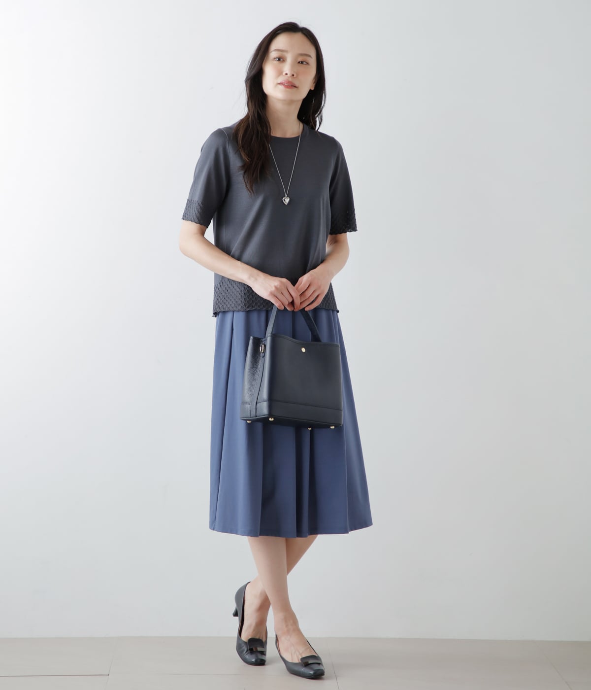 快適な着心地ときちんと感を両立した、ジャージー素材のタックスカート。合わせるトップスを選ばず、シーンレスに活躍するアイテムです。同素材のプルオーバー(品番:54853512)を合わせたワンピース風の着こなしもおすすめ。カラーは通年活躍してくれるシックなブラックと、ほど良くスタイリングが華やぐブルーの2色展開です。