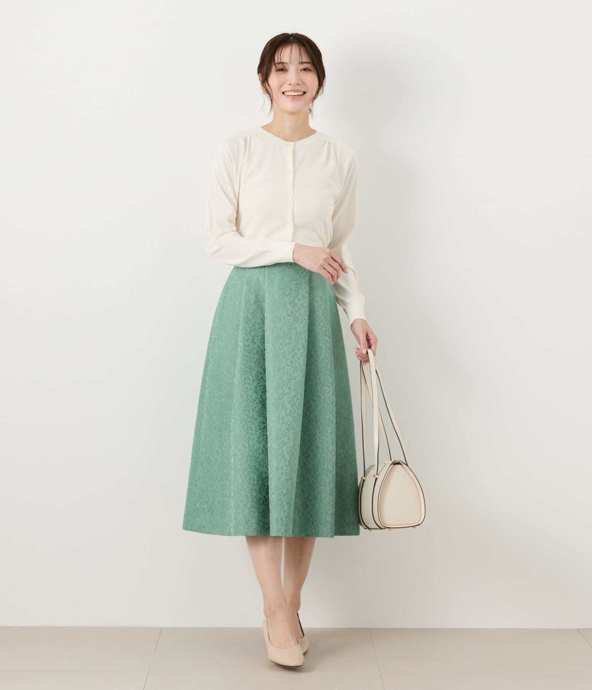 色の濃淡で表現した、甘さ控えめな小花柄が魅力のフレアスカート。無地ライクで主張しすぎず、着こなしにさりげなく表情を添えるアイテムです。同シリーズのブラウス(品番:54655131)と合わせたワンピース風スタイルもおすすめ。カラーは柔和なライトグリーンと、ベーシックなネイビーの2色展開。