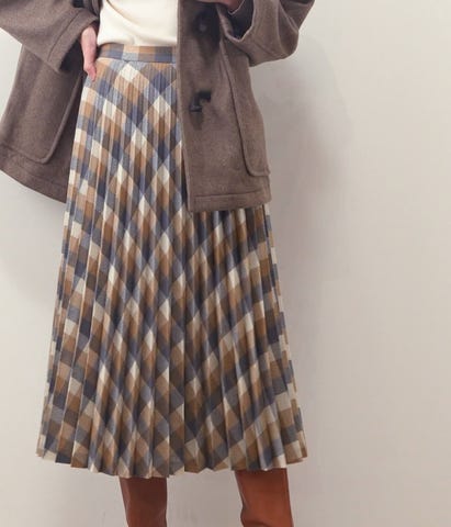 温もりを感じるウール素材にクラシカルなチェック柄が映えるプリーツスカート。シンプルなトップスと合わせるだけで装いが華やぎ、縦長効果も発揮してくれる優秀アイテムです。また、あえてバイアス状にしたチェック柄が柔らかな印象を与え、カジュアルにはもちろんきれいめな着こなしにもマッチします。同素材のケープストール(品番:54116160)のご用意もございます。
