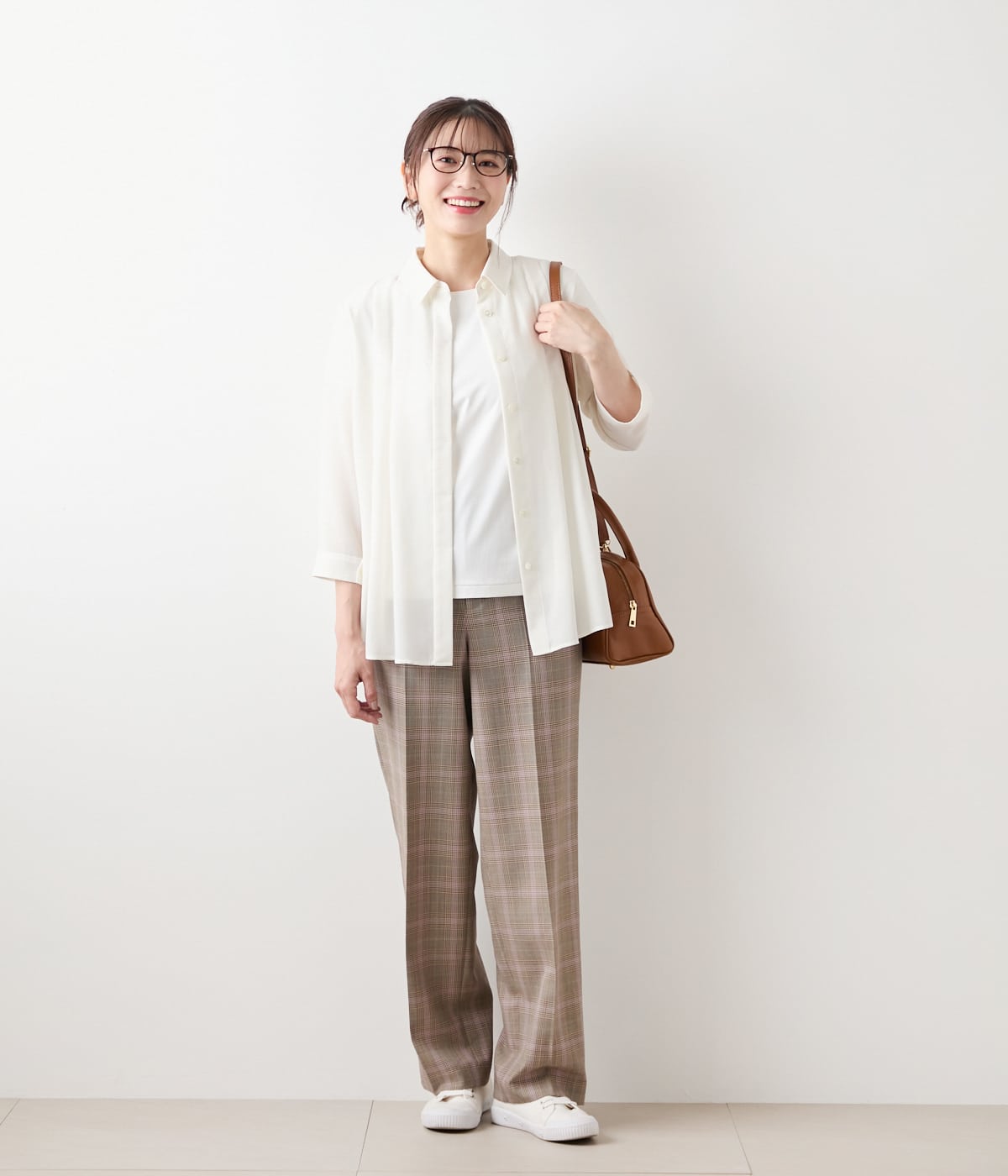 やや太めの幅がトレンド感のあるストレートパンツ。シンプルなデザインで、グレンチェックの柄を引き立たせました。長めの股下丈とセンタープレスが縦長効果を生み、レッグラインをきれいに演出します。裏地なし。ポケットあり。