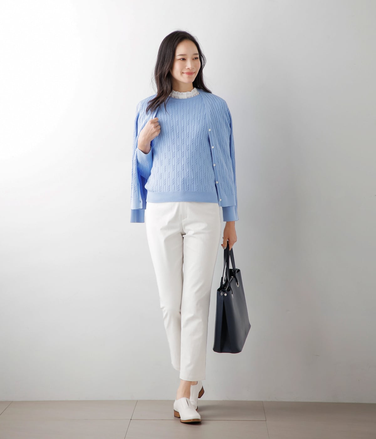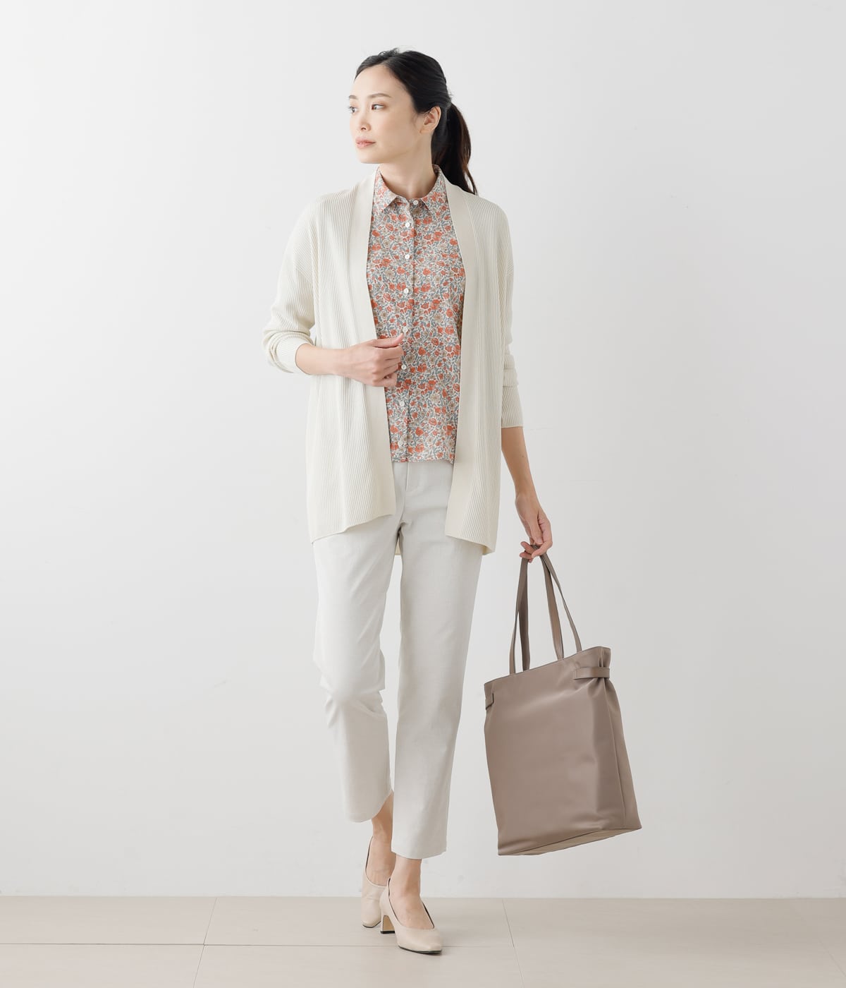 カラーニット(品番:54712520)(品番:54722520)を合わせれば、華やかなカジュアルスタイルに。プリントブラウス(品番:54642212)を合わせてエレガントに着こなすのも素敵です。