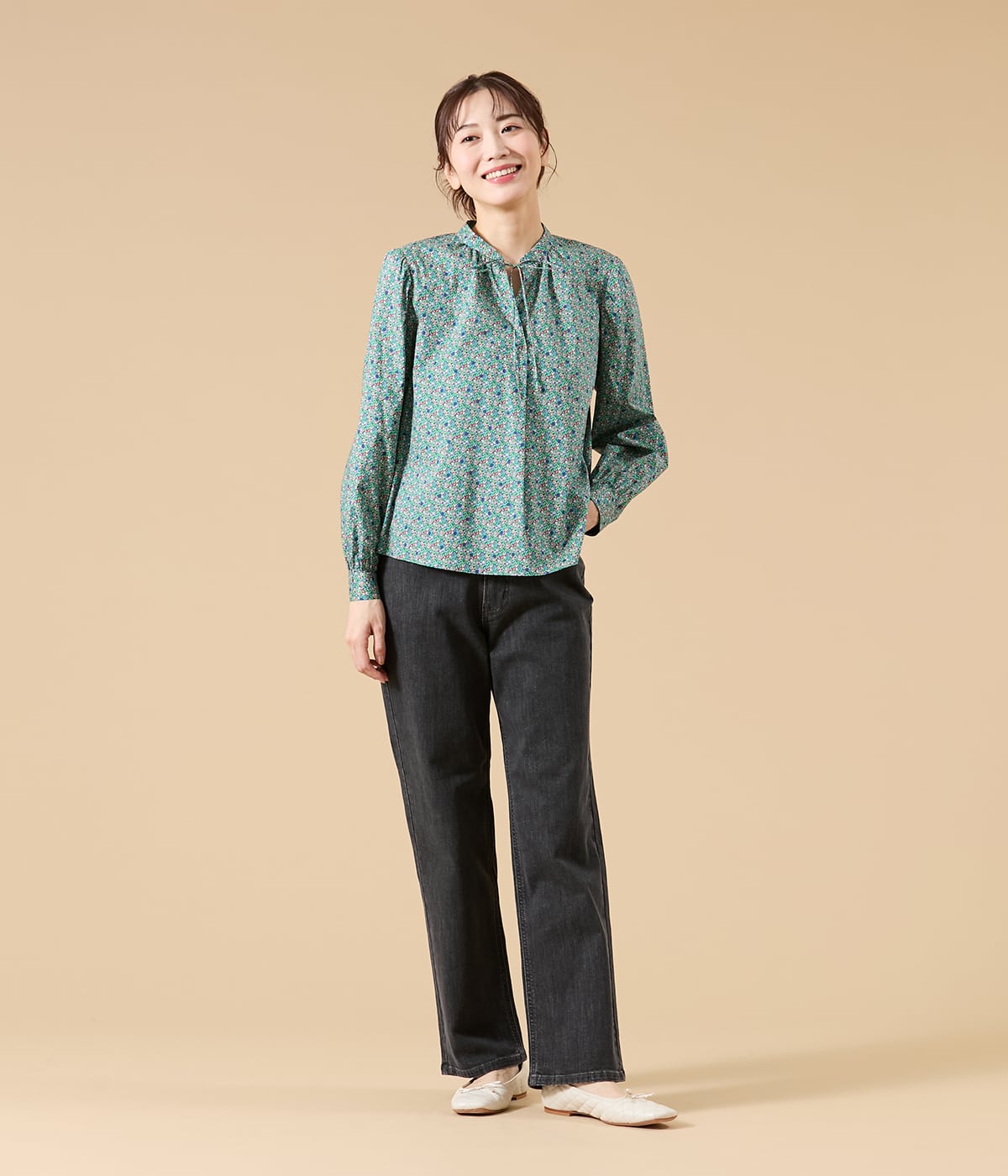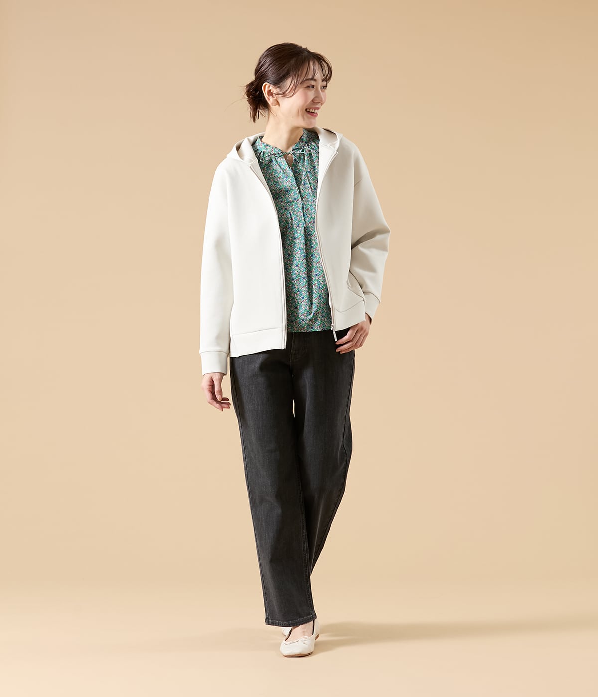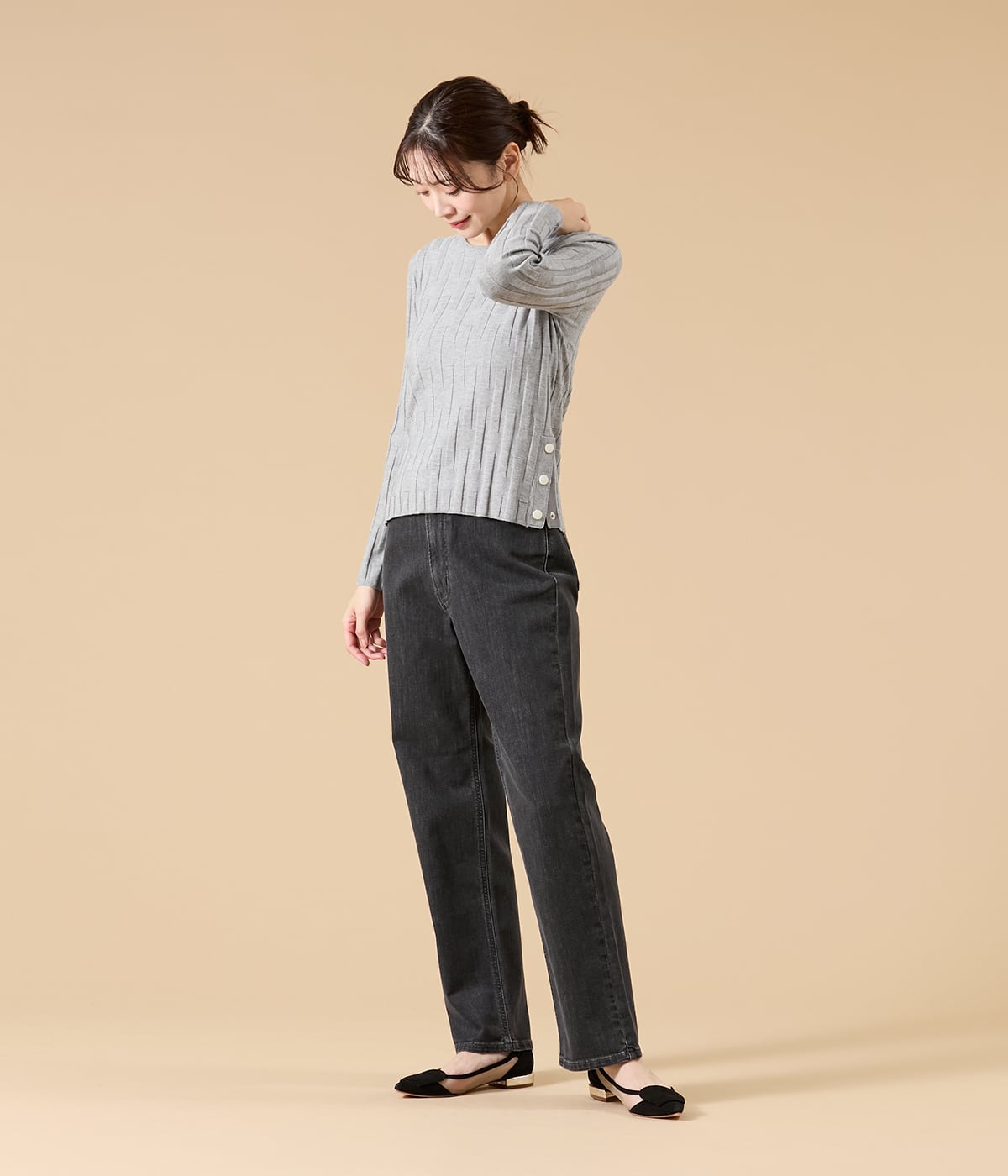 ウエストからヒップはすっきりフィットし、裾に向かってまっすぐ落ちるストレートシルエット。身体のラインを拾いにくく、シンプルながら美脚効果が期待できます。