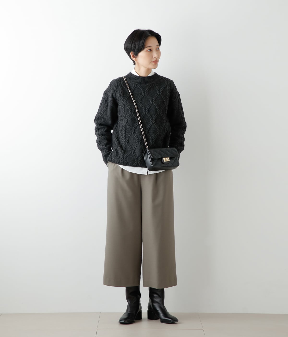 シンプルなデザインでオンオフ着回せるガウチョパンツ。リラクシーでありながらすっきりときれいめな印象も併せ持ち、様々なトップスやアウターとのコーディネートが楽しめます。カラーは秋冬らしいシックなダークブラウン、カーキグリーンの2色展開。