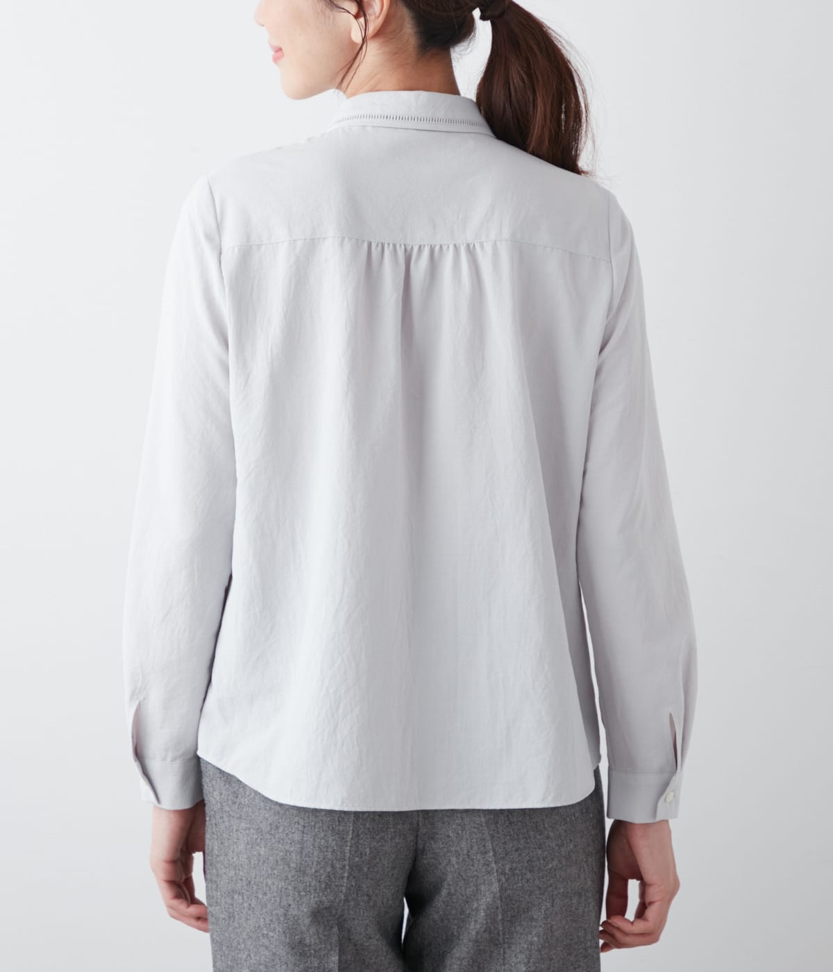 長袖のレギュラーカラーシャツ。襟と前立て端にはしごレースを配し、繊細なアクセントを添えました。胸元の切り替え部分に寄せたギャザーが立体感を演出し、重心が上がることですっきり見えるのもポイントです。