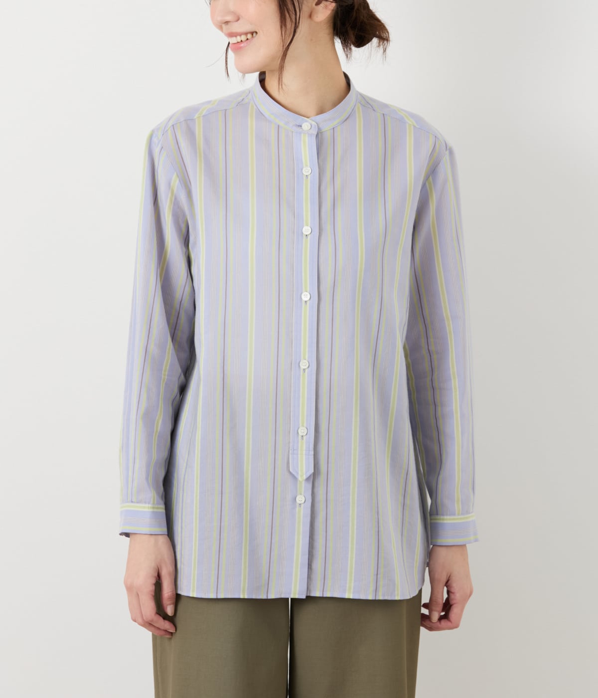 スタンドカラーの長袖シャツ。ロング丈にゆとりのあるシルエットで、リラックスしてお召しいただけます。前立てはタブ付きのデザインにし、さりげなくミリタリーテイストを加えました。1枚着はもちろん、羽織り使いにもおすすめです。