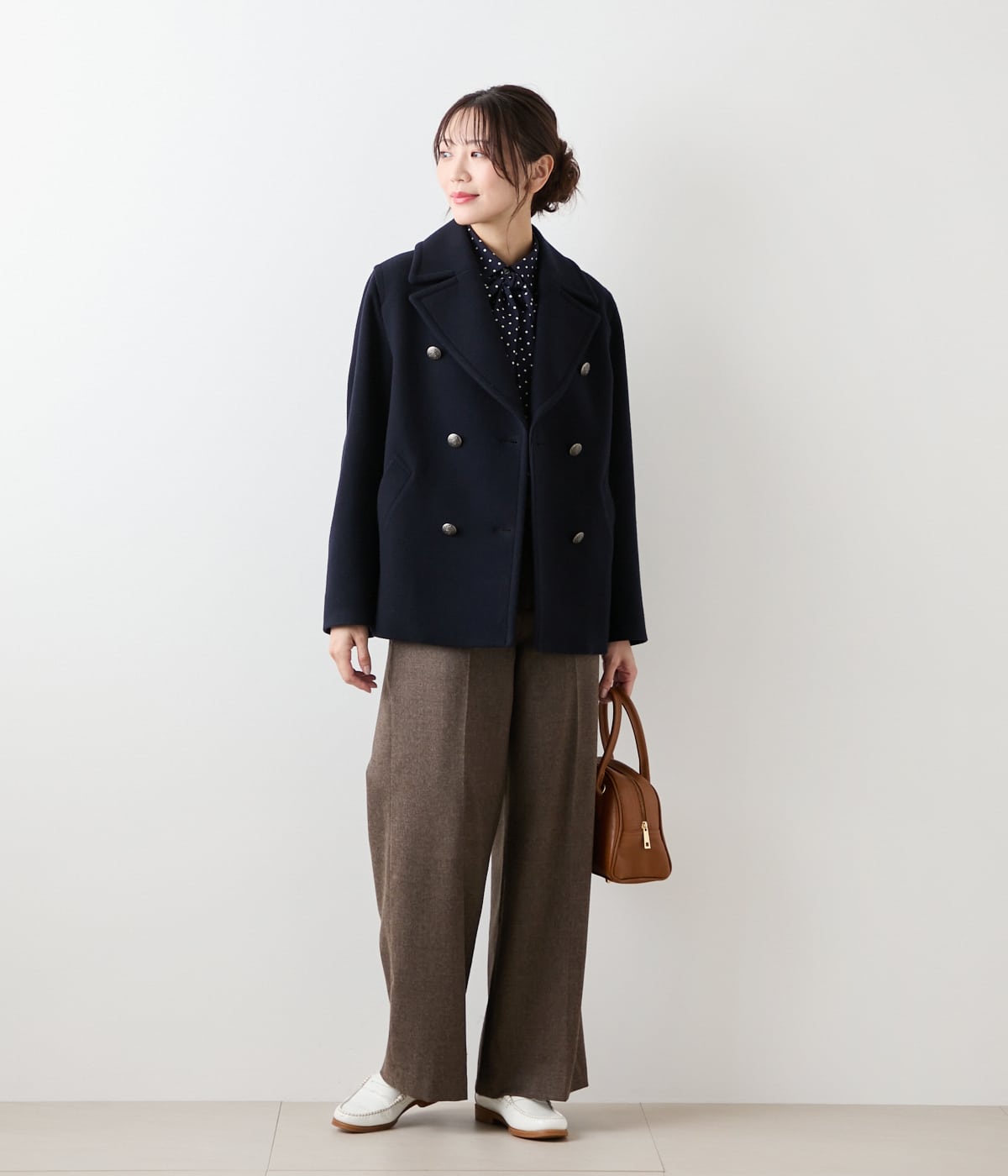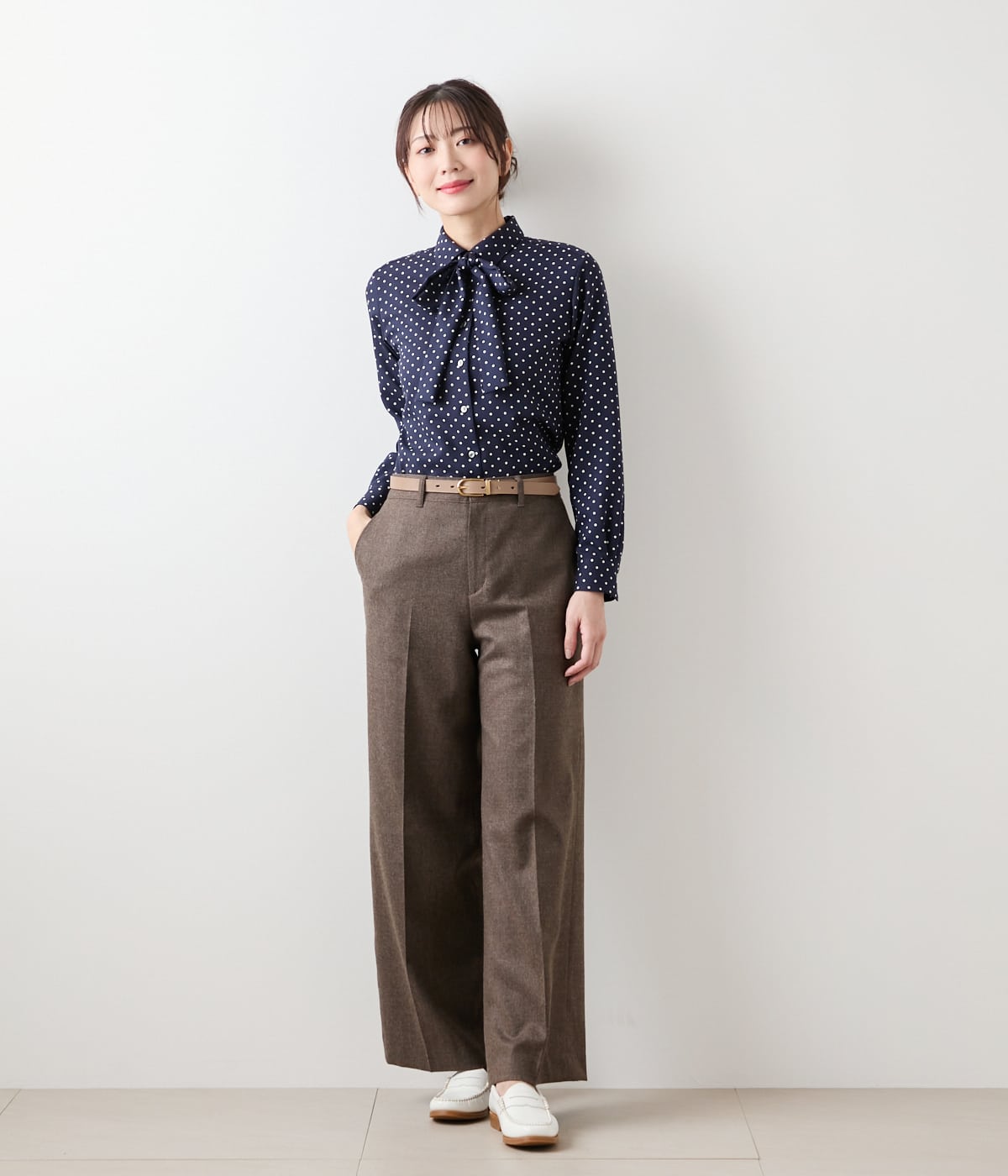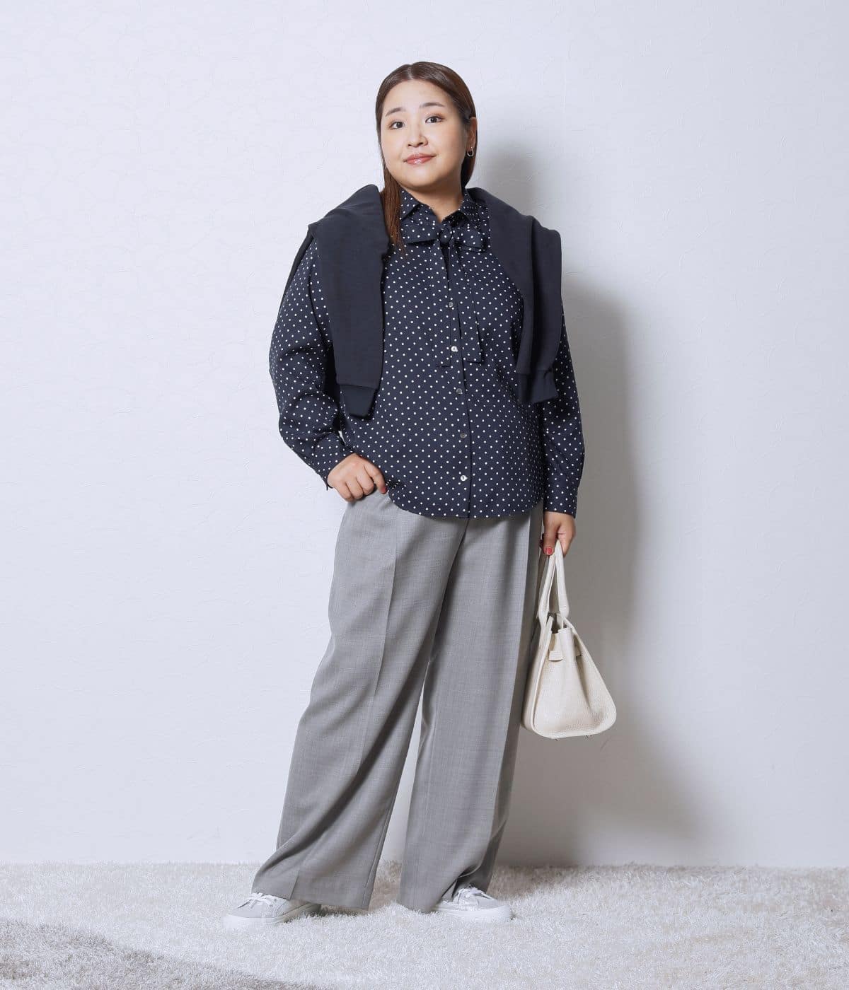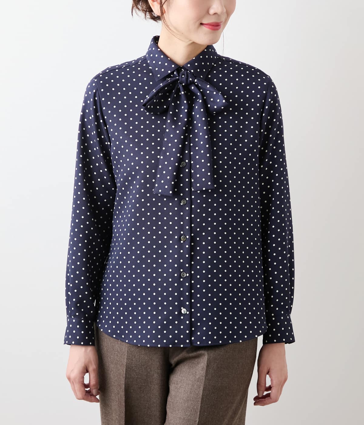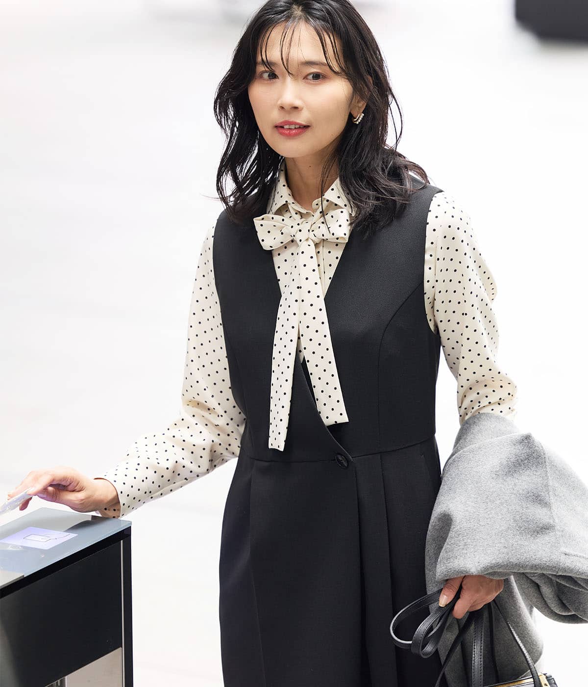 上品なドットプリントが、纏うだけで着映えするボウタイブラウス。ジャケットのインナーとしてはもちろん、ジャンスカなどとのレイヤードにも一役買ってくれる優秀アイテム。ボウタイは取り外し可能なので、オンオフ関係なくスタイリングの幅を広げてくれます。ベーシックに着回ししやすいアイボリー、シックで大人な印象に導くネイビーの2色展開。