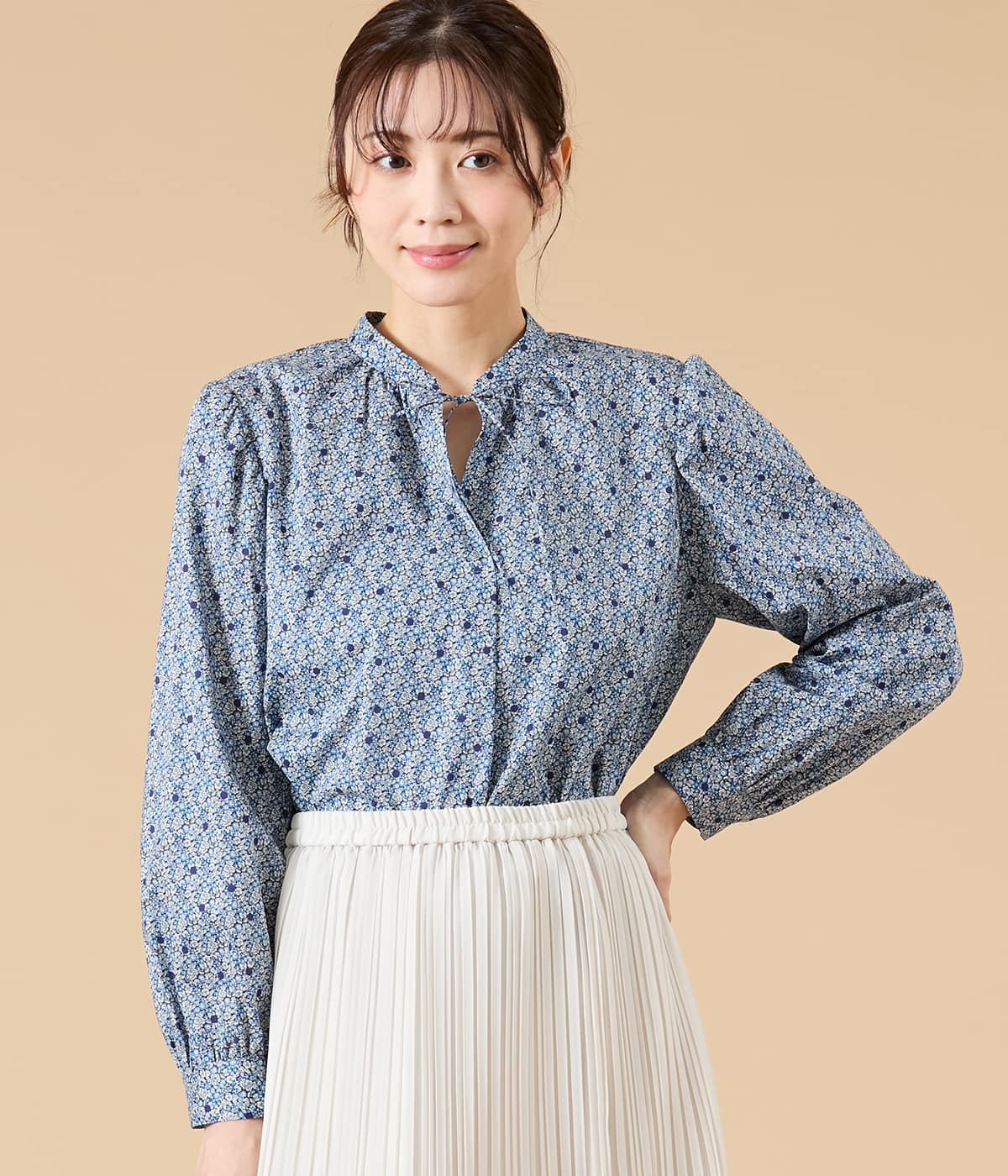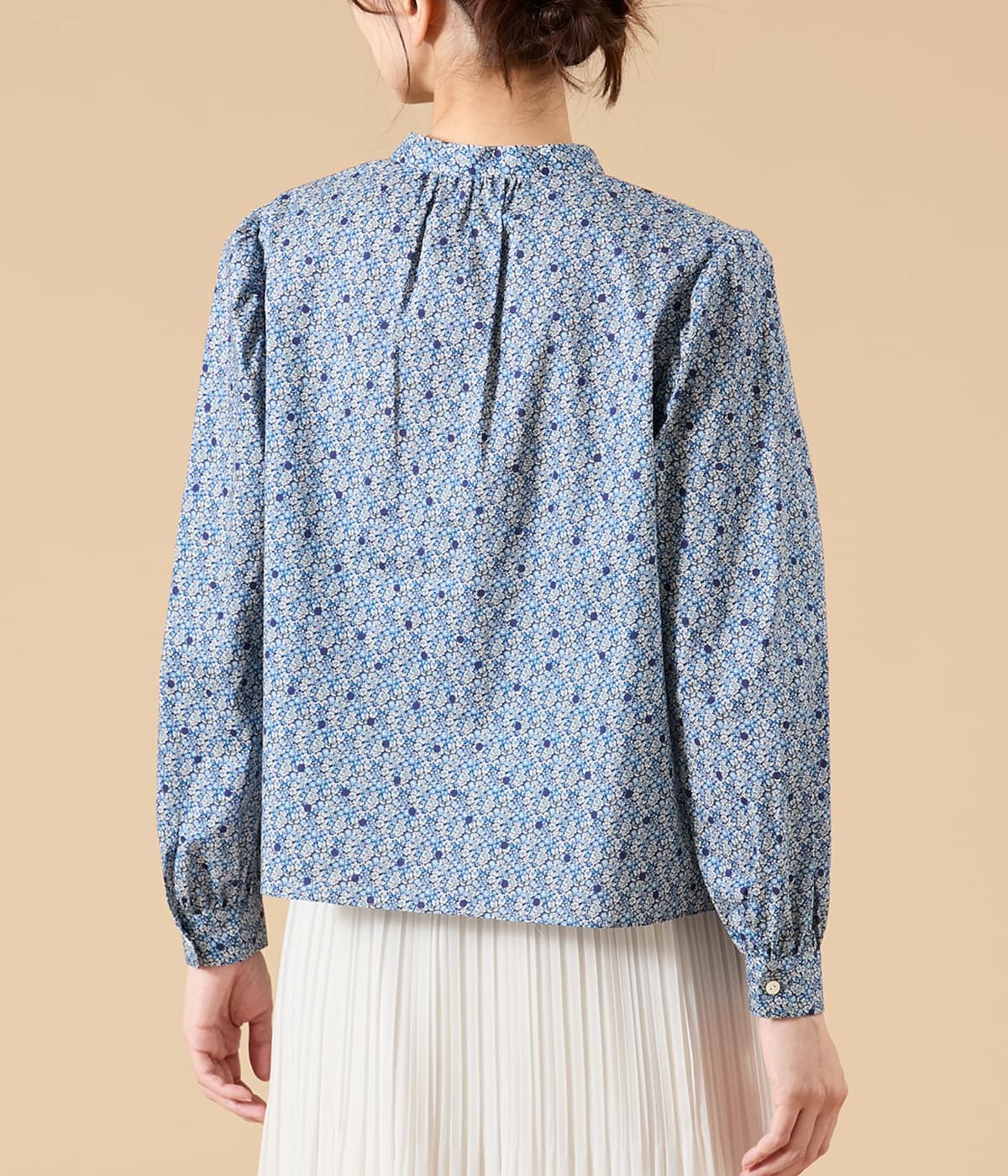 細やかなボタニカル柄に水玉模様の遊び心を忍ばせた、リバティプリントの華やぎブラウス。鮮やかさとほど良い可憐さが共存し、寒い季節のスタイリングに“ぱっと花が咲くような”明るさを添えてくれます。フレッシュな彩りで顔映りもばっちりなグリーン、品のある落ち着きが知的な印象のブルーの2色展開。