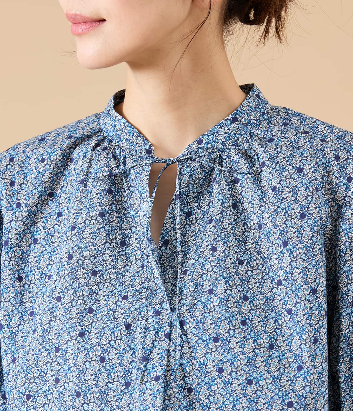 リバティ社のエターナルコレクション「Abasan Spot(アバサン・スポット)」をチョイス。ヒナギク・バラ・アサガオなど複数の花を組み合わせた緻密なボタニカルに、水玉のリズムを加え再構築したプリントです。遠目にはテクスチャー生地のように見える奥行きがポイント。生地はしなやかで上質な綿100%タナローンで、軽さと肌触りの良さが特徴です。