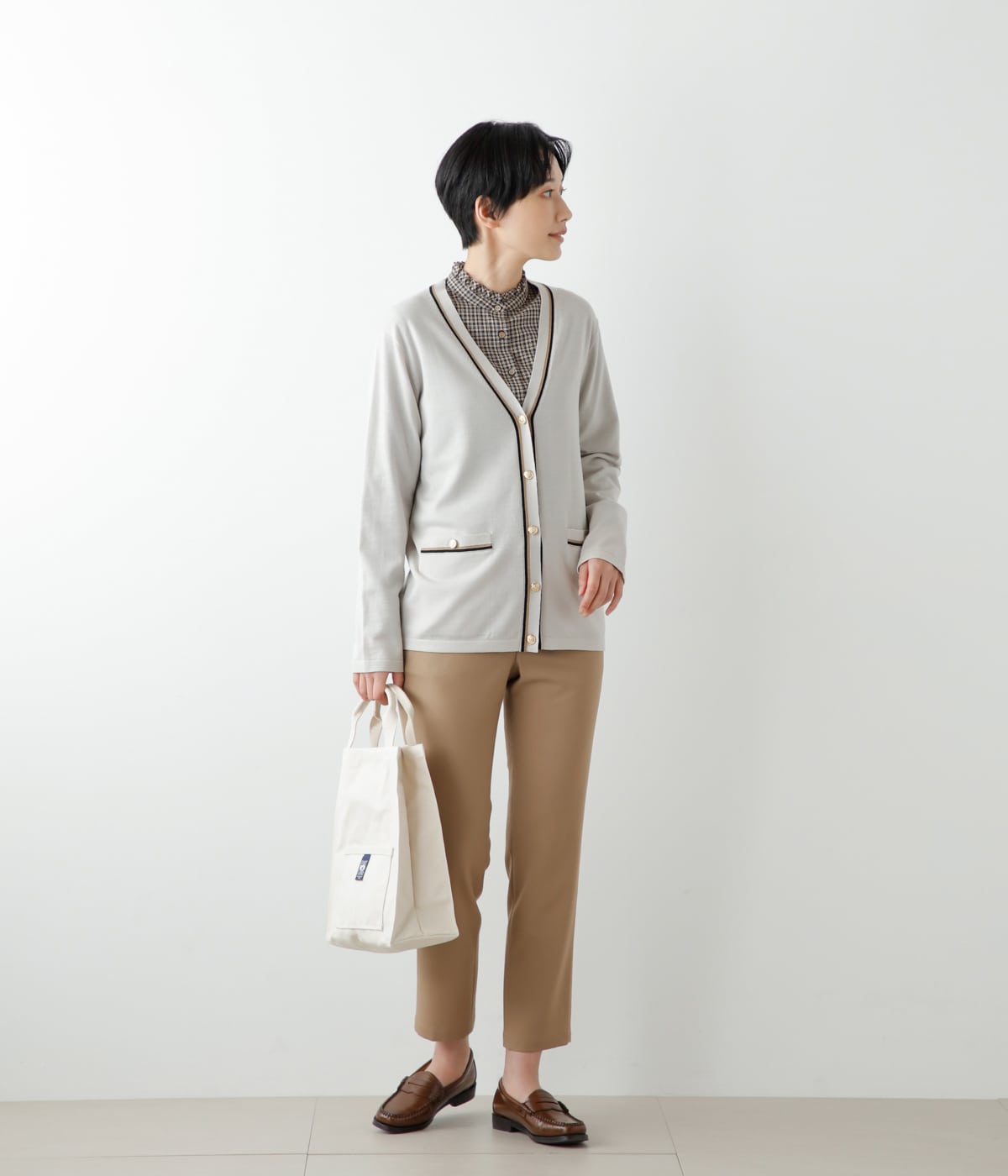テーパードパンツ(品番:54339214)にインすれば、マニッシュなトラッドスタイルに。ニットベスト(品番:54799650)(品番:54799651)とのレイヤードを楽しむのもおすすめです。