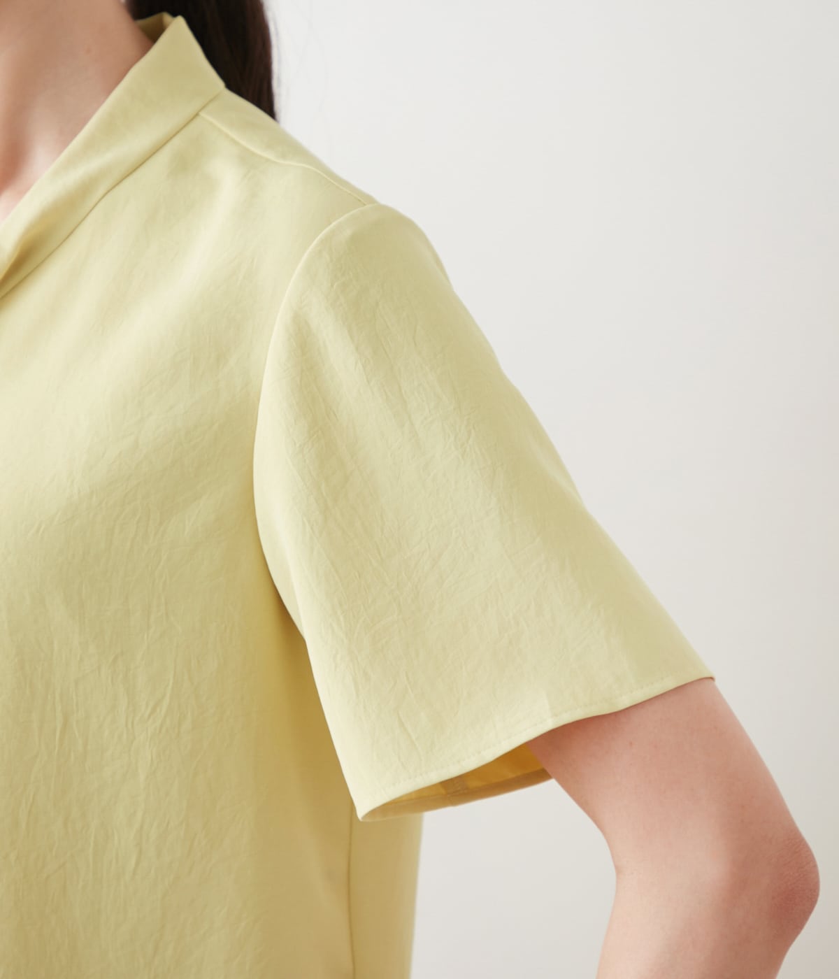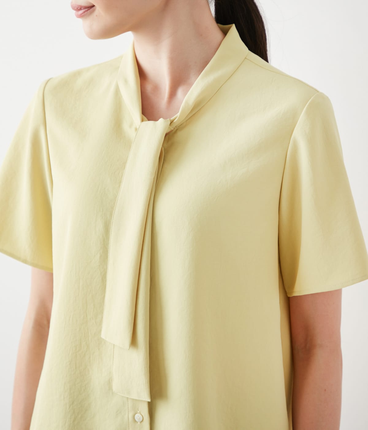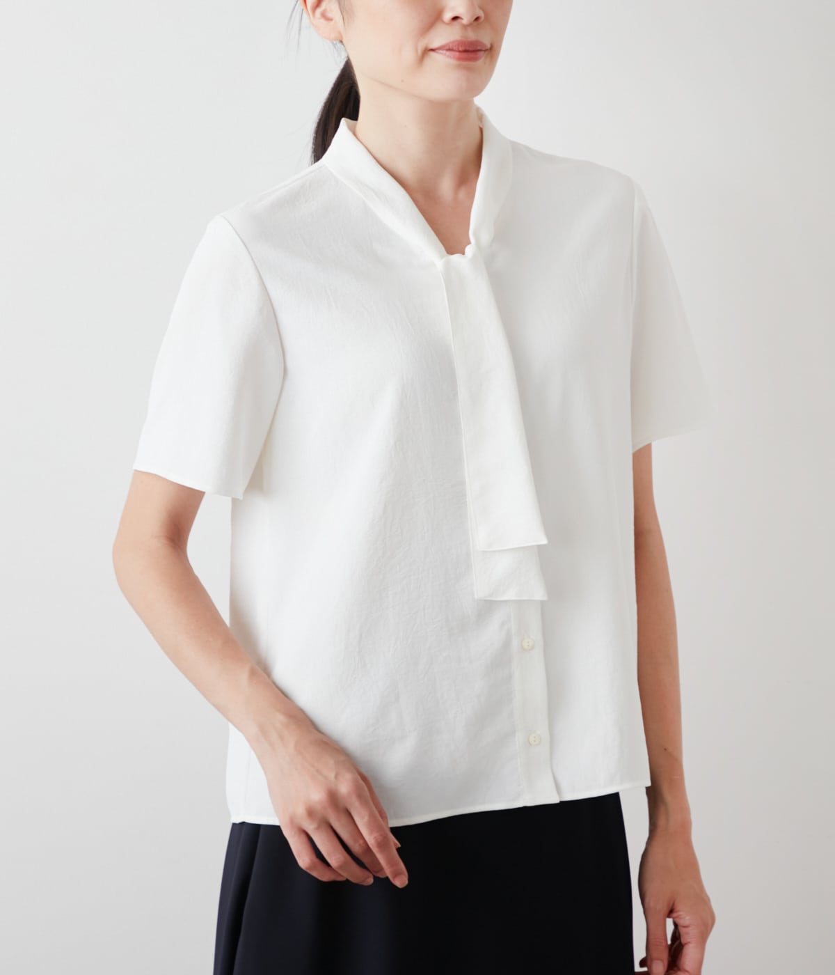 襟元にボウタイをあしらった、前開きの半袖ブラウス。ボウタイは襟から一続きになっており、付け外しの手間なく簡単にスタイリングが決まります。長めでやや広がりを持たせた袖は、1枚でも気兼ねなく着用しやすいデザインです。