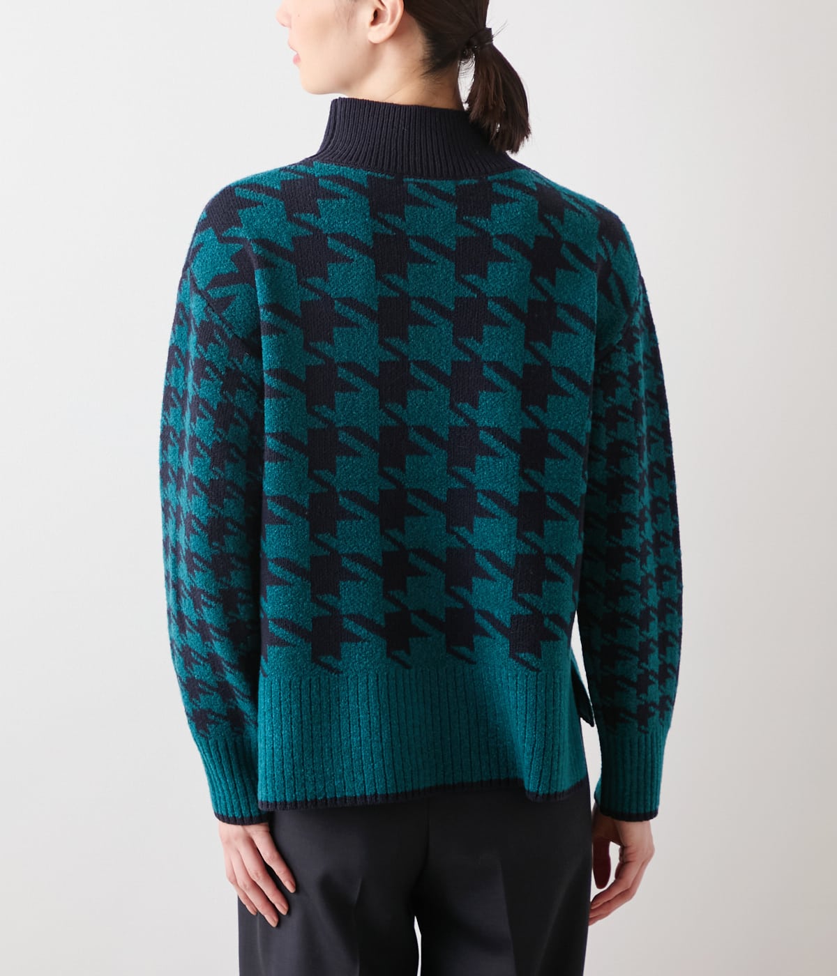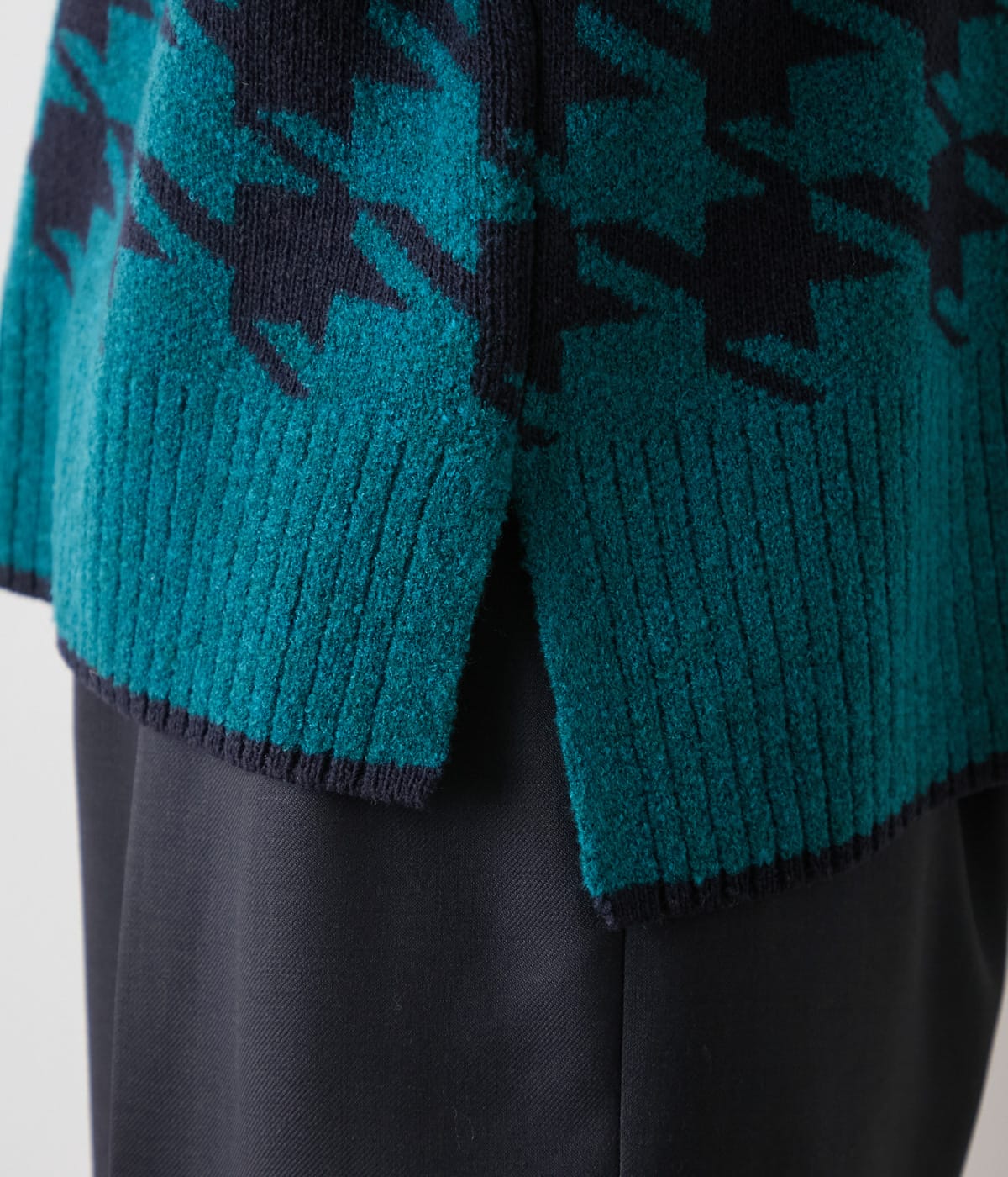 身頃には大きめの千鳥柄、袖には小さめの千鳥柄をあしらい、オリジナリティのある仕上がりに。程よくゆとりを持たせたシルエットで、インナーを重ねてももたつかず快適な着心地です。また、後ろ丈をやや長めに設定しており、気になるヒップラインもナチュラルにカバーできるのが嬉しいポイント。