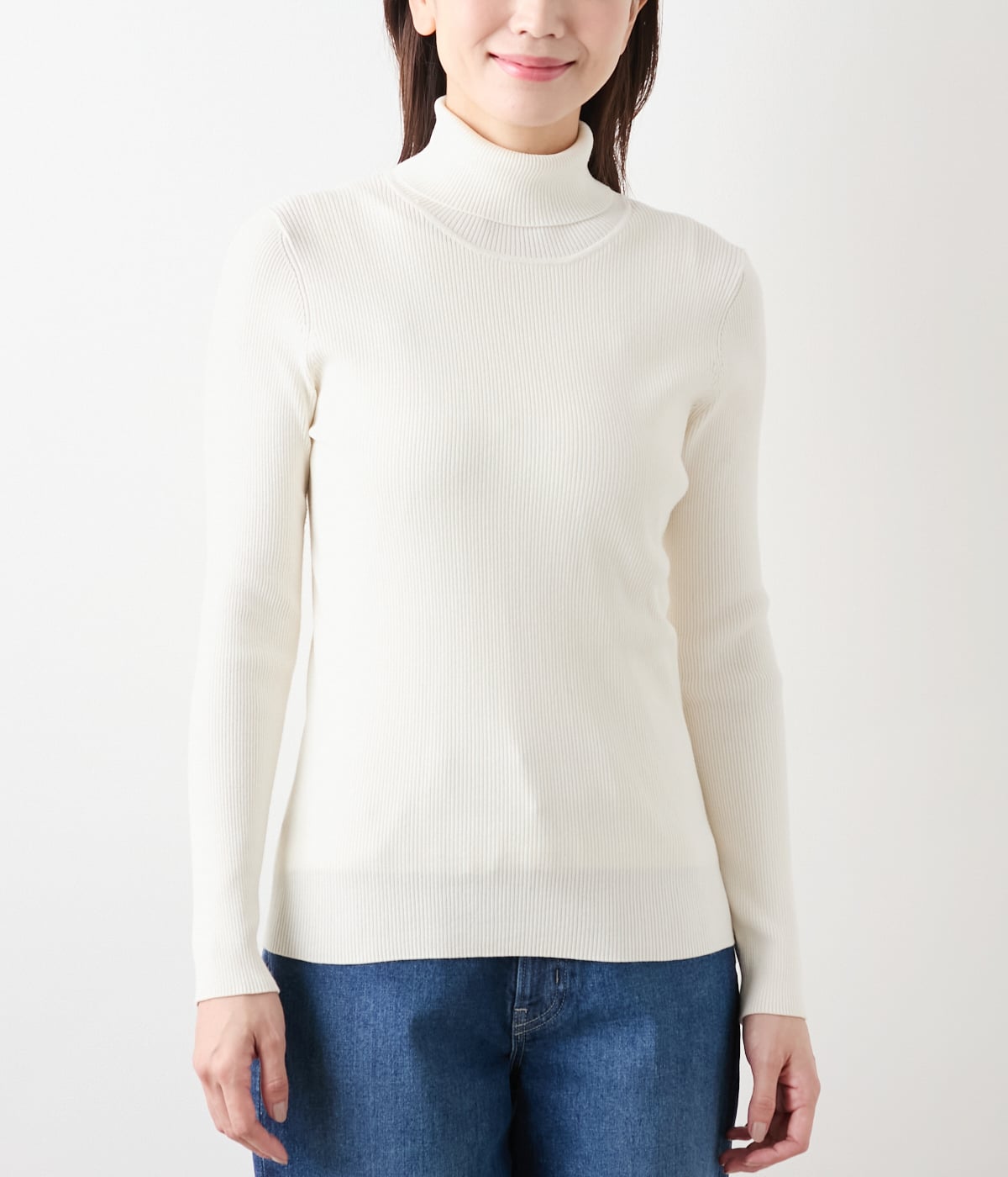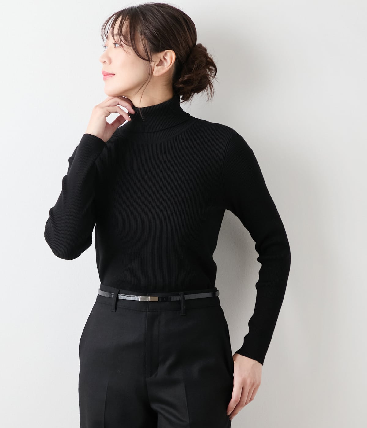 ベーシックなリブ編みのタートルネックプルオーバー。程よいフィット感で身体のラインをすっきり見せつつ、窮屈さを感じさせない快適な着心地です。シンプルだからこそ着回し力が高く、秋口や春先には1枚で、寒い季節にはインナーとして重宝する万能な一着です。