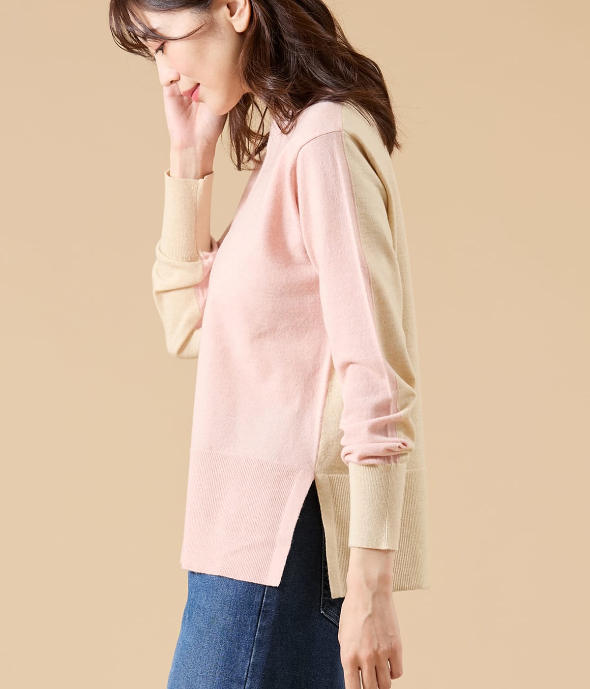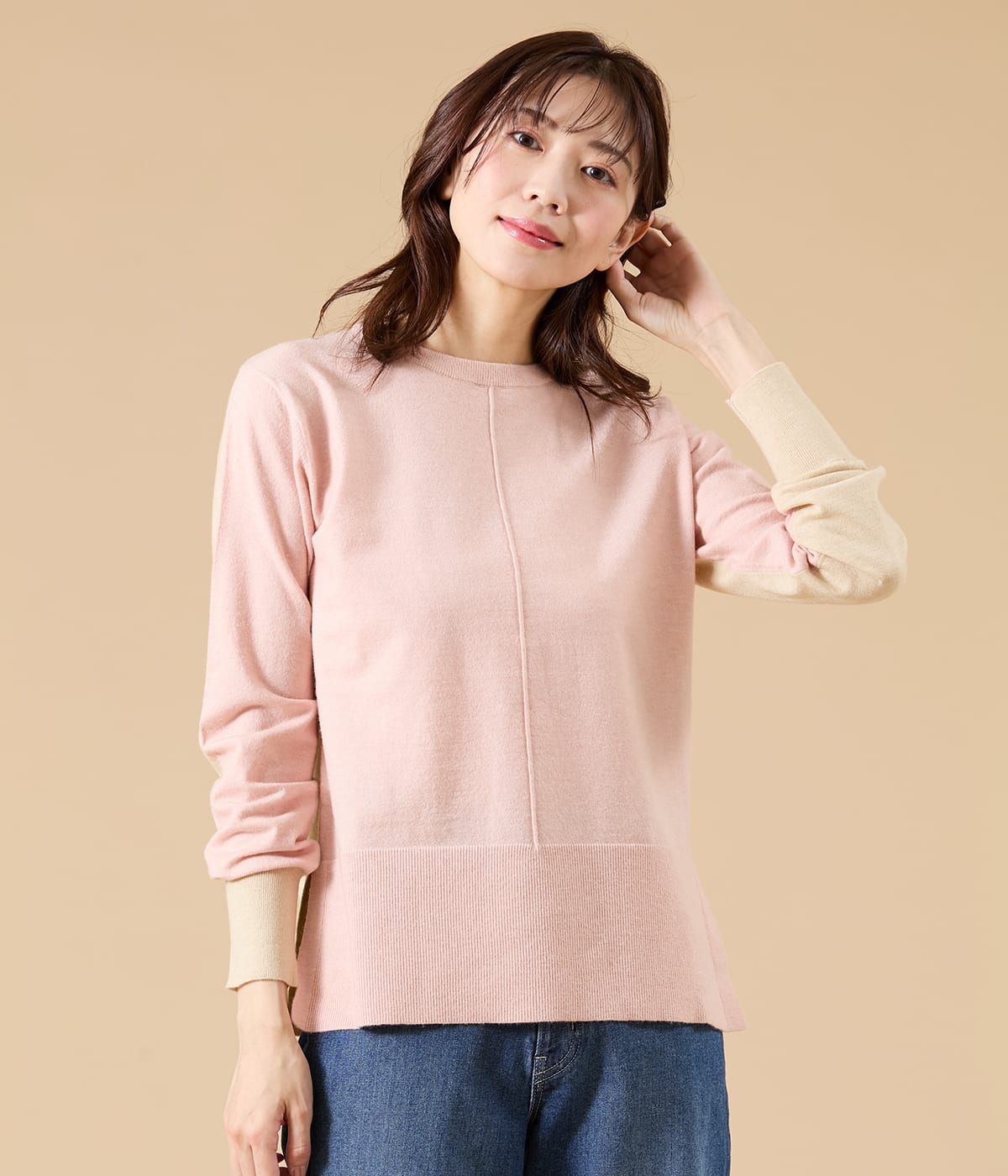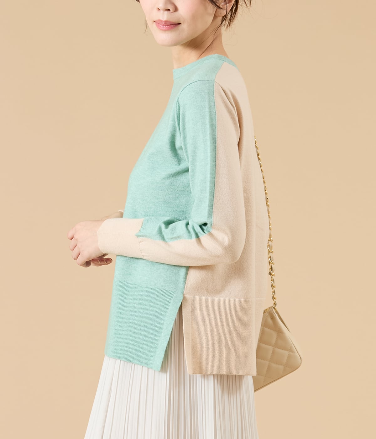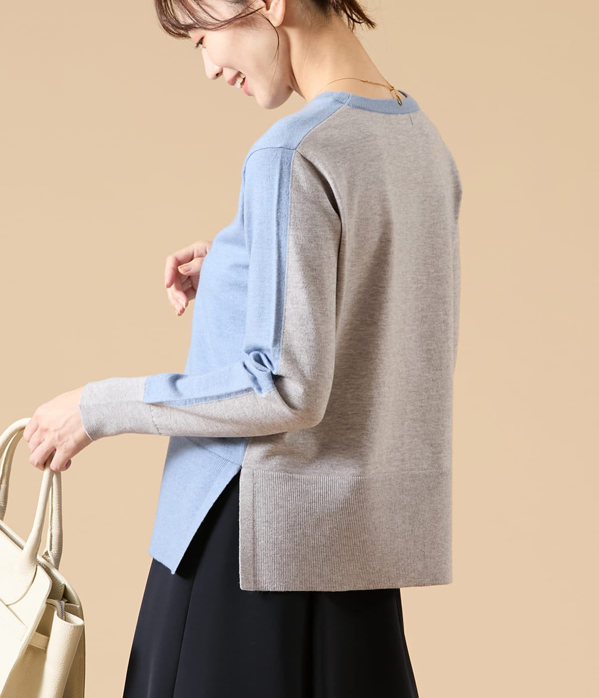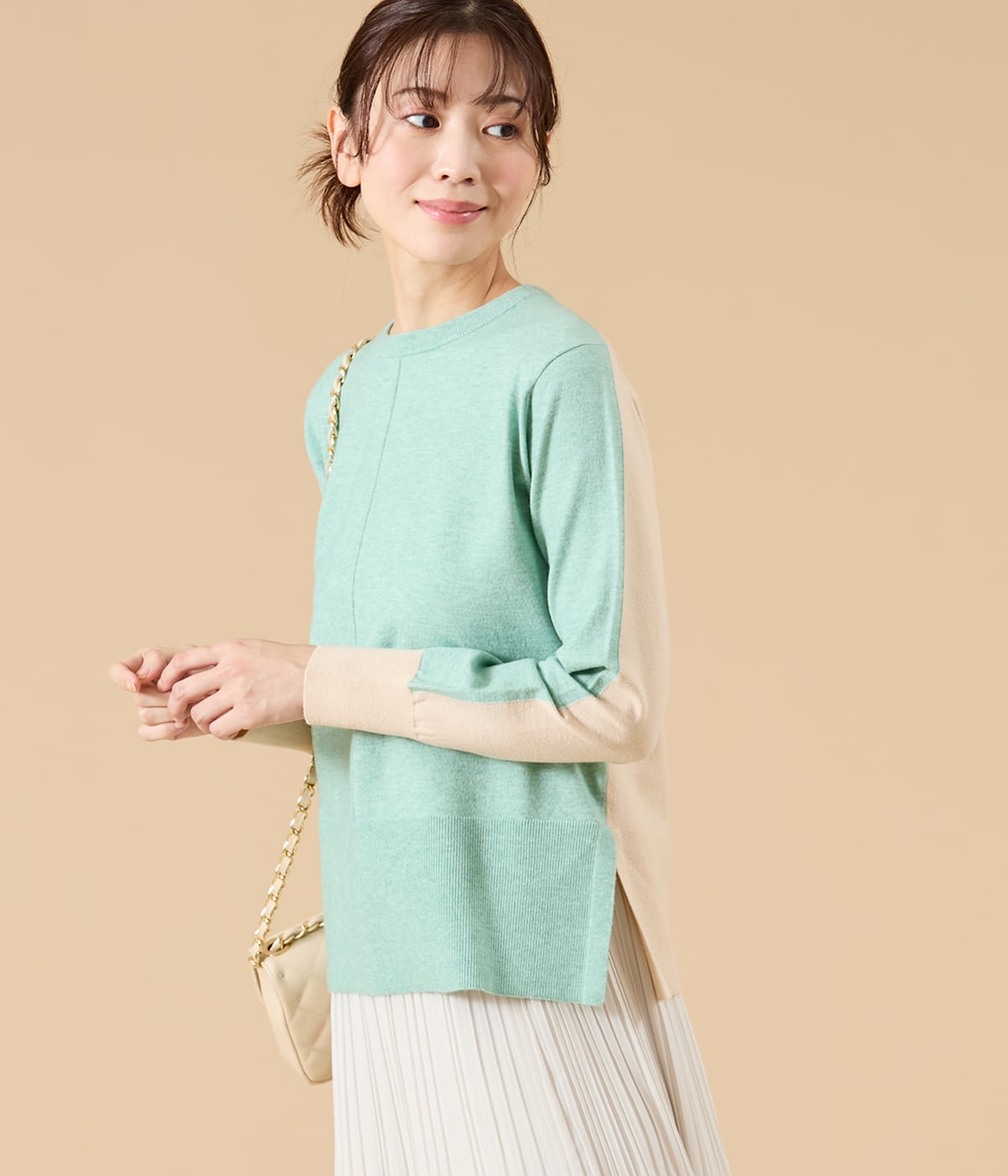 前後で切り替えた優しい配色が、春のスタイリングにほどよい軽さと華やぎを添えるニットプルオーバー。すっきり見えの縦ラインとリラックス感のあるシルエットで、オフィスカジュアルからお出かけまでデイリーに頼れる1枚です。顔色をふわっと明るく見せる好印象なピンク×ベージュ、清潔感のある爽やかさが好印象なライトグリーン×ベージュ、大人のきれいめカジュアルに馴染む都会的なサックス×ライトグレーの3色展開。