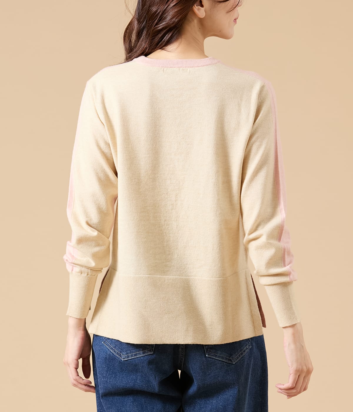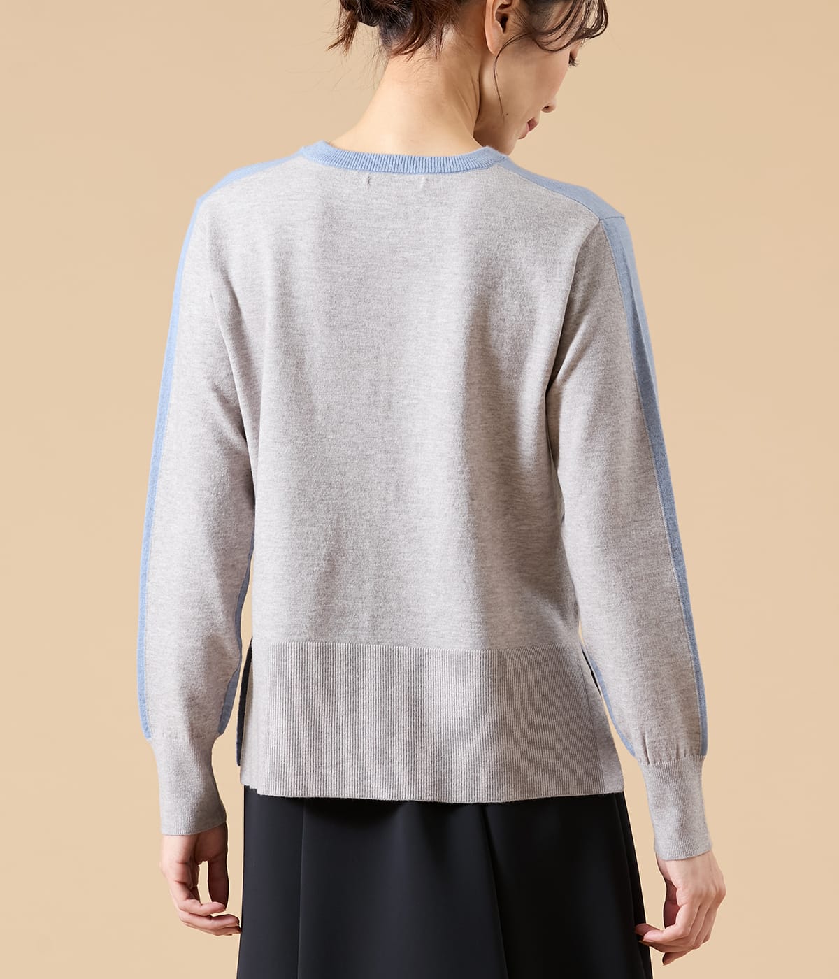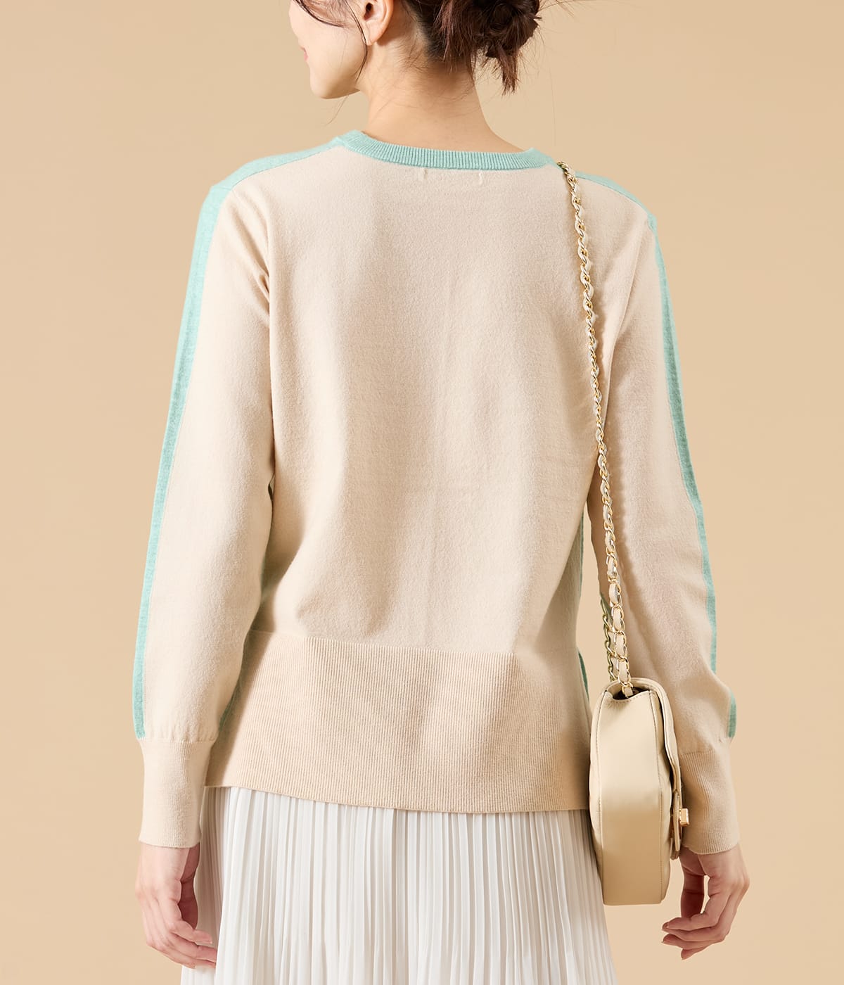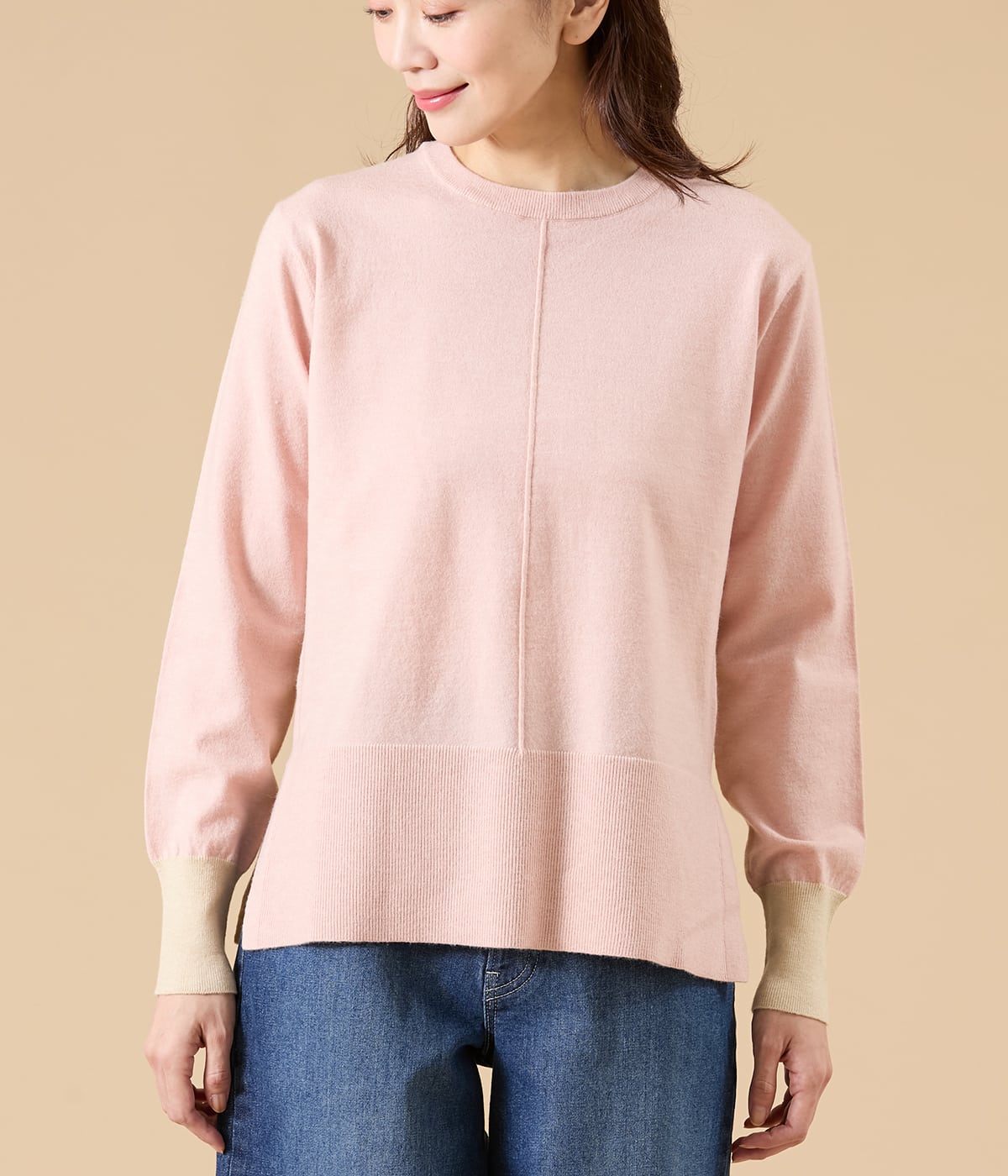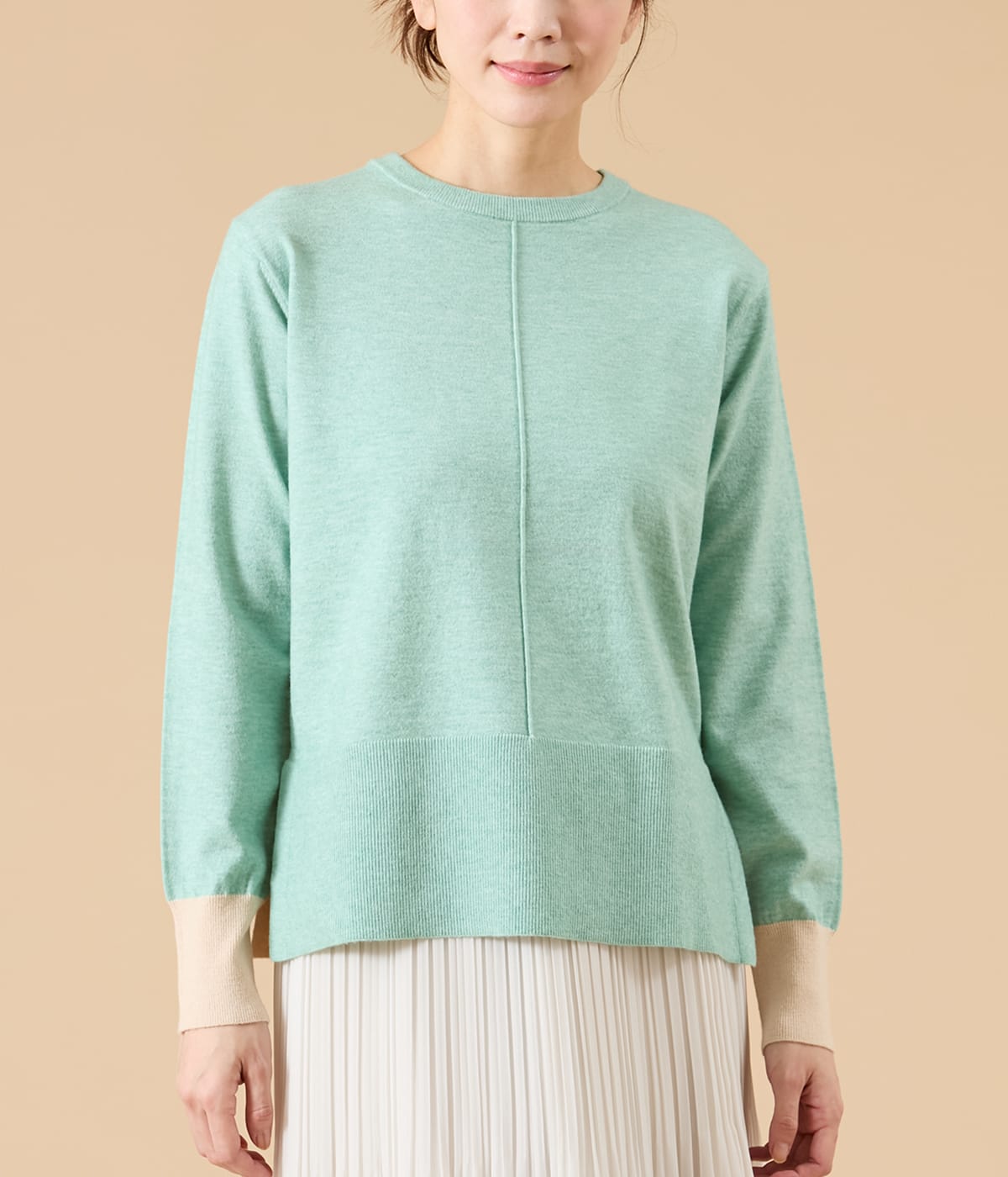 前後で切り替えた優しい配色が、春のスタイリングにほどよい軽さと華やぎを添えるニットプルオーバー。すっきり見えの縦ラインとリラックス感のあるシルエットで、オフィスカジュアルからお出かけまでデイリーに頼れる1枚です。顔色をふわっと明るく見せる好印象なピンク×ベージュ、清潔感のある爽やかさが好印象なライトグリーン×ベージュ、大人のきれいめカジュアルに馴染む都会的なサックス×ライトグレーの3色展開。