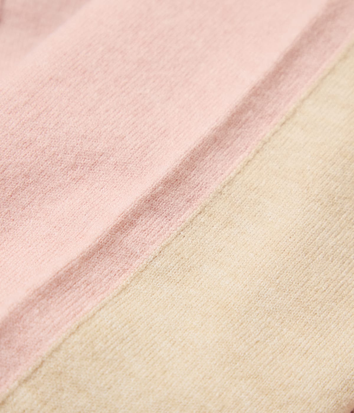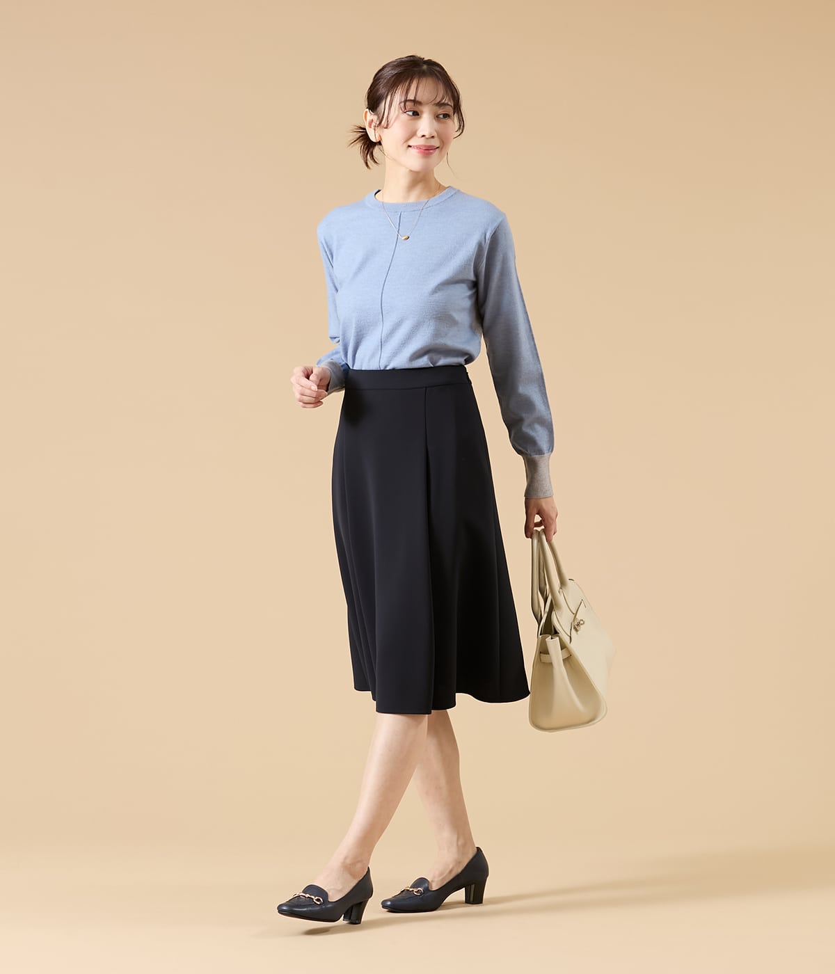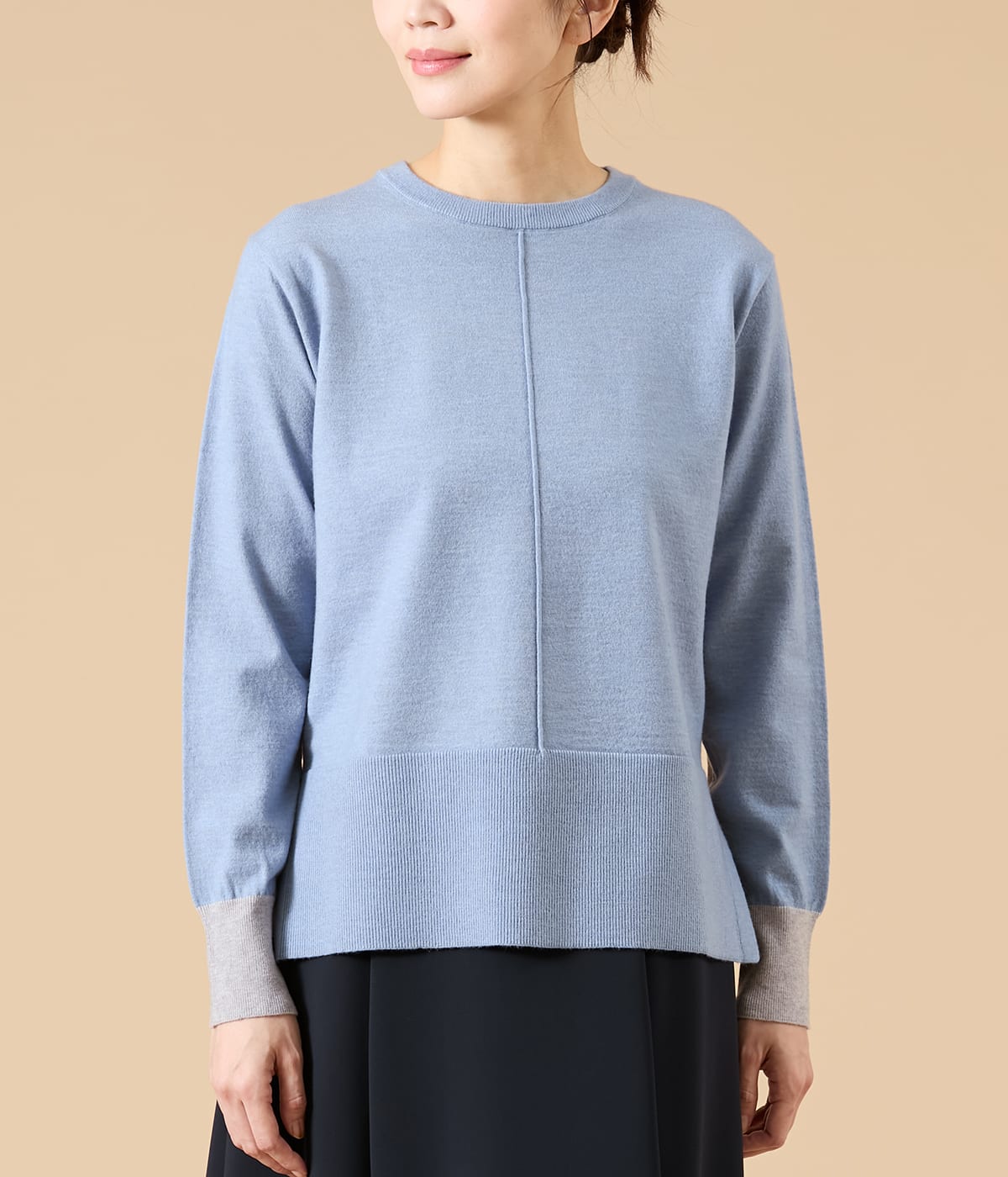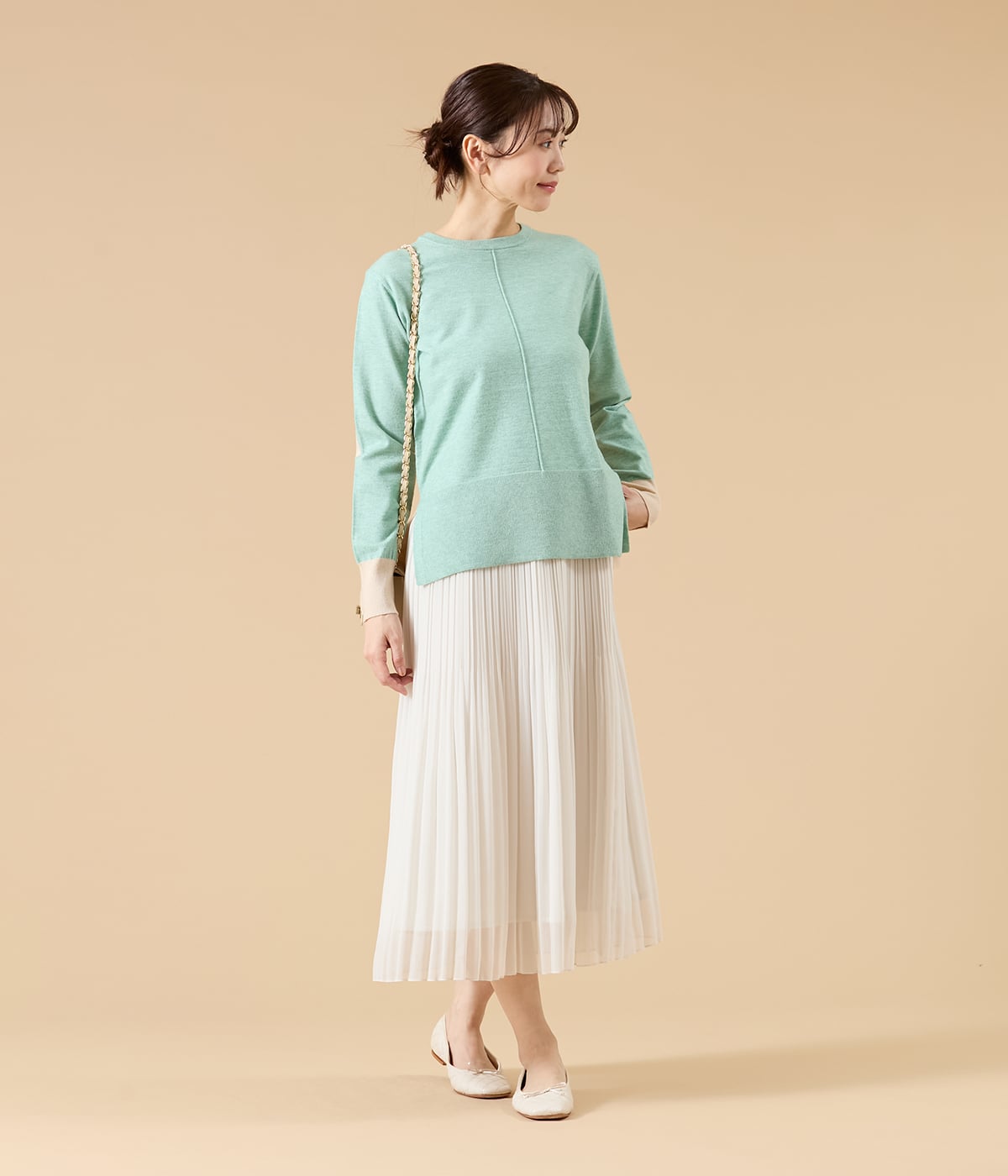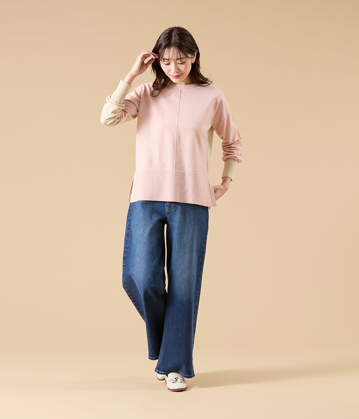 前後で切り替えた優しい配色が、春のスタイリングにほどよい軽さと華やぎを添えるニットプルオーバー。すっきり見えの縦ラインとリラックス感のあるシルエットで、オフィスカジュアルからお出かけまでデイリーに頼れる1枚です。顔色をふわっと明るく見せる好印象なピンク×ベージュ、清潔感のある爽やかさが好印象なライトグリーン×ベージュ、大人のきれいめカジュアルに馴染む都会的なサックス×ライトグレーの3色展開。