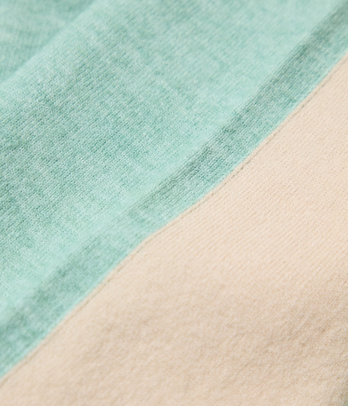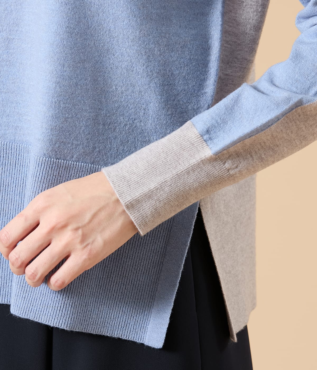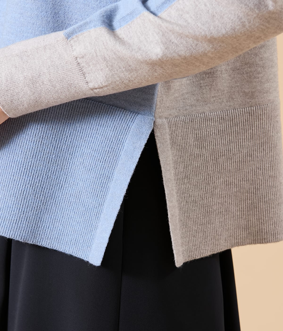 大胆に前後で配色を切り替えた、春らしいムード漂うバイカラーニットプルオーバー。脇スリットとゆるめのサイズバランスが自然な抜け感を演出します。フロントにはピンタックを入れ、縦ラインを強調してすっきりと見えるよう仕上げました。