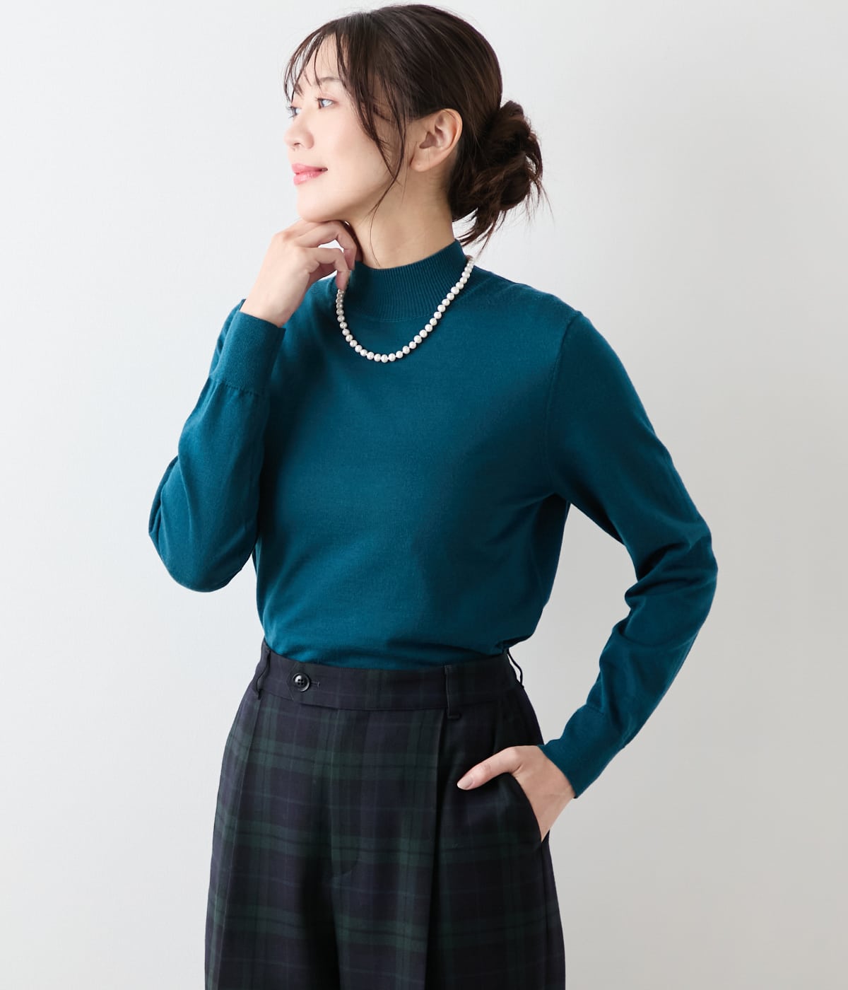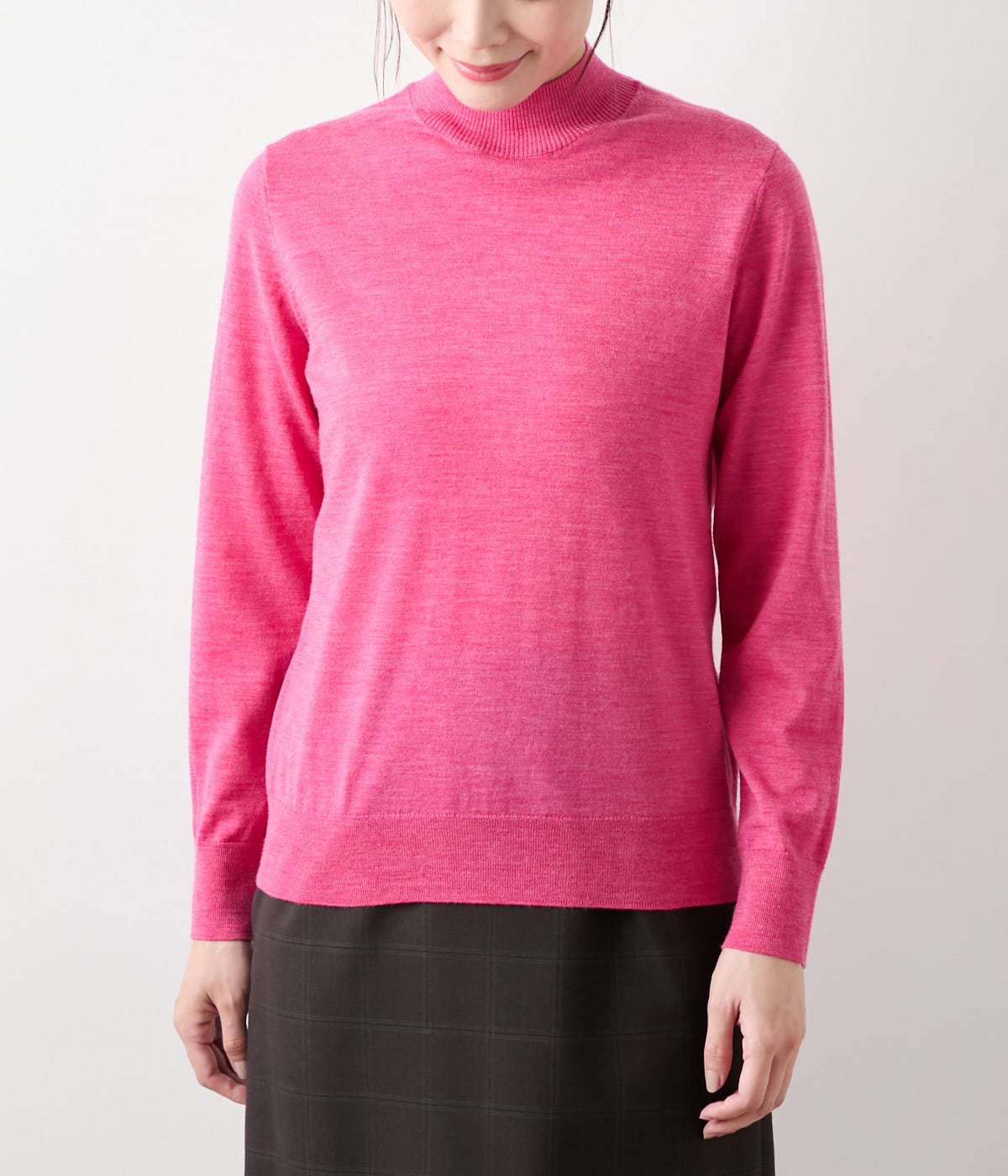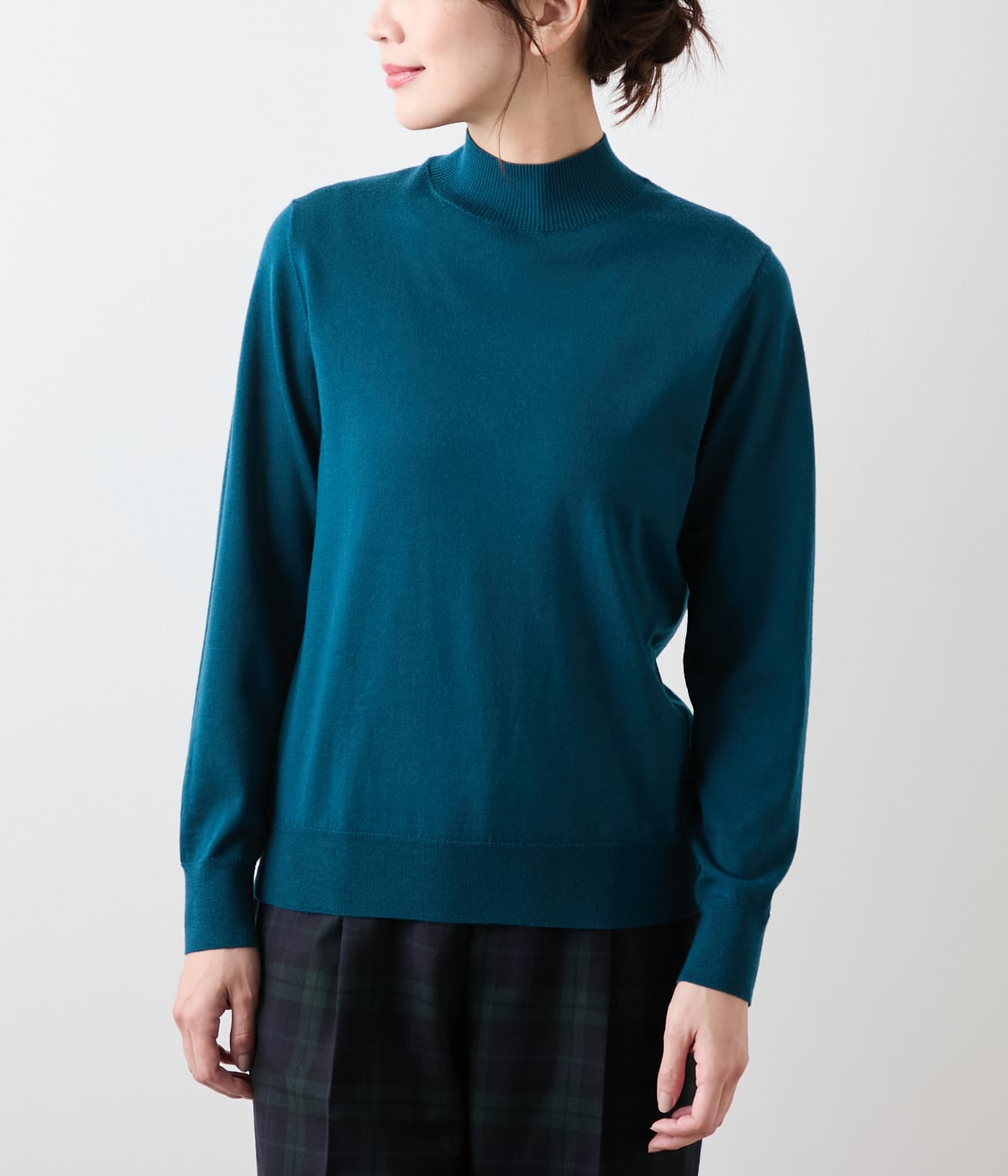 ボトルネックの長袖プルオーバー。襟と袖口、裾をリブ始末にした、着回しやすいベーシックなデザインです。単品ではもちろん、ジャケットやジャンパースカートのインナーとしても幅広くお使いいただけます。
