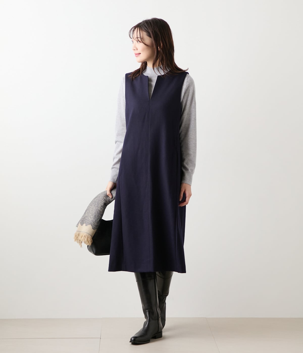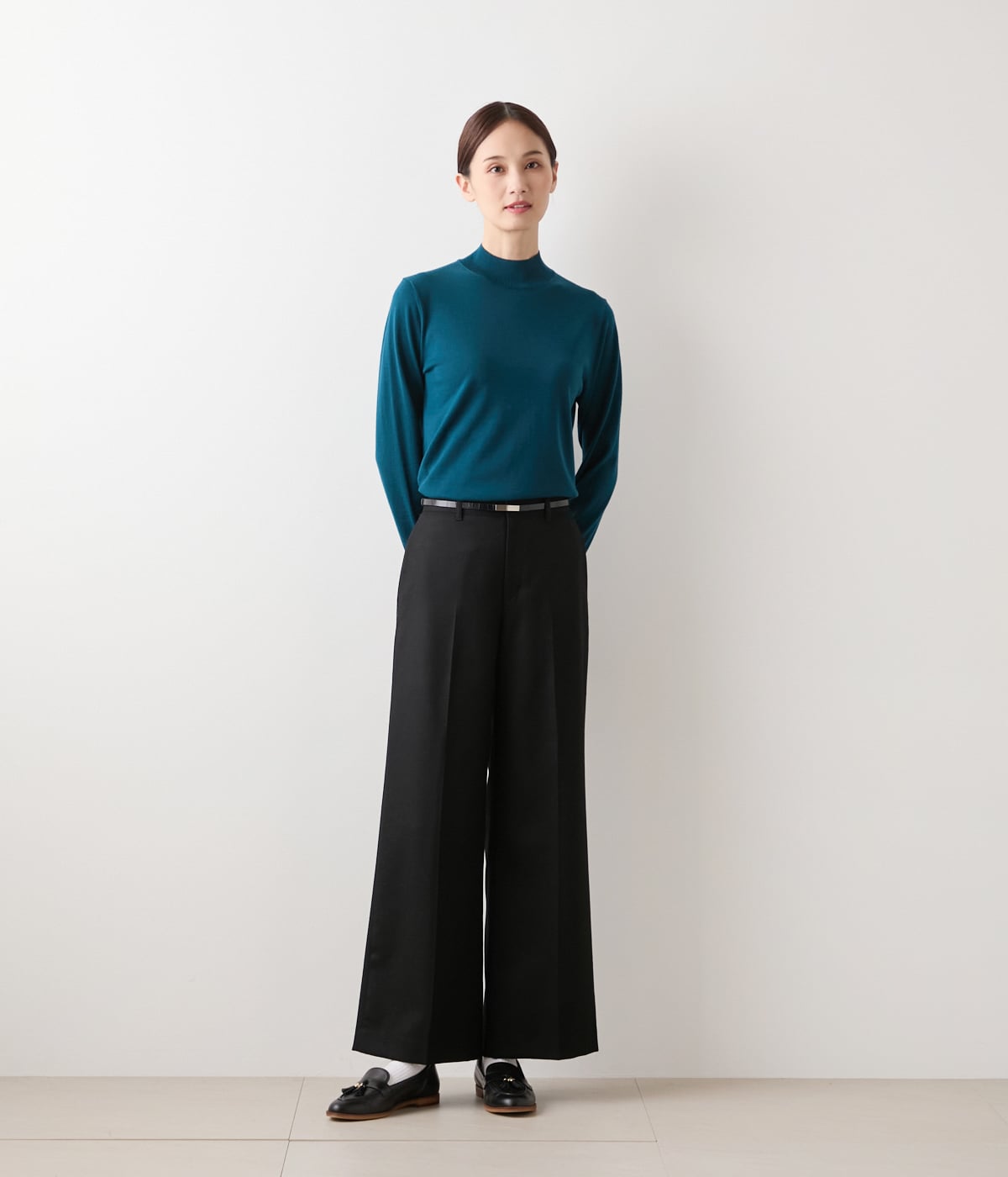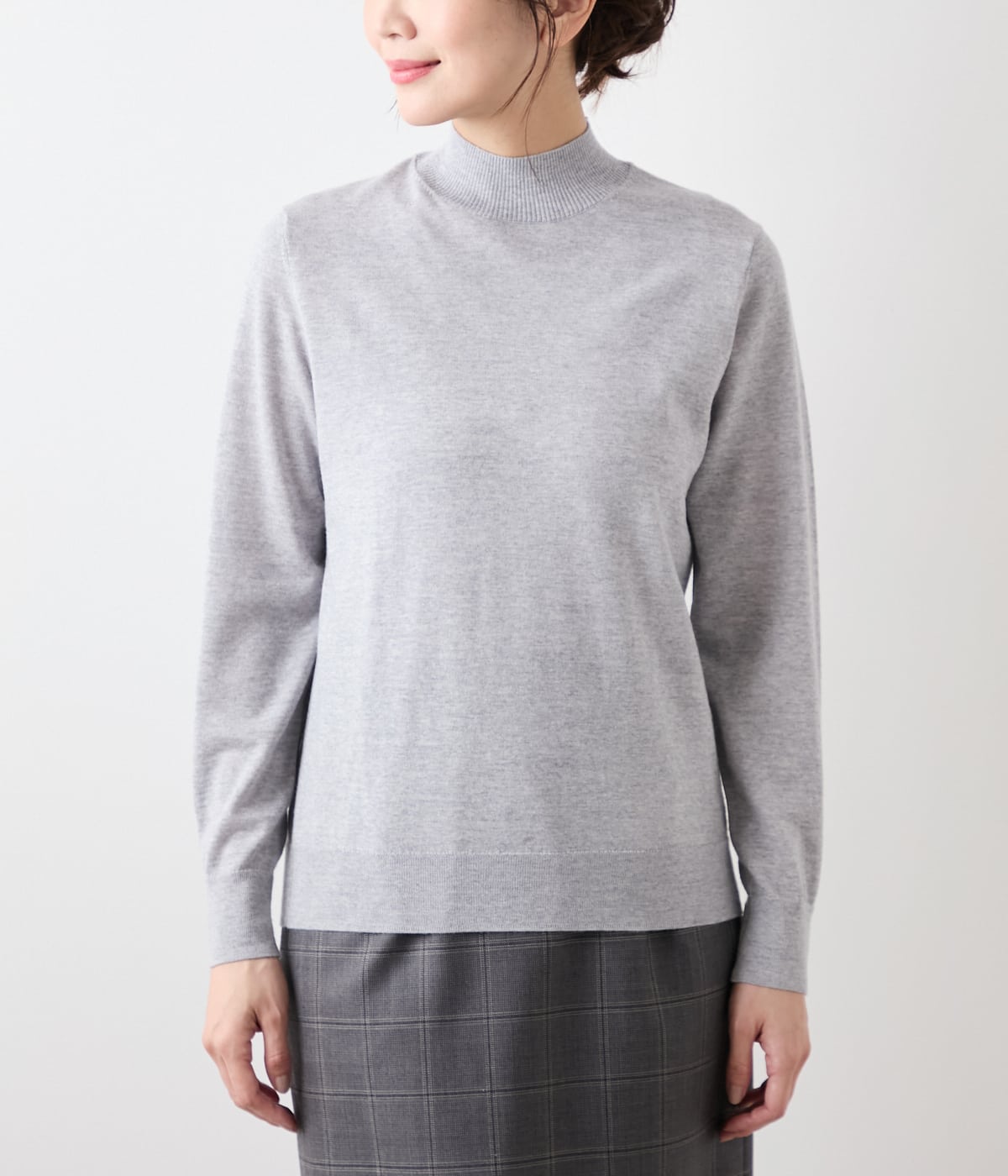 ボトルネックの長袖プルオーバー。襟と袖口、裾をリブ始末にした、着回しやすいベーシックなデザインです。単品ではもちろん、ジャケットやジャンパースカートのインナーとしても幅広くお使いいただけます。