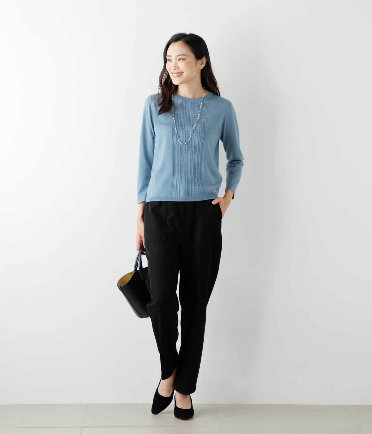 シンプルで着回しやすい、クルーネックの7分袖プルオーバー。前中心に太さの異なる繊細なケーブル編みを施し、リズムのある編地に仕上げました。また、袖口や裾をリブではなく袋始末にすることで、プレーンな表情に。洗濯による多少の縮みをカバーするため、やや大きめのサイズ感にしています。