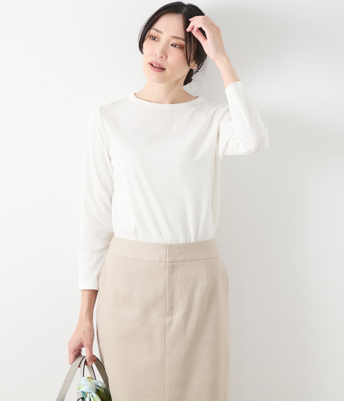 ラウンドネックの9分袖プルオーバー。襟ぐりや袖口、裾に施した同色の3本針ステッチがさりげないアクセントに。両脇からカーブさせた裾のテールもポイントです。