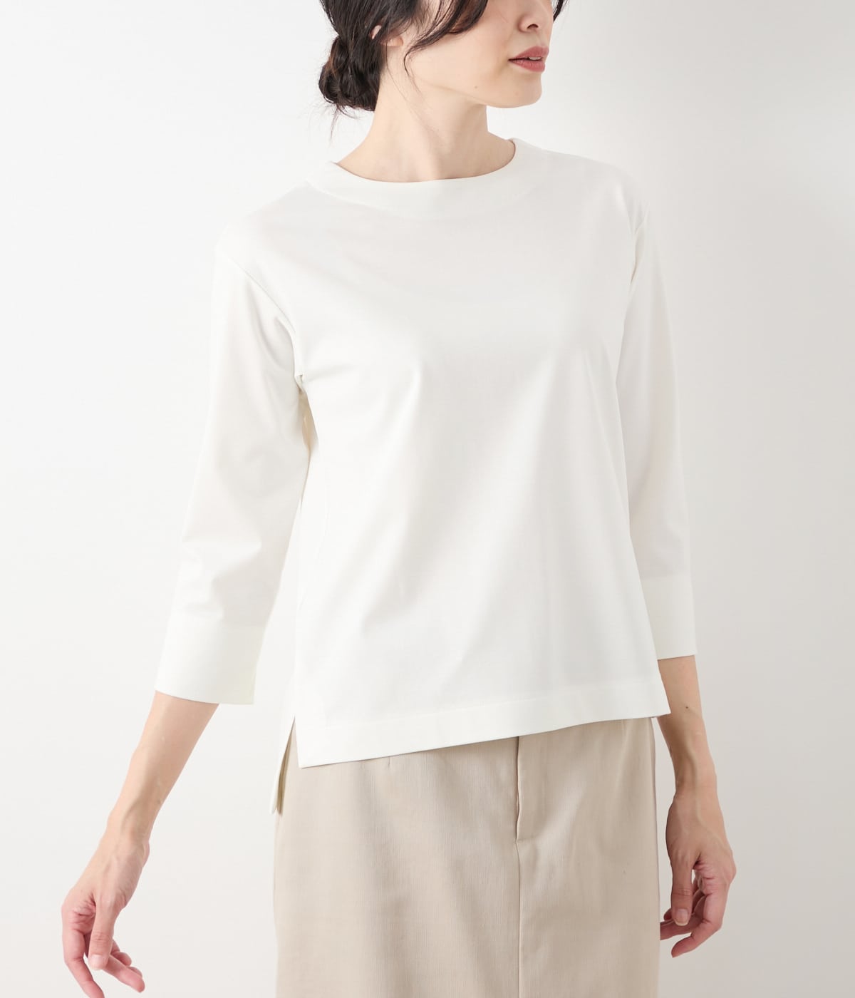 クルーネックの7分袖プルオーバー。襟ぐりや裾を見返し始末にすることで、すっきりとした見え感にこだわりました。袖口のスリットは、折り返して着用いただくことも可能です。着丈は前後差を付け、前はすっきりと、後ろは腰周りをカバーしてくれるバランスに仕上げました。