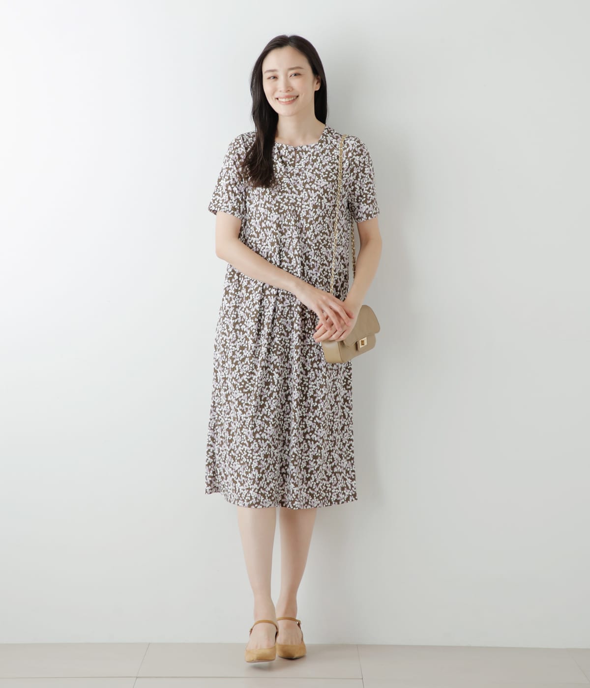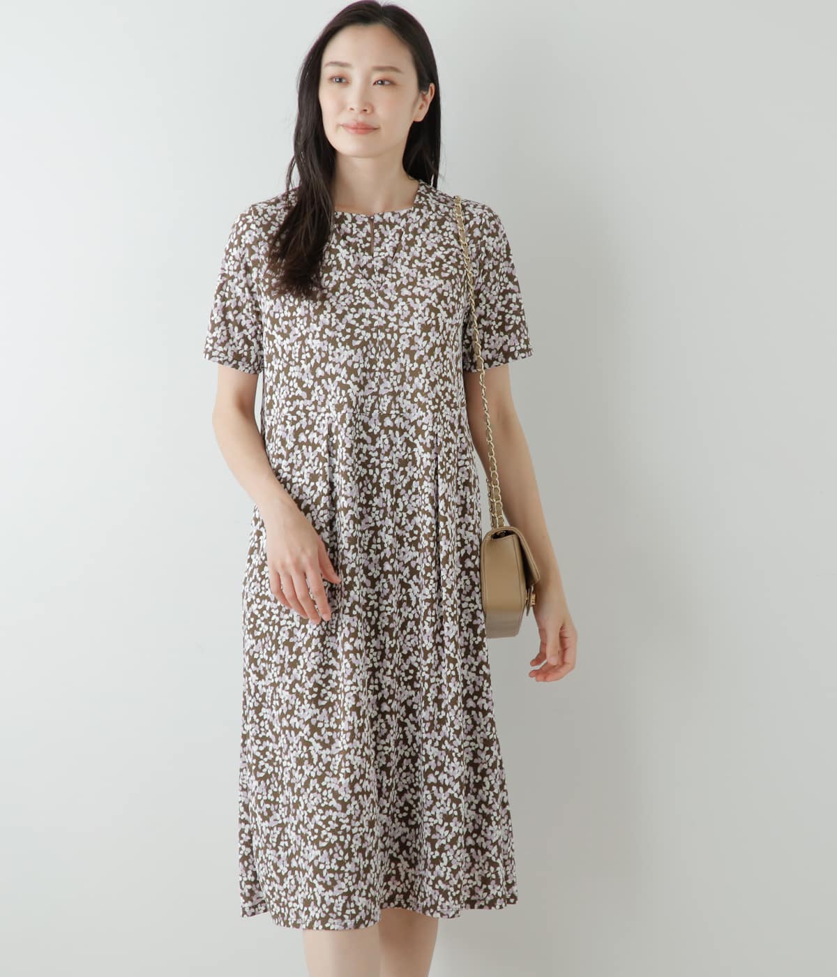 着心地快適なカットソー素材のワンピース。動きのあるプリントが華やかな、コーディネートの主役になるアイテムです。1枚着はもちろん、合わせるアイテム次第でお仕事からお出かけまで幅広いシーンに対応。カラーはシックなブラウン、きちんと感のあるネイビーの2色展開です。