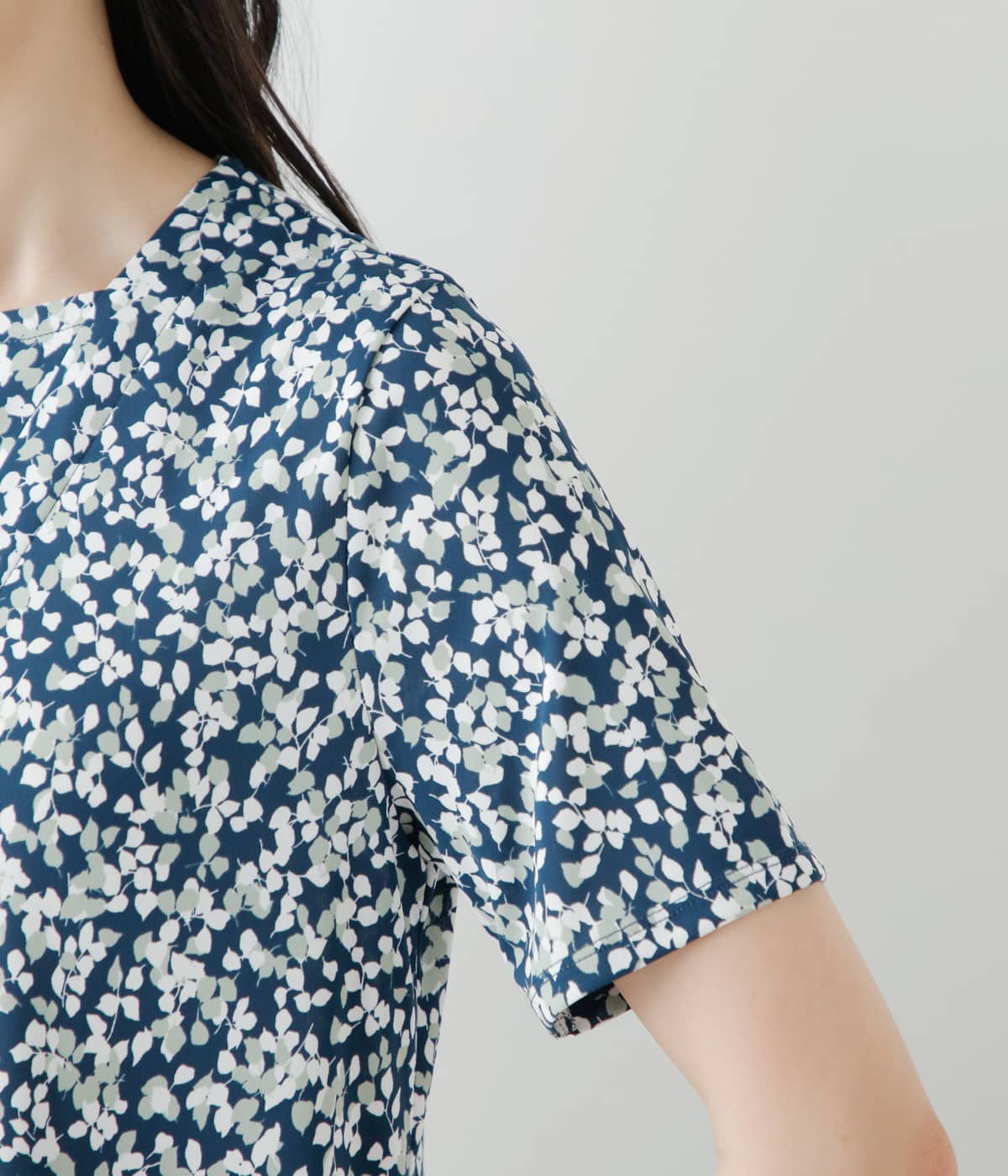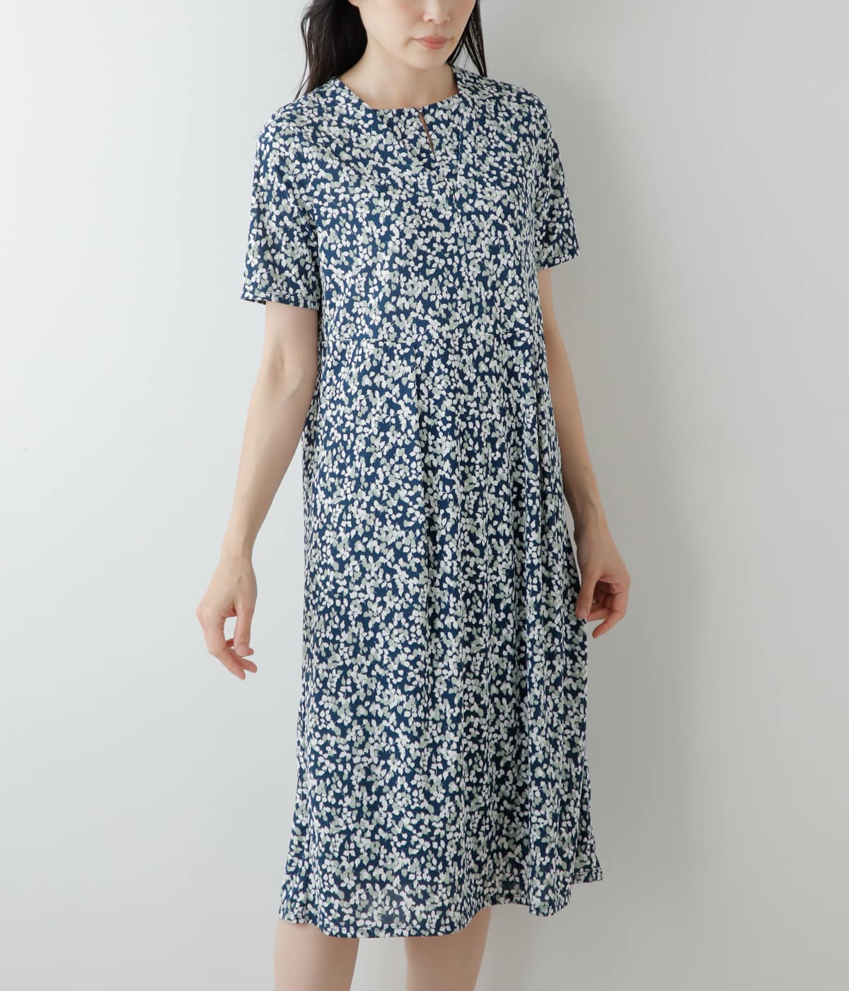 華やかな柄を活かしたシンプルな半袖ワンピース。Vネックの中にキーネックを重ね、顔周りに華やかさをプラスしました。プリントに陰影を与えてくれる、スカート部分のタックもポイントです。裏地あり。ポケットあり。