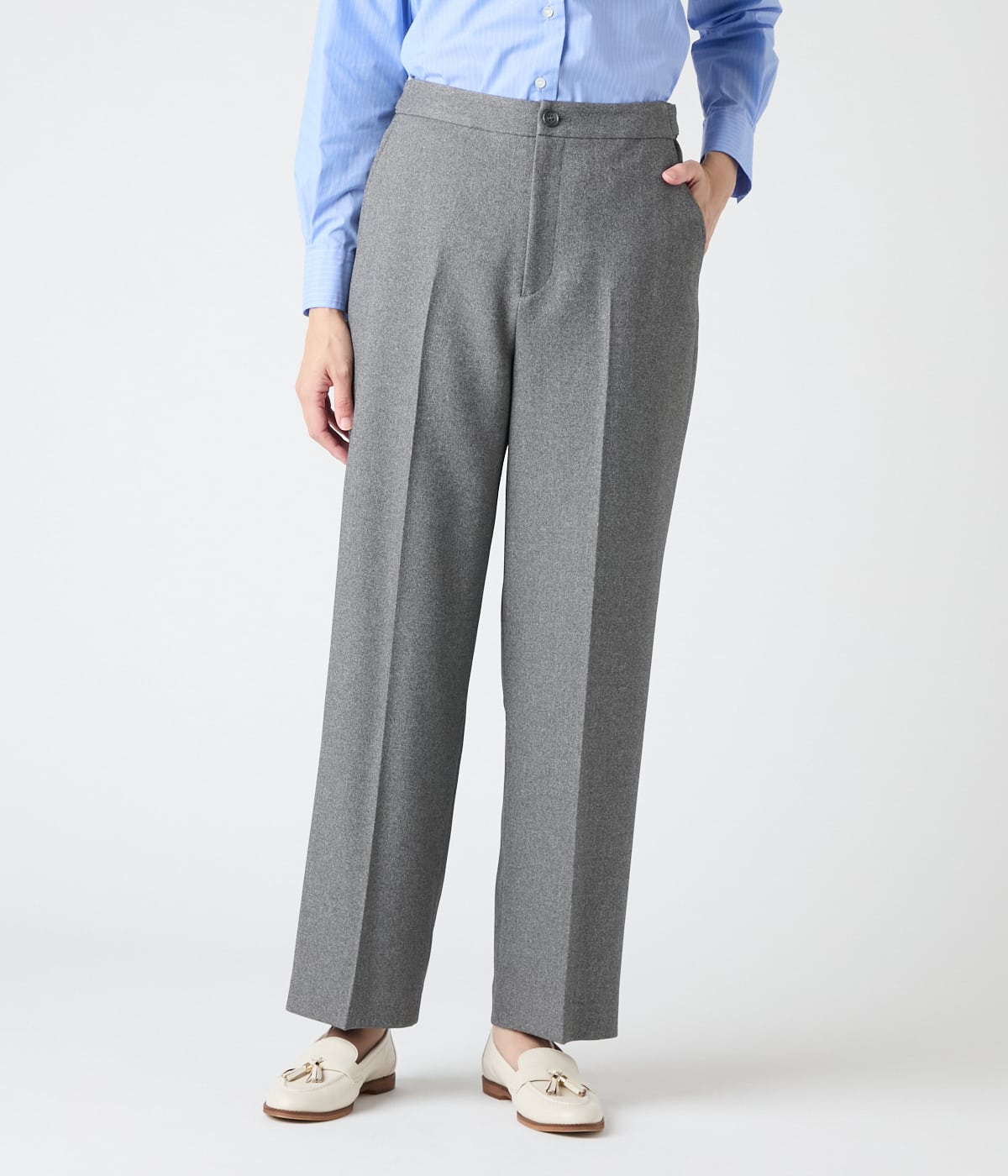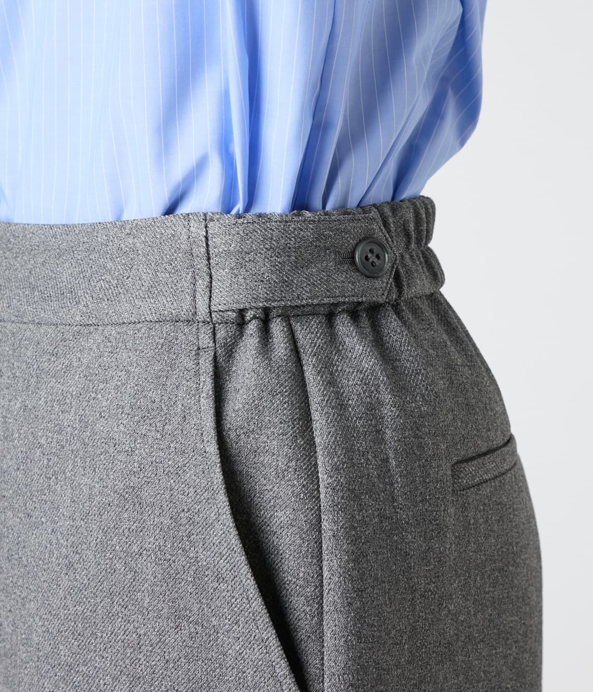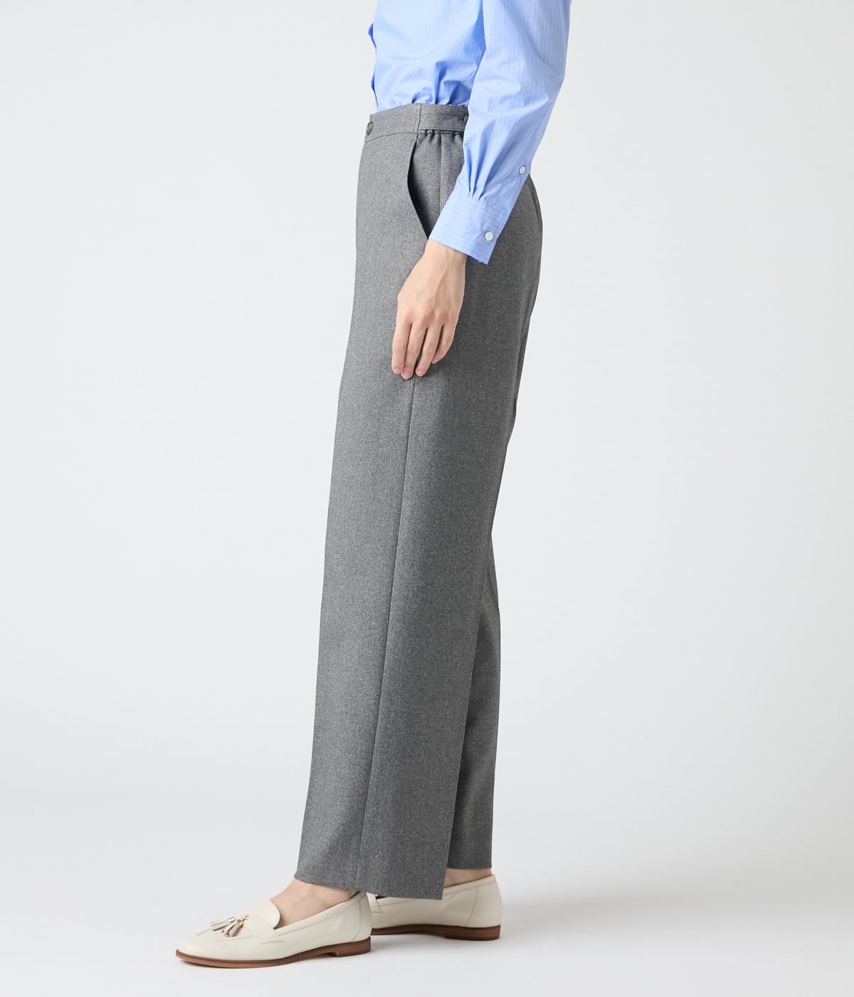 ストレートシルエットのスラックスパンツ。ウエストベルトの脇に、同素材のタブと釦ディテールを仕上げた、さりげないデザインがポイントです。また、後ろウエストがゴム仕様のため、締め付けすぎず快適な穿き心地をサポートしてくれます。裏地あり。ポケットあり。