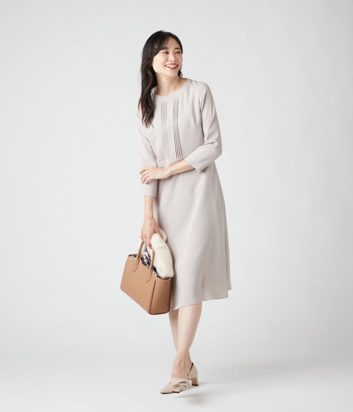 クルーネックのワンピース。クラシカルな雰囲気を演出する、フロントのピンタックがポイントです。手首が覗く8分袖は、スリットを入れて軽やかさをプラス。また、ウエスト切り替えから広がるフレアラインで、メリハリのある女性らしいシルエットに仕上げました。裏地あり。ポケットなし。