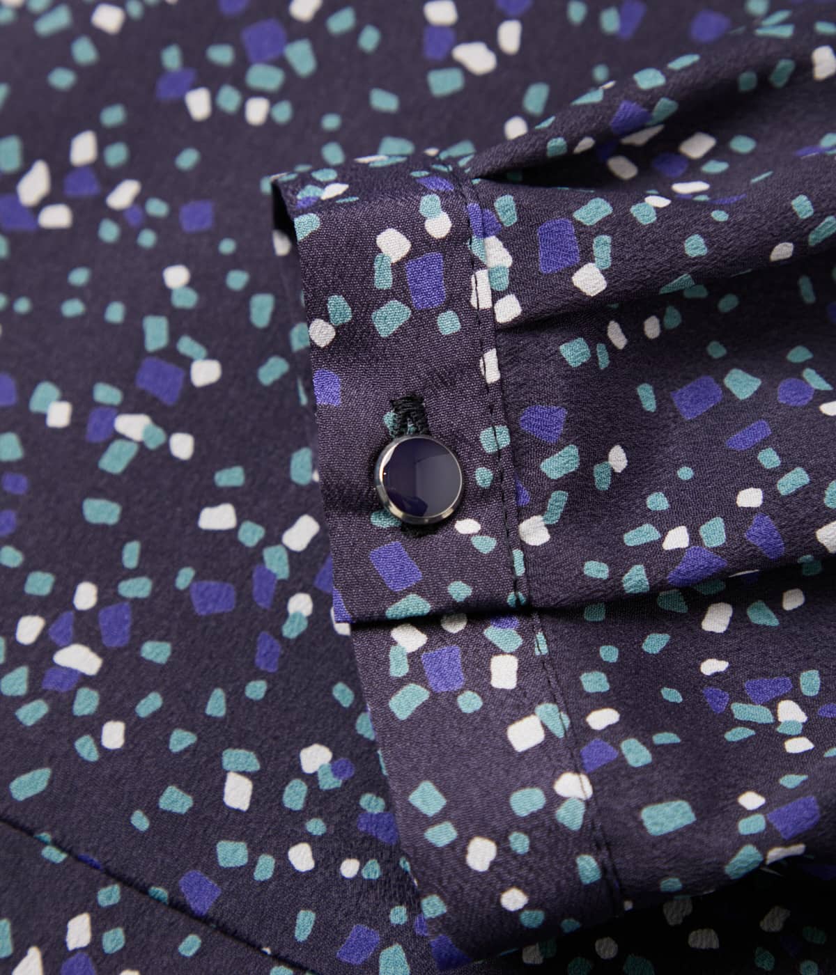 軽やかで落ち感の美しいポリエステル素材。ダークカラーに差し色をプラスしたモザイク柄が、洗練された印象へ導きます。また、ご自宅で手洗いが可能です。