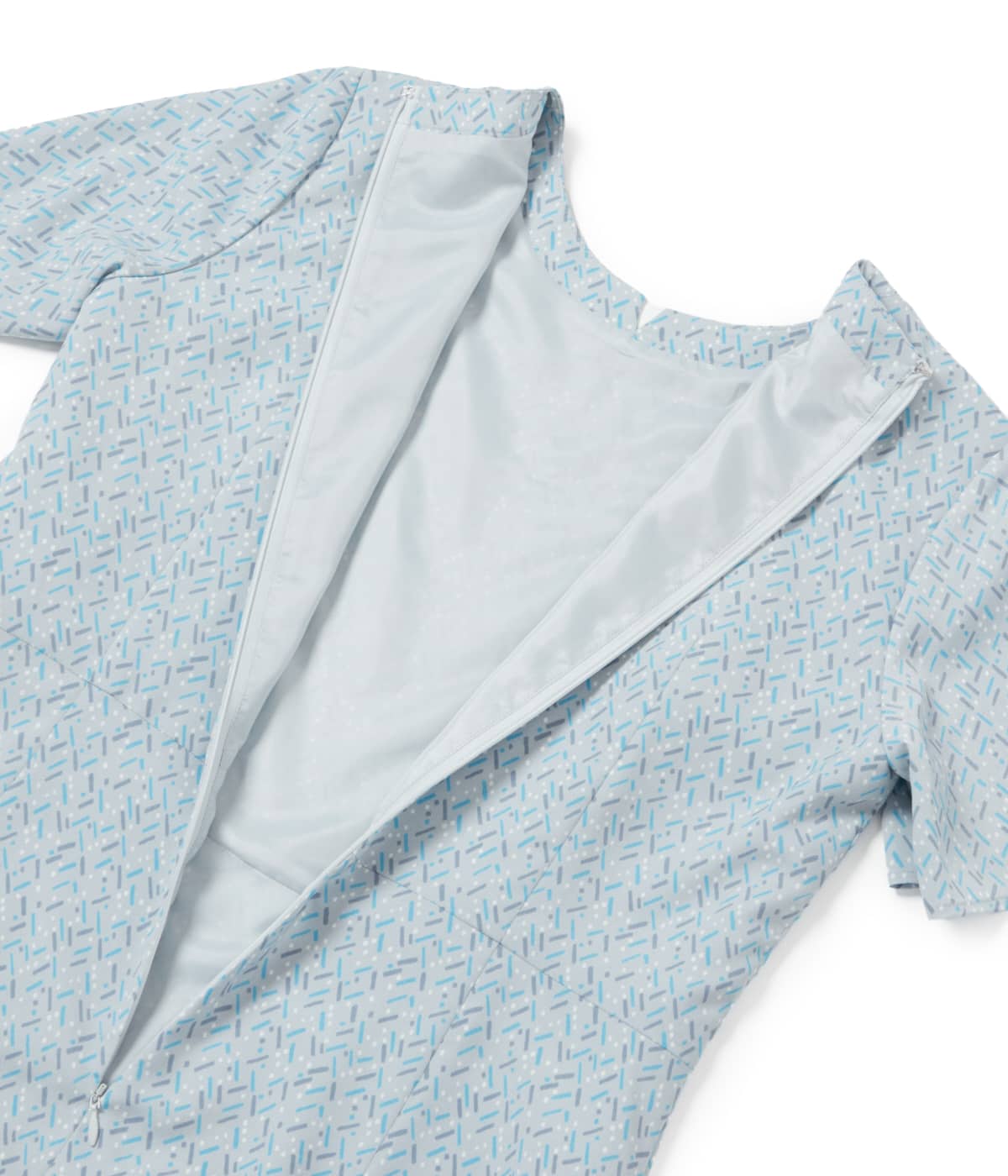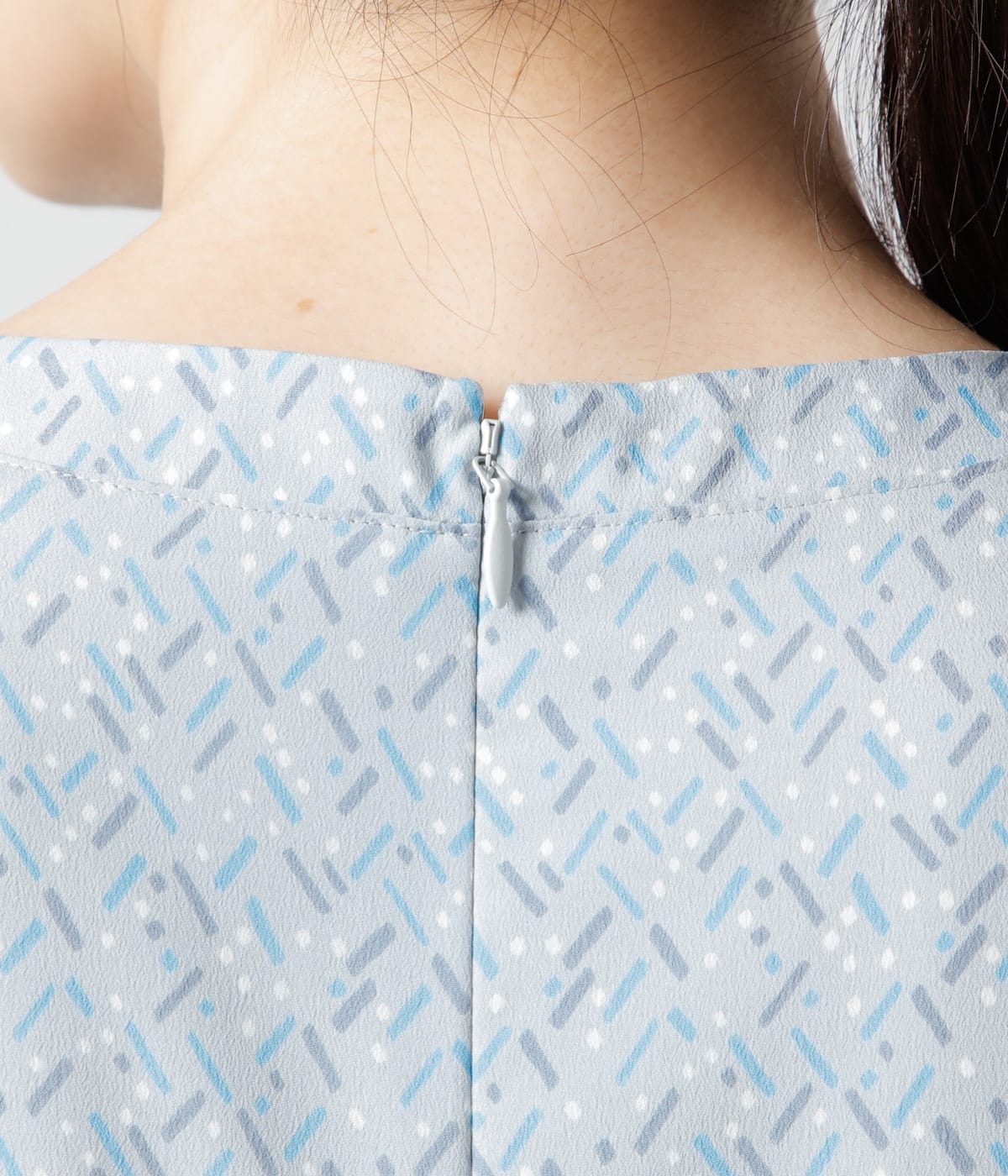 薄手で落ち感のある、ポリエステル100%のデシン素材。ブルーとグレーで表現したランダムバープリントが、爽やかで夏らしい印象へ導きます。また、ご自宅で手洗いが可能です。