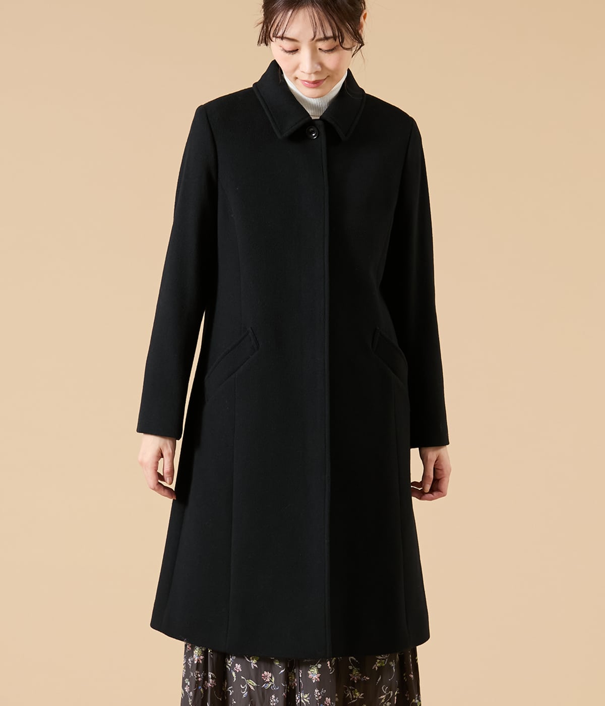 ベーシックなステンカラーコート。ビジネスや冠婚葬祭など、様々なシーンに活躍する1着です。上品な雰囲気を演出する、小ぶりな襟もポイント。裏地あり。ポケットあり。