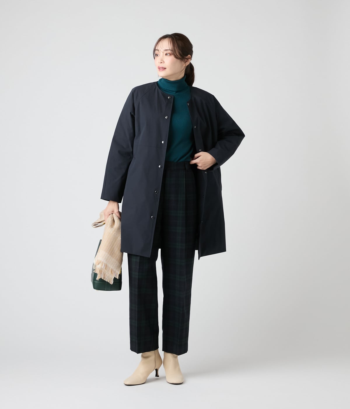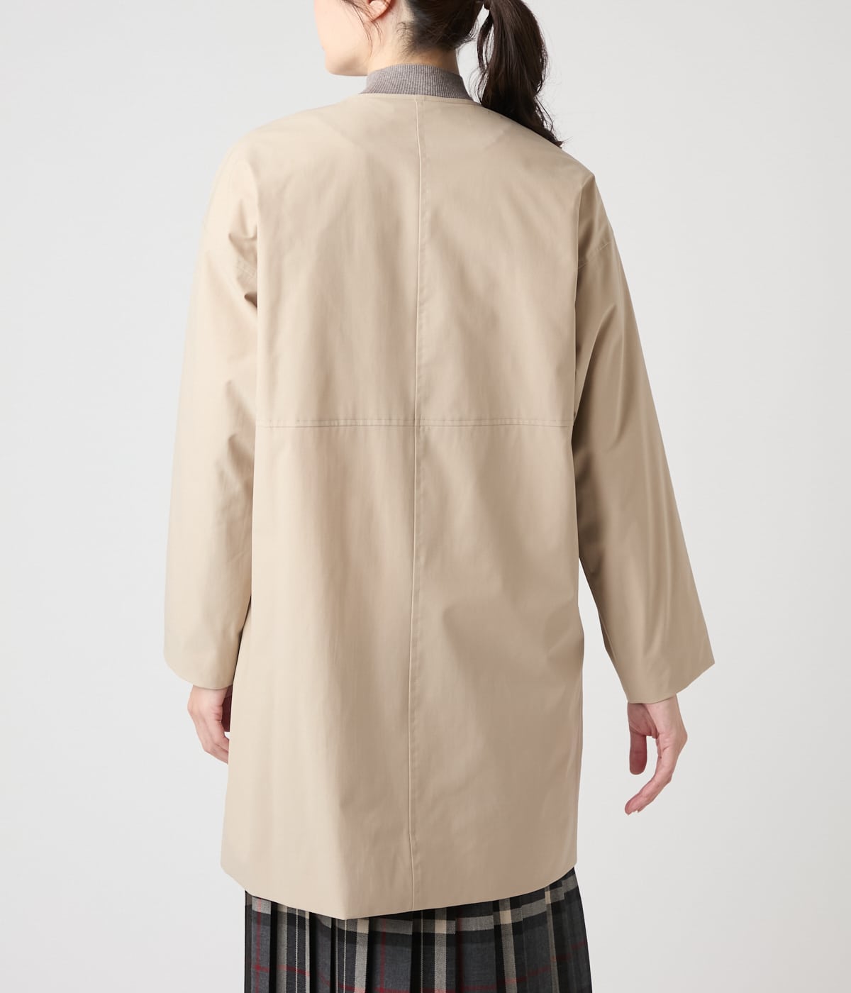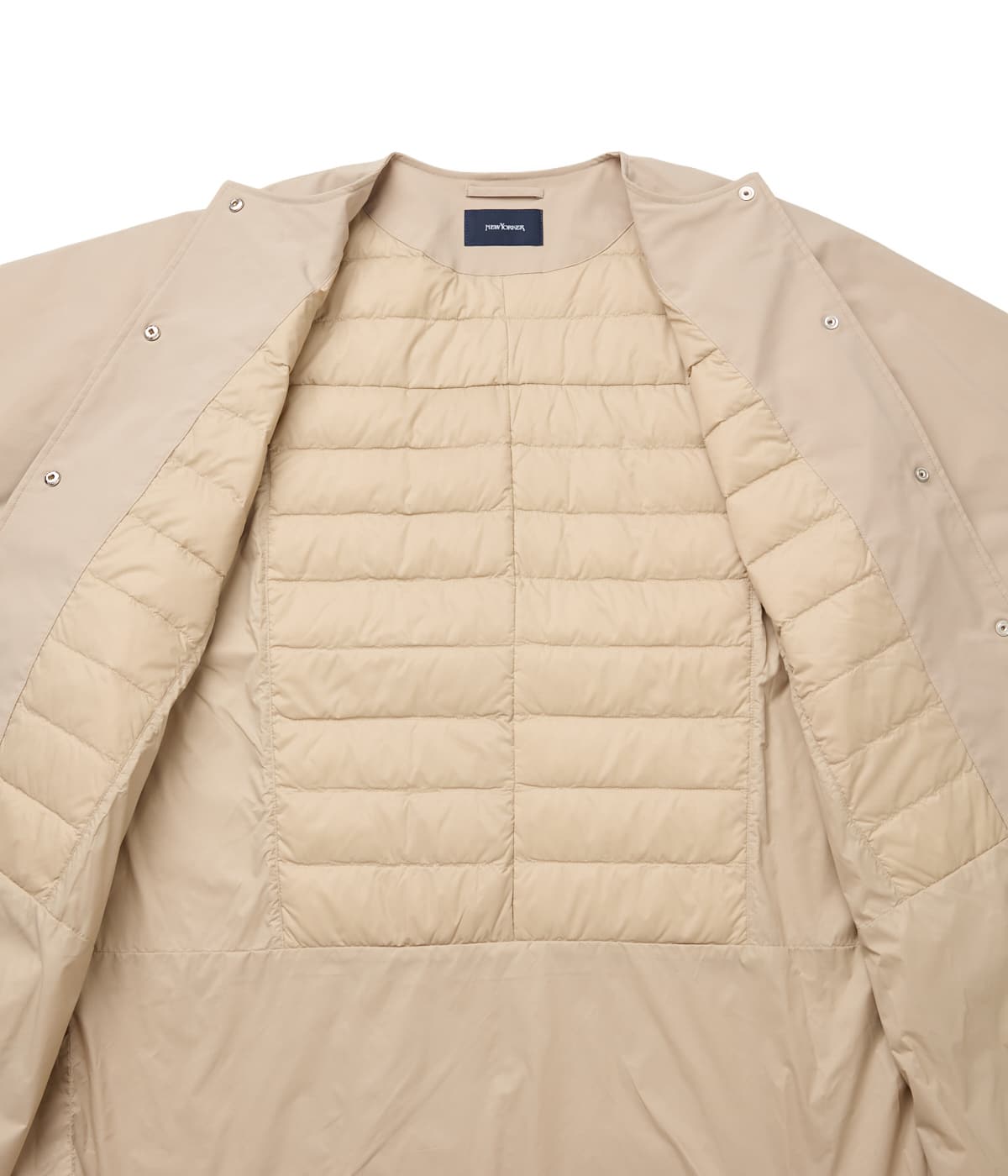 デザイン性がありながら、幅広いシーンで着用いただけるノーカラーコート。裏地の一部にダウンを配しているため、厚手のニットを重ねても着ぶくれしづらくすっきり着こなせます。カラーは汎用性の高いベージュとネイビー2色展開。