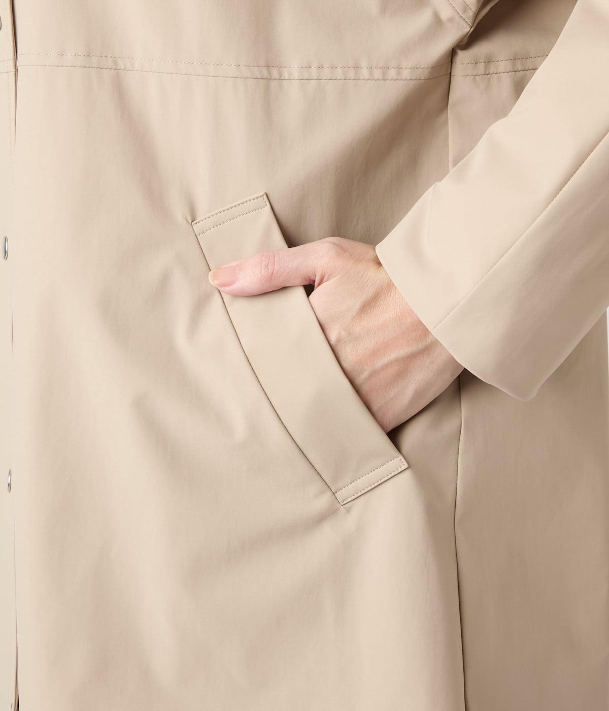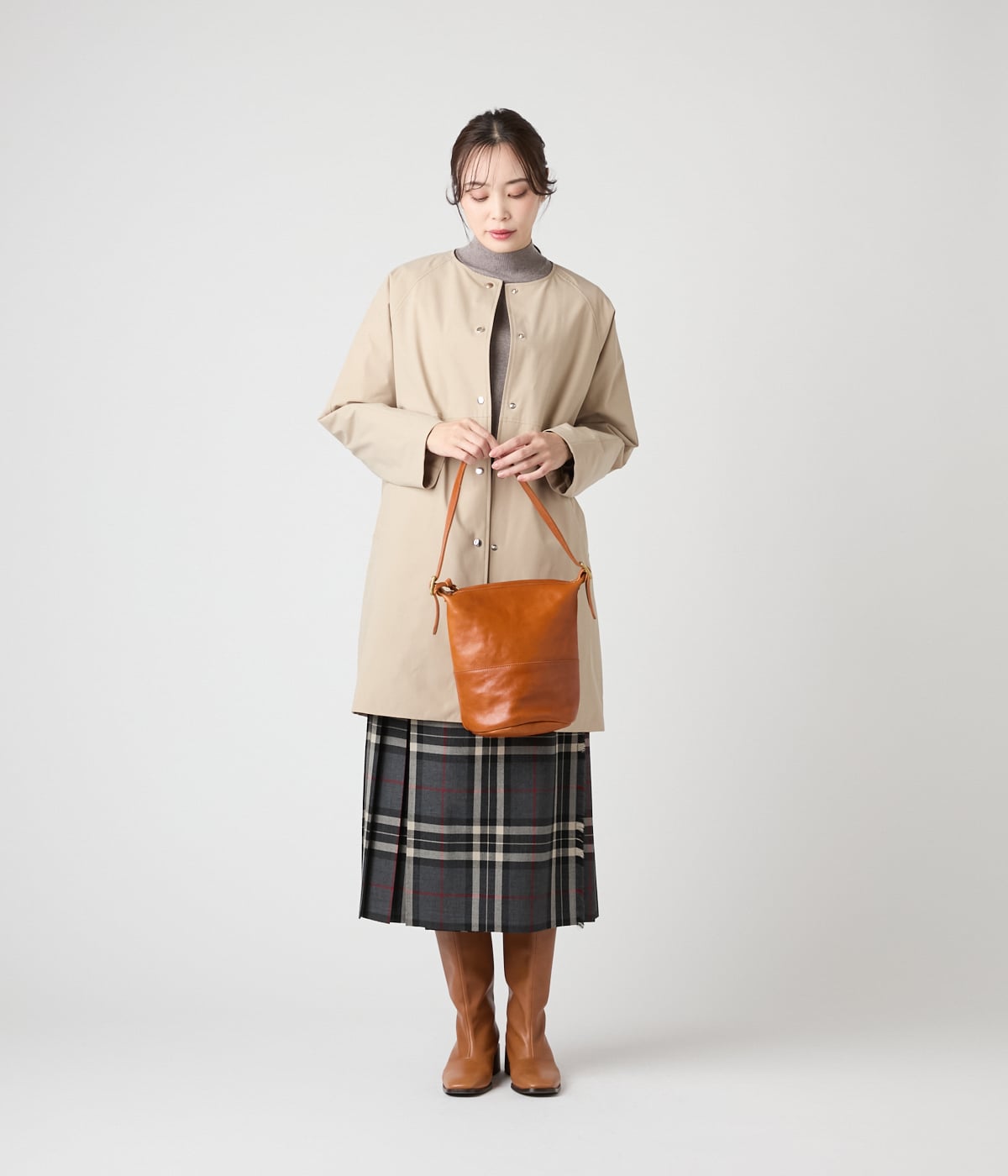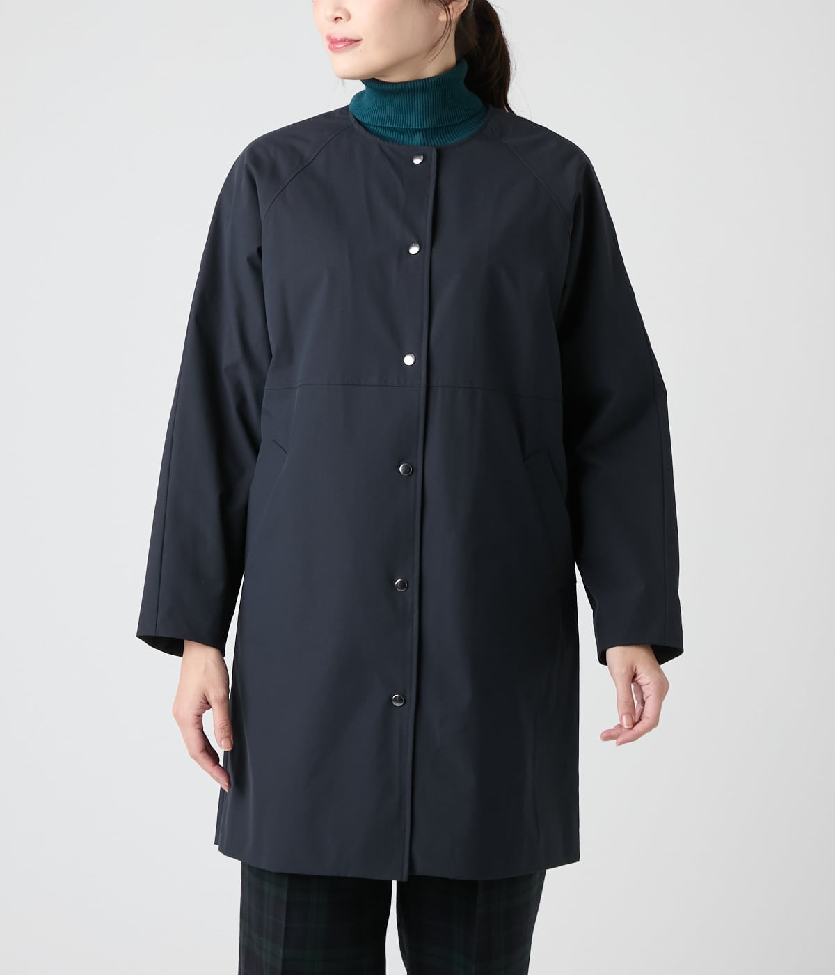 デザイン性がありながら、幅広いシーンで着用いただけるノーカラーコート。裏地の一部にダウンを配しているため、厚手のニットを重ねても着ぶくれしづらくすっきり着こなせます。カラーは汎用性の高いベージュとネイビー2色展開。