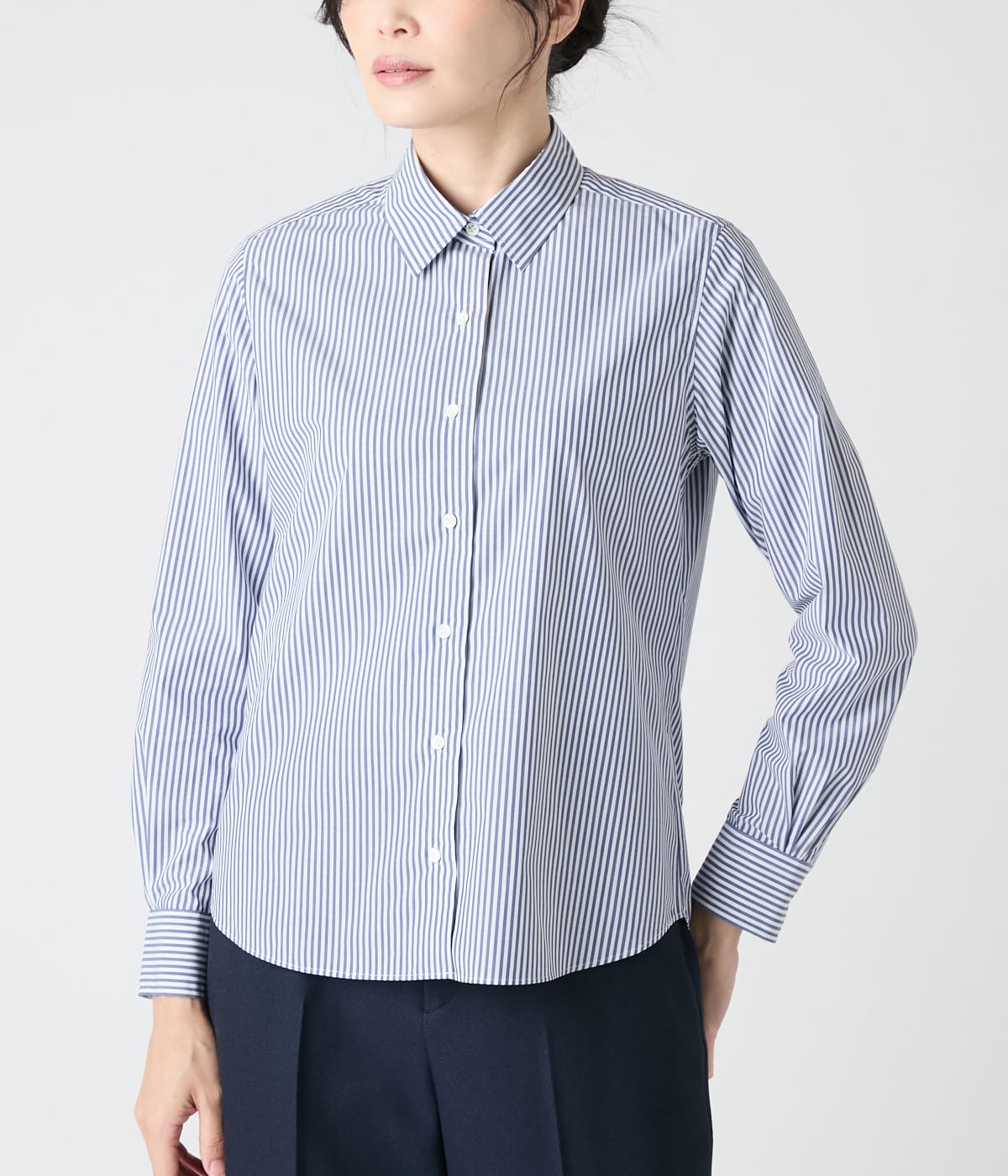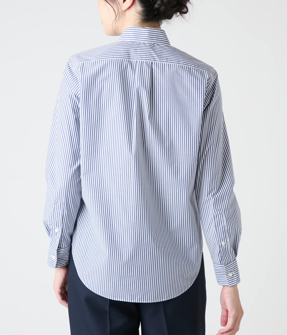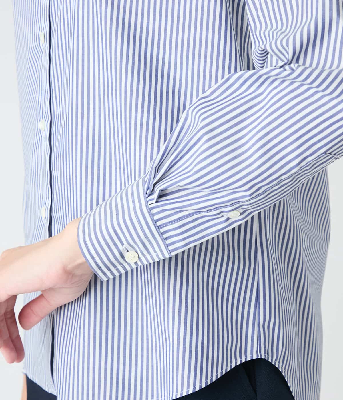 定番ストライプがスタイリッシュな印象の長袖シャツ。1枚着としてはもちろん、羽織りとしても楽しめ、オンオフ問わず着用いただけるアイテムです。ベーシックで着回しやすいロンドンストライプをネイビーカラーで仕上げました。