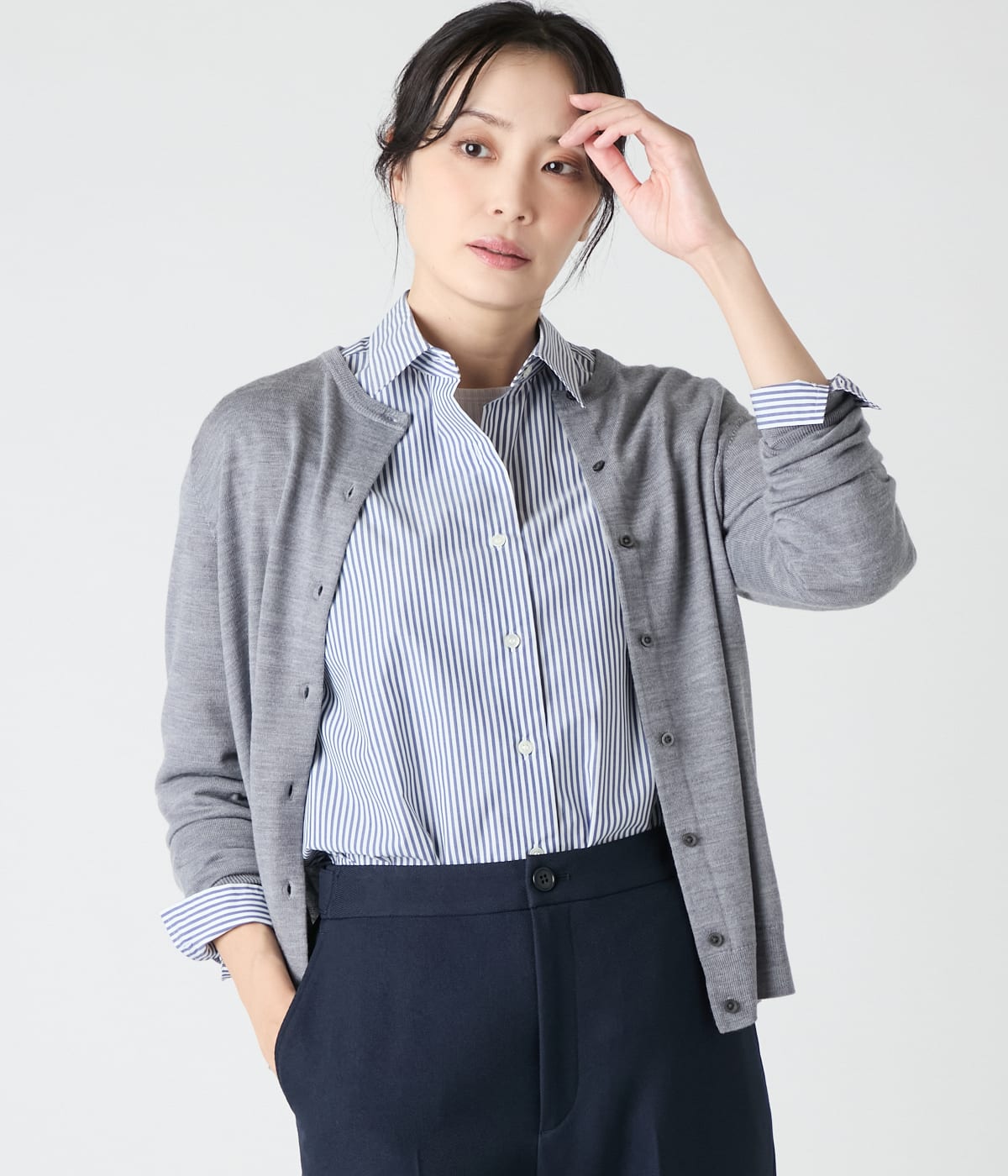 程良いゆとりを備えながら、ボディラインを美しく演出するハンサムフィットシルエット。前身頃はすっきり、後ろ身頃はゆったりとした仕立てが特徴です。裾に前後差をつけラウンドさせることで抜け感のある印象に。また、ヨーク部分の柄を横向きに切り替え、さりげないアクセントをプラスしました。