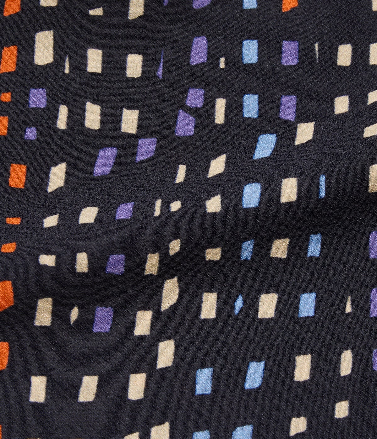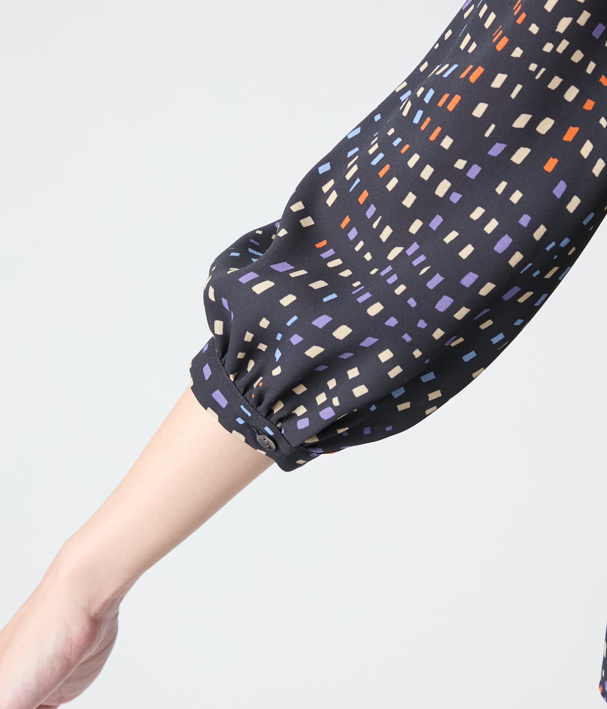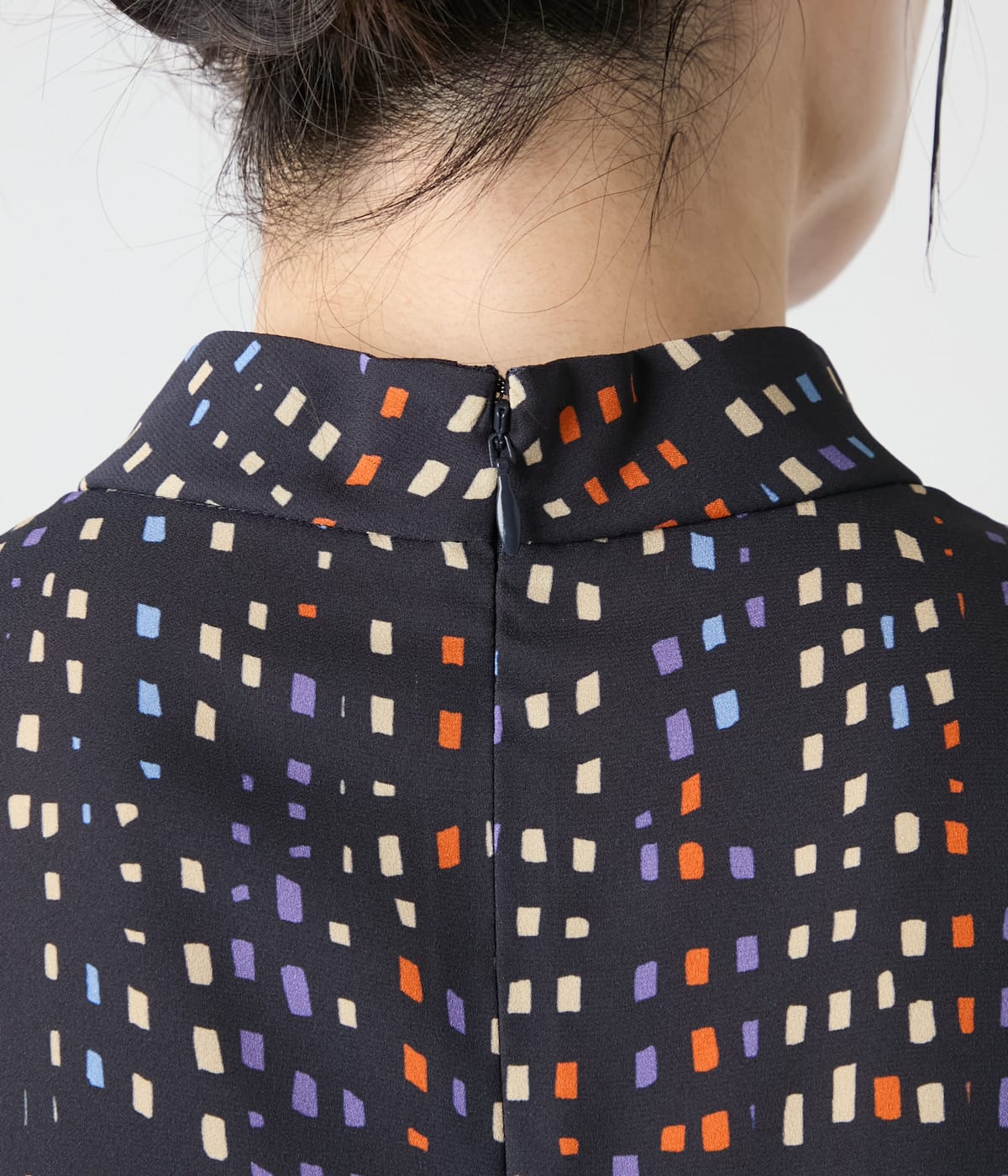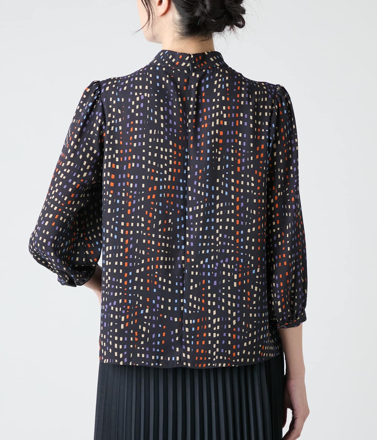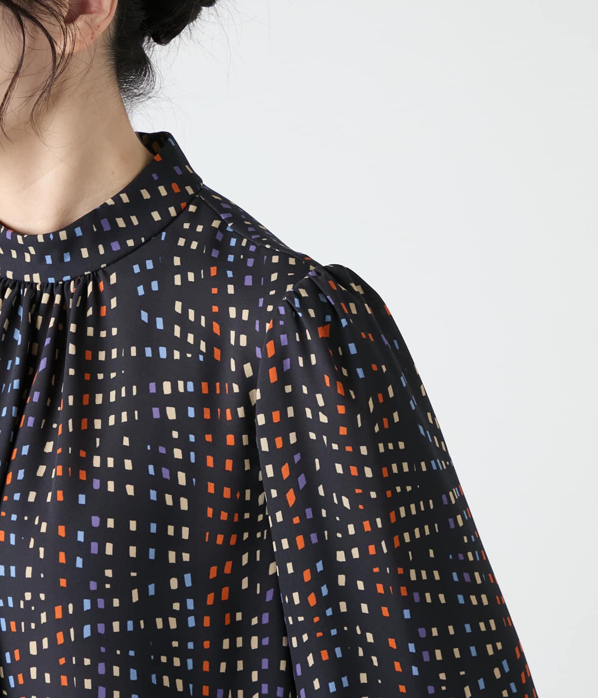 多色使いの繊細なプリントが目を惹くハイネックギャザーブラウス。ニューヨークビル群の窓に反射する光の夜景を思わせる特別感のある1着です。シンプルなボトムと合わせるだけでスタイリングが華やぎ、コーディネートの主役に。コーディネート次第でオフィスシーンからお食事シーンまで幅広く活躍するアイテムです。